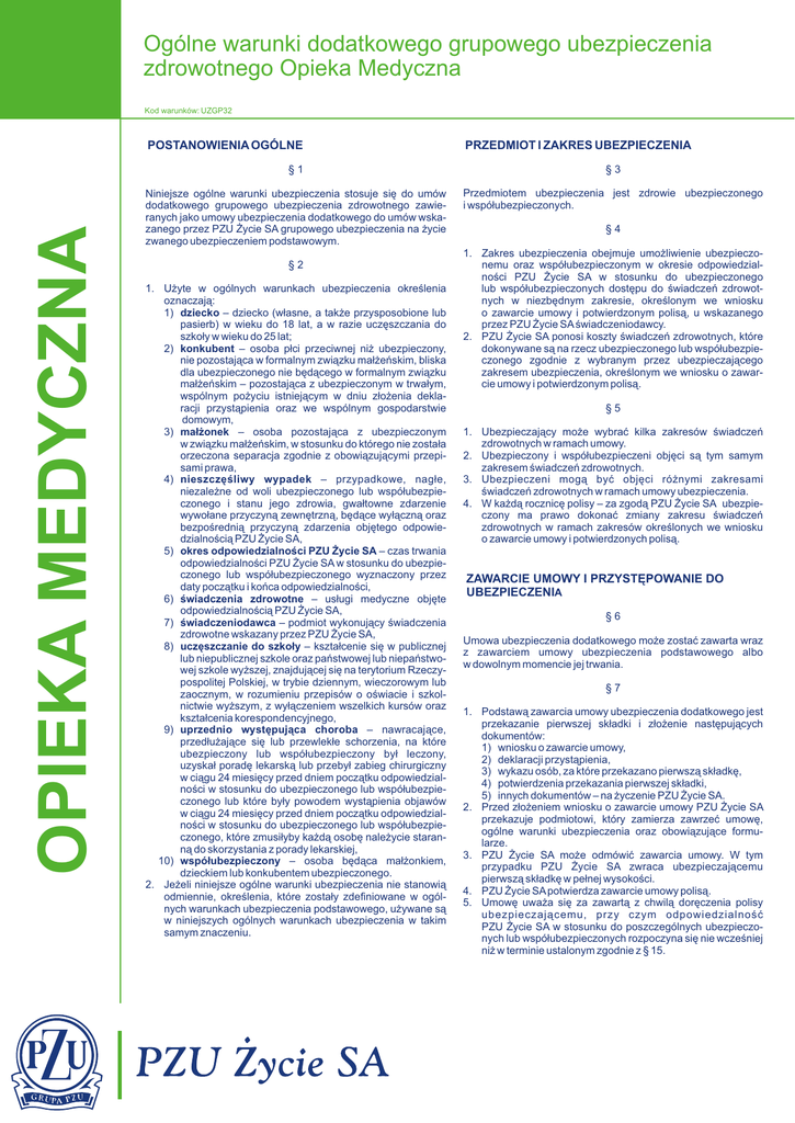 Ogólne warunki dodatkowego grupowego ubezpieczenia zdrowotnego Opieka Medyczna Kod warunków: UZGP32 OPIEKA MEDYCZNA POSTANOWIENIA OGÓLNE PRZEDMIOT I ZAKRES UBEZPIECZENIA §1 §3 Niniejsze ogólne warunki ubezpieczenia stosuje się do umów dodatkowego grupowego ubezpieczenia zdrowotnego zawieranych jako umowy ubezpieczenia dodatkowego do umów wskazanego przez PZU Życie SA grupowego ubezpieczenia na życie zwanego ubezpieczeniem podstawowym. Przedmiotem ubezpieczenia jest zdrowie ubezpieczonego i współubezpieczonych. §2 1. Użyte w ogólnych warunkach ubezpieczenia określenia oznaczają: 1) dziecko – dziecko (własne, a także przysposobione lub pasierb) w wieku do 18 lat, a w razie uczęszczania do szkoły w wieku do 25 lat; 2) konkubent – osoba płci przeciwnej niż ubezpieczony, nie pozostająca w formalnym związku małżeńskim, bliska dla ubezpieczonego nie będącego w formalnym związku małżeńskim – pozostająca z ubezpieczonym w trwałym, wspólnym pożyciu istniejącym w dniu złożenia deklaracji przystąpienia oraz we wspólnym gospodarstwie domowym, 3) małżonek – osoba pozostająca z ubezpieczonym w związku małżeńskim, w stosunku do którego nie została orzeczona separacja zgodnie z obowiązującymi przepisami prawa, 4) nieszczęśliwy wypadek – przypadkowe, nagłe, niezależne od woli ubezpieczonego lub współubezpieczonego i stanu jego zdrowia, gwałtowne zdarzenie wywołane przyczyną zewnętrzną, będące wyłączną oraz bezpośrednią przyczyną zdarzenia objętego odpowiedzialnością PZU Życie SA, 5) okres odpowiedzialności PZU Życie SA – czas trwania odpowiedzialności PZU Życie SA w stosunku do ubezpieczonego lub współubezpieczonego wyznaczony przez daty początku i końca odpowiedzialności, 6) świadczenia zdrowotne – usługi medyczne objęte odpowiedzialnością PZU Życie SA, 7) świadczeniodawca – podmiot wykonujący świadczenia zdrowotne wskazany przez PZU Życie SA, 8) uczęszczanie do szkoły – kształcenie się w publicznej lub niepublicznej szkole oraz państwowej lub niepaństwowej szkole wyższej, znajdującej się na terytorium Rzeczypospolitej Polskiej, w trybie dziennym, wieczorowym lub zaocznym, w rozumieniu przepisów o oświacie i szkolnictwie wyższym, z wyłączeniem wszelkich kursów oraz kształcenia korespondencyjnego, 9) uprzednio występująca choroba – nawracające, przedłużające się lub przewlekłe schorzenia, na które ubezpieczony lub współubezpieczony był leczony, uzyskał poradę lekarską lub przebył zabieg chirurgiczny w ciągu 24 miesięcy przed dniem początku odpowiedzialności w stosunku do ubezpieczonego lub współubezpieczonego lub które były powodem wystąpienia objawów w ciągu 24 miesięcy przed dniem początku odpowiedzialności w stosunku do ubezpieczonego lub współubezpieczonego, które zmusiłyby każdą osobę należycie staranną do skorzystania z porady lekarskiej, 10) współubezpieczony – osoba będąca małżonkiem, dzieckiem lub konkubentem ubezpieczonego. 2. Jeżeli niniejsze ogólne warunki ubezpieczenia nie stanowią odmiennie, określenia, które zostały zdefiniowane w ogólnych warunkach ubezpieczenia podstawowego, używane są w niniejszych ogólnych warunkach ubezpieczenia w takim samym znaczeniu. §4 1. Zakres ubezpieczenia obejmuje umożliwienie ubezpieczonemu oraz współubezpieczonym w okresie odpowiedzialności PZU Życie SA w stosunku do ubezpieczonego lub współubezpieczonych dostępu do świadczeń zdrowotnych w niezbędnym zakresie, określonym we wniosku o zawarcie umowy i potwierdzonym polisą, u wskazanego przez PZU Życie SA świadczeniodawcy. 2. PZU Życie SA ponosi koszty świadczeń zdrowotnych, które dokonywane są na rzecz ubezpieczonego lub współubezpieczonego zgodnie z wybranym przez ubezpieczającego zakresem ubezpieczenia, określonym we wniosku o zawarcie umowy i potwierdzonym polisą. §5 1. Ubezpieczający może wybrać kilka zakresów świadczeń zdrowotnych w ramach umowy. 2. Ubezpieczony i współubezpieczeni objęci są tym samym zakresem świadczeń zdrowotnych. 3. Ubezpieczeni mogą być objęci różnymi zakresami świadczeń zdrowotnych w ramach umowy ubezpieczenia. 4. W każdą rocznicę polisy – za zgodą PZU Życie SA ubezpieczony ma prawo dokonać zmiany zakresu świadczeń zdrowotnych w ramach zakresów określonych we wniosku o zawarcie umowy i potwierdzonych polisą. ZAWARCIE UMOWY I PRZYSTĘPOWANIE DO UBEZPIECZENIA §6 Umowa ubezpieczenia dodatkowego może zostać zawarta wraz z zawarciem umowy ubezpieczenia podstawowego albo w dowolnym momencie jej trwania. §7 1. Podstawą zawarcia umowy ubezpieczenia dodatkowego jest przekazanie pierwszej składki i złożenie następujących dokumentów: 1) wniosku o zawarcie umowy, 2) deklaracji przystąpienia, 3) wykazu osób, za które przekazano pierwszą składkę, 4) potwierdzenia przekazania pierwszej składki, 5) innych dokumentów – na życzenie PZU Życie SA. 2. Przed złożeniem wniosku o zawarcie umowy PZU Życie SA przekazuje podmiotowi, który zamierza zawrzeć umowę, ogólne warunki ubezpieczenia oraz obowiązujące formularze. 3. PZU Życie SA może odmówić zawarcia umowy. W tym przypadku PZU Życie SA zwraca ubezpieczającemu pierwszą składkę w pełnej wysokości. 4. PZU Życie SA potwierdza zawarcie umowy polisą. 5. Umowę uważa się za zawartą z chwilą doręczenia polisy ubezpieczającemu, przy czym odpowiedzialność PZU Życie SA w stosunku do poszczególnych ubezpieczonych lub współubezpieczonych rozpoczyna się nie wcześniej niż w terminie ustalonym zgodnie z § 15. §8 1. Do ubezpieczenia mogą przystąpić ubezpieczeni objęci ubezpieczeniem podstawowym, którzy w dniu złożenia deklaracji przystąpienia nie ukończyli 64. roku życia. 2. Osoba przystępująca do ubezpieczenia składa deklarację przystąpienia. 3. W przypadku rezygnacji ubezpieczonego z ubezpieczenia dodatkowego, może on ponownie przystąpić do ubez