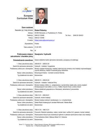 Europass Curriculum Vitae Dane osobowe Nazwisko (a) / Imię (imiona) Adres(y) Robert Robotny 00-950 Warszawa, ul. Przykładowa 2/1, Polska Telefon(y) 0048 22 123456 Faks(y) 0048 22 123456 E-mail(e) Obywatelstwo Data urodzenia Płeć Tel. Kom.: 0048 501 654321 [email protected] Polskie 01.05.1970 M Preferowane miejsce Szwajcaria / hydraulik zatrudnienia / charakter pracy Doświadczenie zawodowe Opisać oddzielnie każde zajmowane stanowisko, począwszy od ostatniego. 1. Okres zatrudnienia (daty) Zawód lub zajmowane stanowisko Podstawowy zakres prac i obowiązków 2006.06.01 – 2008.03.30 Hydraulik – instalator / brygadzista Montaż urządzeń klimatyzacji, instalacji ziębniczej oraz armatury oraz instalacji rozprowadzającej czynnik chłodniczy. Nadzór 6 osobowej grupy robotników. Nazwa i adres pracodawcy Klima-Export Kraków – kontrakt na terenie Niemiec. Typ działalności lub sektor Budownictwo 2. Okres zatrudnienia (daty) Zawód lub zajmowane stanowisko Podstawowy zakres prac i obowiązków 2000.09.15 – 2006.05.30 Hydraulik – instalator / właściciel firmy Montaż instalacji, kotłów c.o., podgrzewaczy i wymienników ciepłej wody, serwis urządzeń klimatyzacyjnych oraz kotłów c.o./c.w.u. Vaillant, Saunier Duval, Junkers, Bosch Nazwa i adres pracodawcy Własna działalność gospodarcza w Warszawie, zatrudnienie 2 pracowników Typ działalności lub sektor Budownictwo 3. Okres zatrudnienia (daty) Zawód lub zajmowane stanowisko Podstawowy zakres prac i obowiązków 1994.12.01 – 2000.09.01 Hydraulik, monter instalacji Montaż instalacji wodnych, kanalizacyjny i c.o. w budownictwie Nazwa i adres pracodawcy Zakład Robót Instalacyjnych Jarosław Malinowski / Bielsko-Biała Typ działalności lub sektor Budownictwo 4. Okres zatrudnienia (daty) Zawód lub zajmowane stanowisko Podstawowy zakres prac i obowiązków 1990.10.16 – 1994.10.31 Pomocnik, Robotnik budowlany, malarz, monter ścian i sufitów G-K, spawacz, monter instalacji Wykonywanie różnych prac budowlanych głównie w zakresie wykończenia wnętrz oraz instalacji Nazwa i adres pracodawcy Firma budowlana Adam i Mateusz Bober S.C. Katowice Typ działalności lub sektor Budownictwo Strona 1/ 2 - Curriculum Vitae Nazwisko Imię Więcej informacji o Europass: http://europass.cedefop.europa.eu © Wspólnoty Europejskie, 2003 20060628 Wykształcenie i odbyte szkolenia Daty 1985 – 1990 Nazwa / tytuł uzyskanych kwalifikacji Mechanik -Technik urządzeń i aparatury wysokociśnieniowej Podstawowe dziedziny kształcenia / nabyte umiejętności zawodowe Eksploatacja maszyn i urządzeń wysokociśnieniowych i kotłowych, umiejętność wykonywania obliczeń cieplnych i mechanicznych, obróbka cieplna, spawanie, obróbka mechaniczna Nazwa i typ instytucji edukacyjnej / szkoleniowej Poziom w klasyfikacji krajowej lub międzynarodowej Technikum Mechaniczno-Energetyczne w Katowicach Technik Umiejętności i kompetencje Język(i) ojczysty(e) Polski Inne języki Samoocena umiejętności językowych Rozumienie Mówienie Pisanie Słuchanie Czytanie Porozumiewanie się Samodzielne wypowiadanie się Niemiecki 3 2 3 2 2 Angielski 1 2 1 1 0 Rosyjski 3 1 2 1 1 (*) 0=wcale, 1-słabo, 2=komunikatywnie, 3=dobrze, 4=biegle Umiejętności kompetencje społeczne Łatwe nawiązywanie kontaktów, szybkie adaptowanie się w nowym środowisku, chętne podejmowanie się roli Umiejętności i kompetencje organizacyjne Umiejętność kierowania zespołem robotników, rozdzielenia zadań, kontrola jakości Umiejętności i kompetencje techniczne Czytania planów budowlanych, instalacyjnych, mechanicznych, obróbka skrawaniem, spawanie elektryczne i gazowe, lutowanie, klejenie i spawanie tworzyw sztucznych strumieniem gorącego powietrza, malowanie natryskowe, wykonywanie różnych prac instalacyjnych i ogólnobudowlanych Umiejętności i kompetencje w zakresie obsługi komputera Umiejętności i kompetencje artystyczne Inne umiejętności i kompetencje Prawo jazdy MS Office, trochę AUTO-CAD i program do kosztorysowania Norma Gra na gitarze i gitarze basowej Patent żeglarski B, C Informacje dodatkowe Aktualnie przebywam jako woluntariusz w Mozambiku na 3-miesięcznym wyjeździe zorganizowanym przez międzynarodową organizację zajmującą się praktyczną edukacją w zakresie budownictwa ekologicznego w krajach rozwijających się. Jestem zainteresowany nową pracą od lipca 2008. Hobby, zainteresowanie Fotografia, żeglarstwo Załączniki Dyplom technika, zaświadczenie z kursu obsługi maszyn ziębniczych. Strona 2/ 2 - Curriculum Vitae Nazwisko Imię Więcej informacji o Europass: http://europass.cedefop.europa.eu © Wspólnoty Europejskie, 2003 20060628