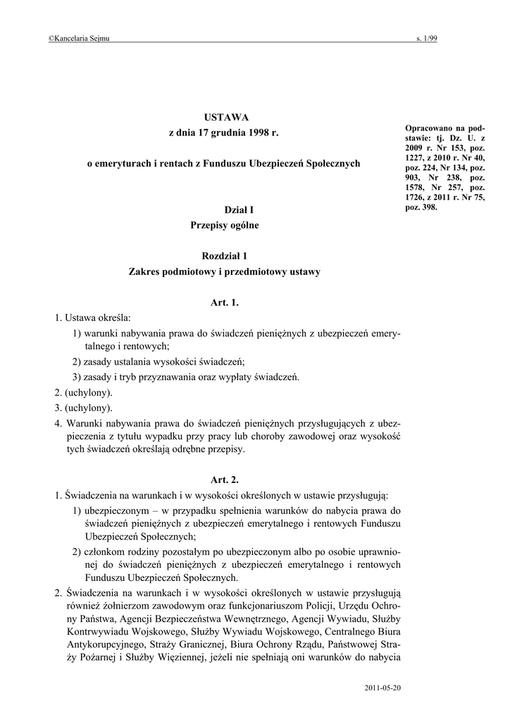 USTAWA z dnia 17 grudnia 1998 r. o emeryturach i rentach z