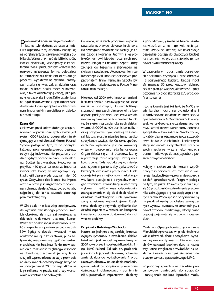 MARKETING P roblematyka dealerskiego marketingu jest na tyle złożona, że przynajmniej kilka aspektów z tej dziedziny nadaje się na odrębny artykuł czy nawet większą publikację. Warto przyjrzeć się bliżej choćby kwestii dealerskiej współpracy z importerami. Wielu producentów wybrało stosunkowo najprostszą formę, polegającą na refundowaniu dealerom określonego procentu wydatków na reklamę. Zazwyczaj ustala się więc zakres działań oraz media, w które dealer może zainwestować, a także orientacyjną kwotę, jaką planuje wydać w skali roku. Takie ustalenia są na ogół dokonywane z opiekunem sieci dealerskiej lub ze specjalnie wydelegowanym importerskim specjalistą w dziedzinie marketingu. Kazus GM Ciekawym przykładem dobrego zorganizowania wsparcia lokalnych działań jest system COOP (od ang. cooperation) funkcjonujący w sieci General Motors Poland. System polega na tym, że na początku każdego roku kalendarzowego dealerzy otrzymują indywidualnie przyznany budżet będący pochodną planu dealerskiego. Budżet jest wyrażony kwotowo, na przykład - 50 tys. zł oznacza, że importer zwróci taką kwotę w miesięcznych cyklach, jeśli dealer wyda przynajmniej 100 tys. zł. Oczywiście dobór mediów, imprez oraz eventów jest uzgadniany z opiekunem danego dealera. Wszystko po to, aby najpóźniej do końca stycznia zamknąć plan marketingowy. W GM dealer nie jest więc zobligowany do wydania określonego procentu swoich obrotów, ale musi zainwestować w działania reklamowe ustaloną kwotę. Warto też podkreślić, iż dealer może ustalić z importerem poziom swoich wydatków. Będąc w okresie inwestycji, może wydawać mniej, z kolei stawiając na aktywność, ma prawo wystąpić do centrali o zwiększenie budżetu. Takie rozwiązanie daje możliwość większego wsparcia na określone, czasowe akcje. Przykładowo, jeśli wprowadzona zostaje promocja na dany model, dealerzy mogą liczyć na refundację nawet 70 proc. wydatków na jego reklamę w prasie, radiu czy wystawach w centrach handlowych. Co więcej, w ramach programu wsparcia powstają naprawdę ciekawe inicjatywy. Na szczególne wyróżnienie zasługuje firma Szpot z Poznania. Jednym z jej projektów jest cykl biegów rodzinnych pod nazwą „Biegaj z Chevrolet Szpot”, który zachęca do biegania i aktywności na świeżym powietrzu. Ukoronowaniem całorocznego cyklu imprez sportowych pod patronatem firmy Ireneusza Szpota był sponsoring największego w Polsce Maratonu Poznańskiego. Niestety, od 2009 roku importer zmienił kierunek działań, nastawiając się na udział marki w masowych, ludowo-folklorystycznych imprezach plenerowych, a kreatywne podejście wielu dealerów zostało mocno wyhamowane. Nie zmienia to faktu, że system wsparcia lokalnych działań w ramach COOP należy ocenić jak najbardziej pozytywnie. Tym bardziej, że General Motors stosuje również inne, rzadko spotykane rozwiązanie. Co roku, spośród dealerów wybierana jest na konwencji w tajnym głosowaniu rada franczyzowa. Organ składa się z 4-5 dealerów, którzy reprezentują różne regiony i różnej wielkości stacje. Rada spotyka się co miesiąc z zarządem importera, aby dyskutować o bieżących kwestiach i problemach. Funkcjonuje też przy niej komisja marketingowa, która pracuje nad optymalnym zorganizowaniem komunikacji reklamowej, wyborem mediów oraz odpowiednim zaangażowaniem się sieci dealerskiej w działania marketingowe i ich synchronizację z reklamą ogólnokrajową. Dzięki temu, dealerzy otrzymują cyklicznie plan działań importera w rozbiciu na kampanię i media, co pozwala dostosować do nich własne projekty. Przykład z Dalekiego Wschodu Natomiast jednym z najbardziej innowacyjnych systemów prowadzenia działań lokalnych jest model wprowadzony w 2009 roku przez importera Mitsubishi, firmę MMC Poland. Zakłada on, podobnie jak u innych japońskich marek, zobowiązanie dealera do wydatkowania 1 proc. rocznych obrotów na działania marketingowe. Jednak po podpisaniu planu sprzedażowego i reklamowego - odmiennie niż u pozostałych importerów - dealerzy z góry otrzymują środki na ten cel. Warto zauważyć, że są to naprawdę niebagatelne kwoty, bo średniej wielkości stacje dealerskie dostają do dyspozycji budżet na poziomie 150 tys. zł, a najwięksi gracze nawet dwukrotność tej kwoty. W uzgadnianym obustronnie planie dealer deklaruje, czy wyda 1 proc. obrotów i z otrzymanego budżetu będzie mógł sfinansować 50 proc. kosztów reklamy, czy też planuje większą aktywność i, przy poziomie 1,5 proc. skorzysta z 70 proc. dofinansowania. Istotną kwestią jest też fakt, że MMC stawia bardzo mocno na profesjonalne i skoordynowane działania w internecie, w tym zwłaszcza w AdWords oraz SEO w wyszukiwarce Google, a w dziale marketingu MMC został nawet zatrudniony odrębny specjalista w tym zakresie. Warto dodać, iż każdy dealer otrzymuje także szczegółowe badanie słuchalności konkretnych stacji radiowych i czytelnictwa prasy w swoim regionie wraz z rekomendacją domu mediowego dotyczącą doboru poszczególnych nośników. Kolejnym ciekawym elementem współpracy z importerem jest możliwość skorzystania z budżetu w programie wsparcia działań sprzedażowych. Program polega na tym, że przez 12 miesięcy refinansuje się 50 proc. kosztów zatrudnienia pracownika zajmującego się realizacją uzgodnionych zadań. W ten sposób pozyskiwane są na przykład osoby do obsługi zewnętrznych wystaw i eventów, telemarketingu, a nawet szefowie marketingu, którzy coraz częściej pojawiają się w stacjach dealerskich. Model współpracy obowiązujący w marce Mitsubishi wprowadza więc dla dealerów wiele ułatwień, choć początkowo wydawał się mocno dyskusyjny. Dla wielu dealerów oznaczał bowiem dwu- a nawet trzykrotne zwiększenie wydatków na reklamę. Finalnie przyczynił się jednak do dużego sukcesu sprzedażowego MMC. W podobny sposób - n