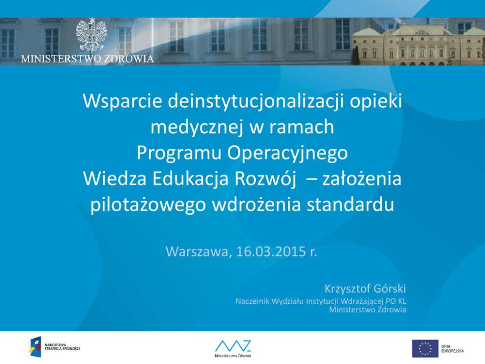 Wsparcie deinstytucjonalizacji opieki medycznej w ramach Programu Operacyjnego Wiedza Edukacja Rozwój – założenia pilotażowego wdrożenia standardu Warszawa, 16.03.2015 r. Krzysztof Górski Naczelnik Wydziału Instytucji Wdrażającej PO KL Ministerstwo Zdrowia Plan prezentacji 1. Deinstytucjonalizacja w świetle zapisów Wytycznych w zakresie zasad realizacji przedsięwzięć z udziałem środków Europejskiego Funduszu Społecznego w obszarze zdrowia na lata 2014-2020. 2. Standard dziennego domu opieki medycznej – Definicja dziennego domu opieki medycznej; – Cele i zasady funkcjonowania dziennych domów opieki medycznej; – Harmonogram realizacji działań. 3. Obszary problemowe. Deinstytucjonalizacja w świetle Wytycznych PO WER: Działania z zakresu deinstytucjonalizacji opieki nad osobami zależnymi realizowane w ramach PO WER dotyczą opracowania i pilotażowego wdrożenia modeli/standardów zdeinstytucjonalizowanej opieki nad osobami zależnymi. RPO: a) Działania wymagające wcześniejszego pilotażu: – wsparcie działalności istniejących lub utworzenia nowych dziennych domów opieki medycznej oraz innych form opieki nad osobami zależnymi, w tym nad osobami starszymi, w formie działań upowszechniających rozwiązania wypracowane w ramach PO WER – UWAGA: konkursy w ramach RPO w tym obszarze nie mogą być uruchomione przed zakończeniem pilotażu; b) Działania, które nie wymagają wcześniejszego pilotażu: – szkolenia dla opiekunów, w szczególności członków rodzin, w zakresie opieki nad osobami zależnymi, w tym osobami starszymi; – przygotowanie i tworzenie wypożyczalni sprzętu pielęgnacyjnego i wspomagającego, połączone z doradztwem w doborze sprzętu, treningami z zakresu samoobsługi sprzętu oraz przygotowanie warunków do opieki domowej; – wsparcie projektów teleopieki, czyli doradztwa telefonicznego i bezpośredniej pomocy personelu medycznego na wezwanie w szczególnej sytuacji; – szkolenia oraz prowadzenia doradztwa w zakresie dostosowania podmiotów leczniczych do potrzeb osób zależnych w tym osób starszych; – wsparcie zespołów środowiskowych, w szczególności na poziomie podstawowej opieki zdrowotnej. Wytyczne zostaną przekazane przez MIR do konsultacji w II kwartale 2015 r. Definicja • Dzienny dom opieki medycznej (DDOM) nad osobami niesamodzielnymi może być wyodrębnioną strukturalnie częścią placówki podstawowej opieki zdrowotnej, kompleksu szpitalnego, poradni geriatrycznej lub odrębnym podmiotem leczniczym, posiadającym pełne zabezpieczenie do prowadzenia diagnostyki, leczenia i rehabilitacji medycznej osób niesamodzielnych, w szczególności osób starszych (powyżej 65 r.ż. ). • W DDOM jednocześnie będzie mogło przebywać maksymalnie 15 pacjentów. • Personel DDOM będzie mógł prowadzić szkolenia dla członków rodzin w zakresie prawidłowej opieki nad osobą zależną. Cele Główny cel: • Wsparcie deinstytucjonalizacji opieki nad osobami zależnymi, poprzez rozwój alternatywnych form opieki nad osobami niesamodzielnymi, w tym osobami starszymi. Cele pośrednie: • poprawa jakości zarządzania finansowego w ochronie zdrowia, poprzez wdrożenie efektywnych kosztowo rozwiązań w zakresie medycznej opieki pozaszpitalnej; • rozwój nowych form dziennej opieki nad osobami niesamodzielnymi; • poprawa stanu zdrowia osób niesamodzielnych; • zmniejszenie liczby i czasu trwania nieuzasadnionych medycznie hospitalizacji wśród osób niesamodzielnych; • zwiększenie dostępności do niektórych świadczeń opieki zdrowotnej, • rozwój wsparcia opiekunów osób niesamodzielnych (edukacja, wsparcie psychologiczne). Kto będzie mógł korzystać ze wsparcia? • Wsparcie skierowane będzie do osób niesamodzielnych, w szczególności do osób powyżej 65 r.ż., których stan zdrowia nie pozwala na pozostawanie wyłącznie pod opieką podstawowej opieki zdrowotnej i ambulatoryjnej opieki specjalistycznej a jednocześnie nie wymaga całodobowego nadzoru lekarskiego i pielęgniarskiego, realizowanego w trybie stacjonarnym. • Pacjenci w wieku pow. 65 r.ż. będą mieli pierwszeństwo w przyjęciu do ośrodka domu opieki medycznej, a ich udział w ogólnej liczbie osób zakwalifikowanych do pobytu powinien stanowić ¾ łącznej liczby pacjentów. • Z dziennego domu opieki medycznej będą mogły korzystać wyłącznie osoby ubezpieczone Kryteria wyłączenia • Osoby korzystające ze świadczeń opieki zdrowotnej z zakresu opieki długoterminowej, opieki paliatywnej i hospicyjnej oraz rehabilitacji leczniczej, w warunkach ośrodka lub oddziału dziennego oraz w warunkach stacjonarnych. • Osoby, dla których podstawowym wskazaniem do objęcia ich opieką jest zaawansowana choroba psychiczna lub uzależnienie. • Osoby chore psychicznie, których choroba związana jest z zaburzeniami psychotycznymi lub świadomości. • Osoby uzależnione od niektórych – alkoholu oraz narkotyków o przeciwdziałaniu narkomanii. substancji psychoaktywnych w rozumieniu Ustawy Tryb kwalifikowania do pobytu w DDOM • Pacjenci po przebytej hospitalizacji, których stan zdrowia wymaga bardziej zintensyfikowanej opieki, w celu poprawy stanu zdrowia oraz przeciwdziałania postępującej niesamodzielności. • Pacjenci pozostający pod opieką podstawowej opieki zdrowotnej, którym w okresie ostatnich 12 miesięcy udzielone zostały świadczenia zdrowotne z zakresu leczenia szpitalnego i u których nastąpiło nagłe pogorszenie się stanu funkcjonalnego, z dużym ryzykiem kolejnej hospitalizacji. Tryb kwalifikowania do pobytu w DDOM • Świadczenia w dziennym domu opieki medycznej udzielane są pacjentom wymagającym ze względu na stan zdrowia świadczeń pielęgnacyjnych, opiekuńczych i rehabilitacyjnych oraz kontynuacji leczenia, a nie wymagającym hospitalizacji w oddziale szpitalnym, którzy w ocenie skalą poziomu samodzielności (Skala Barthel) otrzymali 21-85 punktów (stan pacjenta „śre