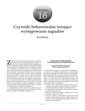 ROZDZIAŁ 16 Czynniki behawioralne torujące występowanie napadów Hiroo Matsuoka Z achowanie jest manifestacją aktywności umysłowej. Jednak pozostaje niewyjaśnione, jak duży wpływ wywiera ona na różne rodzaje padaczek i napadów, ponieważ standardowe badania elektoencefalograficzne (EEG) dotyczą wyłącznie snu, hiperwentylacji, stymulacji światłem oraz otwierania i zamykania oczu, a nie usystematyzowanych zadań umysłowych. W piśmiennictwie można znaleźć opisy padaczek odruchowych indukowanych czynnościami dnia codziennego, takimi jak ruch, stukanie (tapping), mycie zębów, jedzenie, kąpiel, czytanie, śpiewanie, liczenie, mówienie, pisanie, rysowanie, granie w gry oraz myślenie, ale bodźce spustowe tego typu są wyjątkowo rzadko spotykane. I tak na przykład, mimo że każdemu standardowemu badaniu EEG przeprowadzanemu w Mayo Clinic w Stanach Zjednoczonych towarzyszą zadania polegające na wykonywaniu w umyśle działań arytmetycznych, tylko u 1 pacjenta na 100 000 zapisów wystąpił efekt indukcji (1). Z drugiej strony, jak już wspomniano, różnorodne czynności dnia codziennego mogą torować lub hamować występowanie napadów u pacjentów z padaczką (2). PADACZKA ODRUCHOWA INDUKOWANA ZACHOWANIAMI Specjalne metody aktywacji EEG („Rutynowe NPA”) W celu określenia stopnia, w jakim aktywność behawioralna wpływa na wyładowania padaczkowe, opracowaliśmy specjalny protokół aktywacji EEG, nazwany neuropsychologiczną aktywacją EEG (neuropsychological activation EEG – NPA) i zawierający zadania testujące różną aktywność umysłową (3-5). „Rutynowe NPA” obejmowało czytanie ciche i głośne, mówienie, liczenie w umyśle, liczenie na piśmie, pisanie i konstrukcje przestrzenne. Szczegółowy opis rodzaju zadań zamieszczony został poniżej. 1. Czytanie ciche: osoba badana czyta po cichu trzy, zaczerpnięte z japońskiej wersji testu Bineta i wydrukowane na kawałku papieru, zdania w języku japońskim. 2. Czytanie głośne: osoba badana czyta na głos te same zdania, które czytała po cichu. 3. Mówienie: osoba badana opisuje z pamięci to, co czytała wcześniej i na głos, i po cichu. 4. Liczenie w pamięci: osoba badana wypowiada na głos wyniki czterech wykonywanych w umyśle, działań arytmetycznych. Jeśli działania były dla niej zbyt trudne, proponowano wersje prostsze. — 130 — Rozdział 16 • Czynniki behawioralne torujące występowanie napadów TABELA 16.1. Protokół rutynowej aktywacji neuropsychologicznej w badaniach EEG. (1) Czytanie ciche Ostatniej nocy, około 22.00, w tokijskiej dzielnicy Asakusa wybuchł pożar. Ogień wymknął się spod kontroli i strawił 17 budynków. Kiedy strażak uratował dziewczynkę, która spała głęboko na drugim piętrze, miała już poparzoną twarz. (2) Czytanie głośne [zdania z pozycji (1)] (3) Mówienie [zdania z pozycji (1)] (4) Liczenie w pamięci 18 – 7, 23 + 48, 11 x 11, 125 ÷ 5 (5) Liczenie na piśmie 15 x 67 x 23 x 48 (6) Pisanie Na szczycie góry rośnie rozłożyste drzewo. Słońce wstaje od wschodu. 4 pory roku 4 punkty Marszałek Sejmu (7) Konstrukcje przestrzenne Rysowanie figur Test Układania Klocków 5. Liczenie na piśmie: Osoba badana rozwiązuje jedno działanie arytmetyczne na kartce. 6. Pisanie: Osoba badana jest proszona o napisanie dwóch zdań japońskich przy użyciu fonogramów (kana) i trzech japońskich zwrotów przy użyciu ideogramów (kanji). 7. Konstrukcje przestrzenne: Osoba badana jest proszona o narysowanie ryby, twarzy ludzkiej i zegara oraz o ułożenie z 9 klocków wzorów z Testu Układania Klocków należącego do Skali Inteligencji Wechslera dla Dorosłych w wersji zrewidowanej (Wechsler Adult Intelligence Scale-Revised – WAIS-R) (patrz tab. 16.1). Realizacja rutynowego NPA zajmowała pacjentom około 10-20 minut. W celu detekcji napadów mioklonicznych stosowano powierzchniowy elektromiogram. Wykonanie rutynowego i szczegółowego NPA było monitorowane wideoEEG. Wpływ zachowania na wyładowania padaczkowe Przebadaliśmy, po wcześniejszym wyrażeniu przez nich zgody na udział w badaniu, 480 pacjentów z padaczką (247 mężczyzn i 233 kobiety) (5, 6). Wszyscy, poza 18 pacjentami, stosowali leki przeciwpadaczkowe (antiepileptic drugs – AED), 25 otrzymywało również neuroleptyki z powodu zaburzeń psychiatrycznych. Średnia wieku wynosiła 26,3 ± 10,8 roku (w przedziale od 1. do 59. r.ż.). Szczegóły związane z kryteriami doboru do grupy oraz kryteria klasyfi kacji padaczki i zespołów padaczkowych zostały zamieszczone w innym miejscu (5). W celu wykluczenia kontaminacji związanych z występowaniem incydentalnych wyładowań niezwiązanych z aktywacją, na podstawie EEG w stanie relaksacji (obejmującym również otwieranie i zamykanie oczu), znanym jako EEG w stanie czuwania, dokonaliśmy oceny efektu oddziaływania NPA. Jeśli w EEG w stanie czuwania nie występowały wyładowania, „efekt prowokacji przez NPA” oznaczał, że jedno lub więcej zadań indukowało wyładowania napadowe, powtarzalne w kolejnych próbach. Brak wyładowań w stanie czuwania i w warunkach NPA był oceniany jako „brak efektu prowokacji przez NPA”. Jeśli w EEG w stanie czuwania występowały wyładowania napadowe, wyniki aktywacji szacowano w następujący sposób. Liczba wyładowań w trakcie zapisu EEG (liczba na minutę) dla każdego zadania indukującego napady dzielona przez częstość wyładowań (liczba na minutę) dla stanu czuwania. Wstępnie przyjęliśmy, że wynik powyżej 2,0 świadczy o „efekcie prowokowania przez NPA”, poniżej 0,5 – o „efekcie hamowania przez NPA”, natomiast wynik plasujący się pomiędzy 0,5 a 2,0 – „o braku efektu NPA”. NPA wywołała efekt hamowania u 133 (63,9%) z 208 pacjentów z napadami w trakcie EEG w stanie czuwania. Z drugiej strony prowokujący efekt zadań NPA był obserwowany ogółem u 38 (7,9%) z 480 pacjentów, w tym u 18 bez napadów i 20 z napadami w stanie cz