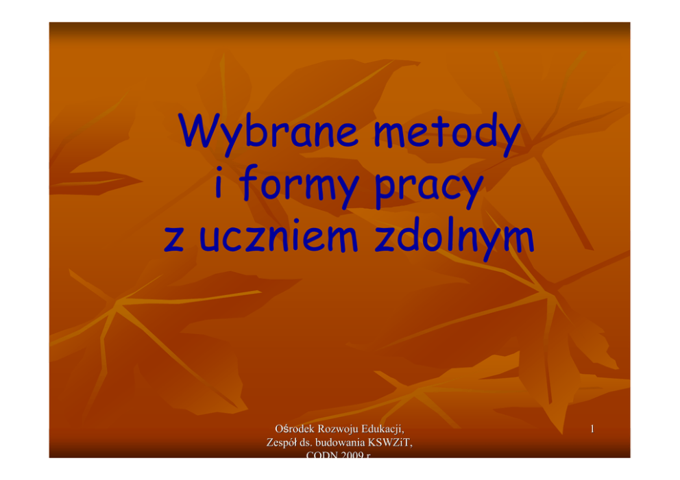 Wybrane metody i formy pracy z uczniem zdolnym Ośrodek Rozwoju Edukacji, Zespó Zespół ds. budowania KSWZiT, CODN 2009 r. 1 Proponowane formy pracy począwszy od klas i szkół dla uzdolnionych, poprzez specjalne programy i indywidualny tok pracy, do wielopoziomowego nauczania w typowych zespołach klasowych Ośrodek Rozwoju Edukacji, Zespó Zespół ds. budowania KSWZiT, CODN 2009 r. 2 Formy pracy organizacyjnej: 1. Wzbogacanie Polega na przystosowaniu nauczania do moŜliwości intelektualnych ucznia. Zwiększamy intensywność jego pracy, poszerzamy zakres wiedzy (wzbogacanie pionowe), dostarczamy w trakcie nauki większej liczby zadań o tym samym poziomie trudności (wzbogacanie poziome). Ośrodek Rozwoju Edukacji, Zespó Zespół ds. budowania KSWZiT, CODN 2009 r. 3 2. Akceleracja (przyspieszenie). wcześniejsze rozpoczynanie nauki, podwójna promocja (przeskakiwania klas) szybsze przerabianie materiału system nauczania bezklasowego, wcześniejsze kończenie szkoły i przechodzenie na następny szczebel nauczania. Te formy pracy są odpowiednie dla dzieci dojrzałych emocjonalnie, społecznie i fizycznie Ośrodek Rozwoju Edukacji, Zespó Zespół ds. budowania KSWZiT, CODN 2009 r. 4 3. Grupowanie a) wg Kryterium szkolnych. poziomu IQ oraz poziom zdolności. umiejętności Zajęcia z róŜnych przedmiotów odbywają się równocześnie. KaŜdy nauczyciel prowadzi zajęcia na róŜnym poziomie, a uczniowie wybierają nauczyciela w zaleŜności od umiejętności. Podstawowy zarzut - zbytnie podkreślenie róŜnic indywidualnych oraz zmniejszenie efektywności nauczania w grupach jednorodnych. Ośrodek Rozwoju Edukacji, Zespó Zespół ds. budowania KSWZiT, CODN 2009 r. 5 b) według rodzaju zdolności – grupowanie przedmiotowe Kryterium – stan zaawansowania (wiedzy, zainteresowań i uzdolnień) w zakresie róŜnych przedmiotów dla tworzenia grup w obrębie przedmiotu. Wobec młodszych uczniów grupowanie według poziomu zdolności, a wobec uczniów starszych – grupowanie według rodzaju zdolności. Grupowanie moŜe mieć miejsce na zajęciach lekcyjnych jak i poza lekcjami. Ośrodek Rozwoju Edukacji, 6 Zespó Zespół ds. budowania KSWZiT, CODN 2009 r. c) Specjalne klasy i specjalni nauczyciele. Nauczyciele prowadzą zajęcia z uczniami kilku klas lub szkół. Uczniowie ci część czasu spędzają w typowych klasach, a część – w zespołach tematycznych. d) Ciągi klas na tym samym poziomie nauczania. Skupiają one uczniów o odmiennych poziomach zdolności. Ośrodek Rozwoju Edukacji, Zespó Zespół ds. budowania KSWZiT, CODN 2009 r. 7 e) Odrębne szkoły uzdolnionych dla szczególnie w róŜnych przedmiotach nauczania np.: szkoły średnie o profilu matematycznym lub szkoły dla uczniów uzdolnionych artystycznie (plastyczne, muzyczne itp.). Ośrodek Rozwoju Edukacji, Zespó Zespół ds. budowania KSWZiT, CODN 2009 r. 8 4. Nauka indywidualna organizowanie róŜnych form opieki nad wyróŜniającymi się uczniami w klasie lub szkole, a takŜe podczas zajęć pozalekcyjnych i pozaprogramowych – aŜ do nauki indywidualnej włącznie Ośrodek Rozwoju Edukacji, Zespó Zespół ds. budowania KSWZiT, CODN 2009 r. 9 5. Konsultacje Zadaniem konsultantów jest wskazywanie nauczycielom sposobów pracy z dziećmi o róŜnym poziomie zdolności. 6. Doradztwo Stosowane jest wobec uczniów o szczególnych zdolnościach i specjalnych potrzebach. Nową kompetencją nauczycieli jest tutoring w pracy z uczniami zdolnymi. Ośrodek Rozwoju Edukacji, Zespó Zespół ds. budowania KSWZiT, CODN 2009 r. 10 Ogólne zasady organizacji pracy ucznia zdolnego: utrzymać wysoki poziom stawianych uczniowi zadań i zapewnić sensowność zajmowania się nietypowymi zadaniami, ćwiczeniami, doświadczeniami, badaniami, projektami uczyć obszerniejszego materiału lub nawet innego, stawiać uczniowi indywidualne cele np. udział w projektach międzynarodowych, kursach e-learningowych, konkursach i olimpiadach przedmiotowych, pomoc kolegom w nauce, wolontariat. Uczenie powinno być zbliŜone do procesu badawczego i być dla ucznia wyzwaniem intelektualnym. Ośrodek Rozwoju Edukacji, Zespó Zespół ds. budowania KSWZiT, CODN 2009 r. 11 osiągnięcia (tylko powaŜne) – powinny być docenione dobrze dobraną i uzasadnioną nagrodą, wszystkie pomysły i prace traktować z powagą i Ŝyczliwością.. Wszystkie zasoby intelektualne i materialne szkoły powinny być do dyspozycji uczniów szczególnie zdolnych. Szkoła na co dzień powinna współpracować z rodzicami uczniów zdolnych, aby wspomagać rodziców w rozwijaniu zdolności ucznia. Ośrodek Rozwoju Edukacji, Zespó Zespół ds. budowania KSWZiT, CODN 2009 r. 12 Proponowane metody pracy: metody problemowe, metody kształcące poszukiwanie, porządkowanie i wykorzystanie informacji metody stosowania z róŜnych źródeł, zdobytej wiedzy w praktyce, metody rozwijania zainteresowań, metody skutecznego porozumiewania się w róŜnych sytuacjach, Ośrodek Rozwoju Edukacji, Zespó Zespół ds. budowania KSWZiT, CODN 2009 r. 13 metody prezentowania własnych poglądów, umiejętności argumentacji metody zarządzania swoim potencjałem metody kształcące prawidłowe stosunki interpersonalne, metody aktywizujące, metody pozwalające uczniowi ocenić stan swojej wiedzy. Ośrodek Rozwoju Edukacji, Zespó Zespół ds. budowania KSWZiT, CODN 2009 r. 14 Metody nauczania wykład, pokaz pełniący dwie role: eksponującą i inspirującą, obserwacja - zadaniem ucznia jest analizowanie szczegółowych operacji, opis mający na celu wyzwolenie wyobraźni i zastąpienie omawiania demonstracją, badaniem, pogadanka ucząca samodzielnego i prawidłowego pod względem logicznym myślenia uczniów, sterowanie przez nauczyciela poprzez zadawanie odpowiednich pytań, Ośrodek Rozwoju Edukacji, Zespó Zespół ds. budowania KSWZiT, CODN 2009 r. 15 metoda algorytmiczna, podczas której uczeń drogą samodzielnej analizy dochodzi do potwierdzenia pełnej skuteczności