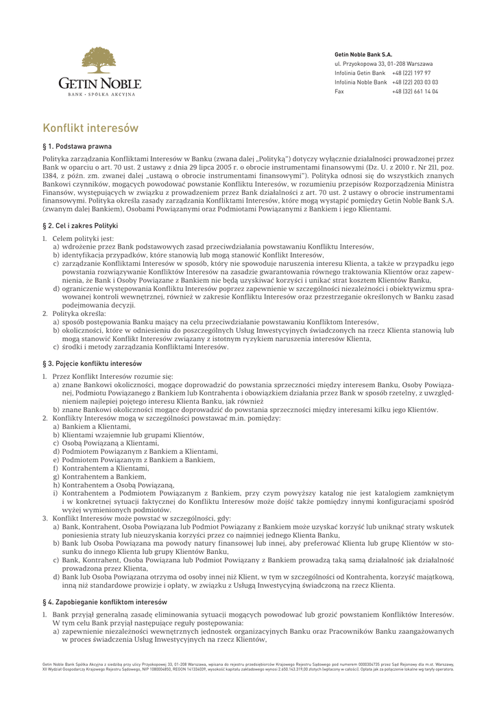 Getin Noble Bank S.A. ul. Przyokopowa 33, 01-208 Warszawa Infolinia Getin Bank +48 (22) 197 97 Infolinia Noble Bank +48 (22) 203 03 03 Fax +48 (32) 661 14 04 Konflikt interesów § 1. Podstawa prawna Polityka zarządzania Konfliktami Interesów w Banku (zwana dalej „Polityką”) dotyczy wyłącznie działalności prowadzonej przez Bank w oparciu o art. 70 ust. 2 ustawy z dnia 29 lipca 2005 r. o obrocie instrumentami finansowymi (Dz. U. z 2010 r. Nr 211, poz. 1384, z późn. zm. zwanej dalej „ustawą o obrocie instrumentami finansowymi”). Polityka odnosi się do wszystkich znanych Bankowi czynników, mogących powodować powstanie Konfliktu Interesów, w rozumieniu przepisów Rozporządzenia Ministra Finansów, występujących w związku z prowadzeniem przez Bank działalności z art. 70 ust. 2 ustawy o obrocie instrumentami finansowymi. Polityka określa zasady zarządzania Konfliktami Interesów, które mogą wystąpić pomiędzy Getin Noble Bank S.A. (zwanym dalej Bankiem), Osobami Powiązanymi oraz Podmiotami Powiązanymi z Bankiem i jego Klientami. § 2. Cel i zakres Polityki 1. Celem polityki jest: a) wdrożenie przez Bank podstawowych zasad przeciwdziałania powstawaniu Konfliktu Interesów, b)identyfikacja przypadków, które stanowią lub mogą stanowić Konflikt Interesów, c) zarządzanie Konfliktami Interesów w sposób, który nie spowoduje naruszenia interesu Klienta, a także w przypadku jego powstania rozwiązywanie Konfliktów Interesów na zasadzie gwarantowania równego traktowania Klientów oraz zapewnienia, że Bank i Osoby Powiązane z Bankiem nie będą uzyskiwać korzyści i unikać strat kosztem Klientów Banku, d)ograniczenie występowania Konfliktu Interesów poprzez zapewnienie w szczególności niezależności i obiektywizmu sprawowanej kontroli wewnętrznej, również w zakresie Konfliktu Interesów oraz przestrzeganie określonych w Banku zasad podejmowania decyzji. 2. Polityka określa: a) sposób postępowania Banku mający na celu przeciwdziałanie powstawaniu Konfliktom Interesów, b)okoliczności, które w odniesieniu do poszczególnych Usług Inwestycyjnych świadczonych na rzecz Klienta stanowią lub mogą stanowić Konflikt Interesów związany z istotnym ryzykiem naruszenia interesów Klienta, c) środki i metody zarządzania Konfliktami Interesów. § 3. Pojęcie konfliktu interesów 1. Przez Konflikt Interesów rozumie się: a) znane Bankowi okoliczności, mogące doprowadzić do powstania sprzeczności między interesem Banku, Osoby Powiązanej, Podmiotu Powiązanego z Bankiem lub Kontrahenta i obowiązkiem działania przez Bank w sposób rzetelny, z uwzględnieniem najlepiej pojętego interesu Klienta Banku, jak również b)znane Bankowi okoliczności mogące doprowadzić do powstania sprzeczności między interesami kilku jego Klientów. 2. Konflikty Interesów mogą w szczególności powstawać m.in. pomiędzy: a) Bankiem a Klientami, b)Klientami wzajemnie lub grupami Klientów, c) Osobą Powiązaną a Klientami, d)Podmiotem Powiązanym z Bankiem a Klientami, e) Podmiotem Powiązanym z Bankiem a Bankiem, f) Kontrahentem a Klientami, g) Kontrahentem a Bankiem, h)Kontrahentem a Osobą Powiązaną, i) Kontrahentem a Podmiotem Powiązanym z Bankiem, przy czym powyższy katalog nie jest katalogiem zamkniętym i w konkretnej sytuacji faktycznej do Konfliktu Interesów może dojść także pomiędzy innymi konfiguracjami spośród wyżej wymienionych podmiotów. 3. Konflikt Interesów może powstać w szczególności, gdy: a) Bank, Kontrahent, Osoba Powiązana lub Podmiot Powiązany z Bankiem może uzyskać korzyść lub uniknąć straty wskutek poniesienia straty lub nieuzyskania korzyści przez co najmniej jednego Klienta Banku, b)Bank lub Osoba Powiązana ma powody natury finansowej lub innej, aby preferować Klienta lub grupę Klientów w stosunku do innego Klienta lub grupy Klientów Banku, c) Bank, Kontrahent, Osoba Powiązana lub Podmiot Powiązany z Bankiem prowadzą taką samą działalność jak działalność prowadzona przez Klienta, d)Bank lub Osoba Powiązana otrzyma od osoby innej niż Klient, w tym w szczególności od Kontrahenta, korzyść majątkową, inną niż standardowe prowizje i opłaty, w związku z Usługą Inwestycyjną świadczoną na rzecz Klienta. § 4. Zapobieganie konfliktom interesów 1. Bank przyjął generalną zasadę eliminowania sytuacji mogących powodować lub grozić powstaniem Konfliktów Interesów. W tym celu Bank przyjął następujące reguły postępowania: a) zapewnienie niezależności wewnętrznych jednostek organizacyjnych Banku oraz Pracowników Banku zaangażowanych w proces świadczenia Usług Inwestycyjnych na rzecz Klientów, Getin Noble Bank Spółka Akcyjna z siedzibą przy ulicy Przyokopowej 33, 01-208 Warszawa, wpisana do rejestru przedsiębiorców Krajowego Rejestru Sądowego pod numerem 0000304735 przez Sąd Rejonowy dla m.st. Warszawy, XII Wydział Gospodarczy Krajowego Rejestru Sądowego, NIP 1080004850, REGON 141334039, wysokość kapitału zakładowego wynosi 2.650.143.319,00 złotych (wpłacony w całości). Opłata jak za połączenie lokalne wg taryfy operatora. Getin Noble Bank S.A. ul. Przyokopowa 33, 01-208 Warszawa Infolinia Getin Bank +48 (22) 197 97 Infolinia Noble Bank +48 (22) 203 03 03 Fax +48 (32) 661 14 04 b)ograniczenie dostępu do informacji o charakterze niepublicznym dla Osób Powiązanych; w szczególności tyczy się to informacji dotyczących Klientów, ich strategii działania oraz transakcjach, c) zabezpieczenie przez Bank przekazywania informacji wewnętrznych, poprzez odpowiednie bariery informacyjne zarówno w postaci rozwiązań systemowych, proceduralnych jak i organizacyjno-technicznych, d)zapobieganie sytuacjom, które mogłyby prowadzić do powstania Konfliktu Interesów poprzez wykonywanie przez te same Osoby Powiązane czynności związanych z Usługami Inwestycyjnymi oraz równoczesne dokonywanie przez nie innych czynności sprzecznych z intere