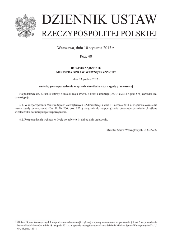 DZIENNIK USTAW RZECZYPOSPOLITEJ POLSKIEJ Warszawa, dnia 10 stycznia 2013 r. Poz. 40 ROZPORZĄDZENIE MINISTRA SPRAW WEWNĘTRZNYCH 1) z dnia 13 grudnia 2012 r. zmieniające rozporządzenie w sprawie określenia wzoru zgody przewozowej Na podstawie art. 43 ust. 8 ustawy z dnia 21 maja 1999 r. o broni i amunicji (Dz. U. z 2012 r. poz. 576) zarządza się, co następuje: § 1. W rozporządzeniu Ministra Spraw Wewnętrznych i Administracji z dnia 31 sierpnia 2011 r. w sprawie określenia wzoru zgody przewozowej (Dz. U. Nr 206, poz. 1221) załącznik do rozporządzenia otrzymuje brzmienie określone w załączniku do niniejszego rozporządzenia. § 2. Rozporządzenie wchodzi w życie po upływie 14 dni od dnia ogłoszenia. Minister Spraw Wewnętrznych: J. Cichocki 1) inister Spraw Wewnętrznych kieruje działem administracji rządowej – sprawy wewnętrzne, na podstawie § 1 ust. 2 rozporządzenia M Prezesa Rady Ministrów z dnia 18 listopada 2011 r. w sprawie szczegółowego zakresu działania Ministra Spraw Wewnętrznych (Dz. U. Nr 248, poz. 1491). Dziennik Ustaw –2– Poz. 40 Załącznik do rozporządzenia Ministra Spraw Wewnętrznych z dnia 13 grudniaZał 2012 r. 40) cz k(poz do ro p WZÓR ZGODA PRZEWOZOWA NA KAŻDORAZOWE PRZEMIESZCZANIE BRONI PALNEJ LUB AMUNICJI (CONSENT TO TRANSFER FIREARMS OR AMMUNITION) Art. 11 ust. 2 i art. 10 dyrektywy 91/477/EWG (Article 11(2) and Article 10 of Directive 91/477/ECC) 1. Państwo początkowe transakcji (Initial country of transaction) 3. Zbywca (Seller) 2. Państwo docelowe transakcji (Target country of transaction) przedsiębiorca (entrepreneur) osoba fizyczna (natural person) 4. Nabywca (Purchaser) przedsiębiorca (entrepreneur) Nazwisko (Surname): Nazwisko (Surname): Imię/imiona (First name(s)): Imię/imiona (First name(s)): Firma przedsiębiorcy: (Company name) Firma przedsiębiorcy: (Company name) Siedziba (Registered office): Siedziba (Registered office): Adres (Address): Adres (Address): Numer telefonu (Phone number): Numer telefonu (Phone number): Numer faksu (Fax number): Numer faksu (Fax number): osoba fizyczna (natural person) Adres, na który broń palna lub amunicja ma być dostarczona: (Address to which the firearms or ammunition are to be transported) 5. Dotyczy broni palnej/amunicji (Concerns: firearms/ammunition) Lp. (No.) Kategoria (Category) tak (Yes) Załącznik: (Annex) Typ (Type) Marka/model (Make/model) Kaliber (Calibre) Nr seryjny (Serial No.) nie (No) CIP cecha (CIP proof) Inne cechy (Other characteristics) 6. Uprzednia zgoda państwa docelowego transakcji (Prior consent of target country of transaction) Uzyskana (kopia w załączeniu) dla broni palnej lub amunicji nr: (Obtained (copy attached) for firearm(s) or ammunition No(s)) Ważna do (Valid until): 7. Szczegóły wysyłki (Details of consignment) Przewoźnik (Carrier): Sposób przewozu (Means of transfer): Data rozpoczęcia przewozu: (Date of departure) Przewidywana data zakończenia przewozu: (Estimated date of arrival) Adres, na który broń palna lub amunicja ma być dostarczona: (Address to which the firearms or ammunition are to be transported) Państwa członkowskie tranzytu: (Member States of transit) 8. Poświadczenie przez państwo początkowe transakcji spełnienia koniecznych wymagań (Certification by the initial country of transaction that all necessary requirements are filled) Data (Date): Podpis (Signature): Pieczątka (Stamp):