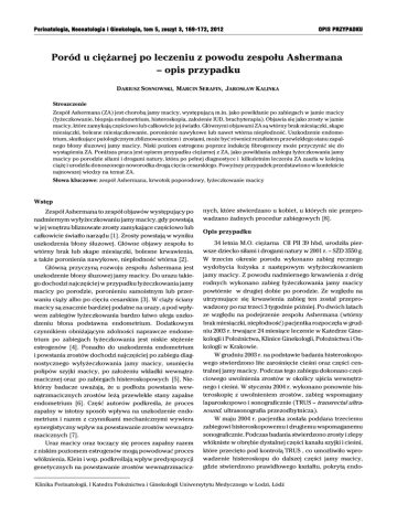 Perinatologia, Neonatologia i Ginekologia, tom 5, zeszyt 3, 169-172, 2012 OPIS PRZYPADKU Poród u ciężarnej po leczeniu z powodu zespołu Ashermana – opis przypadku DARIUSZ SOSNOWSKI, MARCIN SERAFIN, JAROSŁAW KALINKA Streszczenie Zespół Ashermana (ZA) jest chorobą jamy macicy, występującą m.in. jako powikłanie po zabiegach w jamie macicy (łyżeczkowanie, biopsja endometrium, histeroskopia, założenie IUD, brachyterapia). Objawia się jako zrosty w jamie macicy, które zamykają częściowo lub całkowicie jej światło. Głównymi objawami ZA są wtórny brak miesiączki, skąpe miesiączki, bolesne miesiączkowanie, poronienie nawykowe lub nawet wtórna niepłodność. Uszkodzenie endometrium, skutkujące patologicznym zbliznowaceniem i zrostami, może być również rezultatem przewlekłego stanu zapalnego błony śluzowej jamy macicy. Niski poziom estrogenu poprzez indukcję fibrogenezy może przyczynić się do wystąpienia ZA. Poniższa praca jest opisem przypadku ciężarnej z ZA, jako powikłania zabiegu łyżeczkowania jamy macicy po porodzie siłami i drogami natury, która po pełnej diagnostyce i kilkuletnim leczeniu ZA zaszła w kolejną ciążę i urodziła donoszonego noworodka drogą cięcia cesarskiego. Powyższy przypadek przedstawiono w kontekście najnowszej wiedzy na temat ZA. Słowa kluczowe: zespół Ashermana, krwotok poporodowy, łyżeczkowanie macicy Wstęp Zespół Ashermana to zespół objawów występujący po nadmiernym wyłyżeczkowaniu jamy macicy, gdy powstają w jej wnętrzu bliznowate zrosty zamykające częściowo lub całkowicie światło narządu [1]. Zrosty powstają w wyniku uszkodzenia błony śluzowej. Główne objawy zespołu to wtórny brak lub skąpe miesiączki, bolesne krwawienia, a także poronienia nawykowe, niepłodność wtórna [2]. Główną przyczyną rozwoju zespołu Ashermana jest uszkodzenie błony śluzowej jamy macicy. Do urazu takiego dochodzi najczęściej w przypadku łyżeczkowania jamy macicy po porodzie, poronieniu samoistnym lub przerwaniu ciąży albo po cięciu cesarskim [3]. W ciąży ściany macicy są znacznie bardziej podatne na urazy, a pod wpływem zabiegów łyżeczkowania bardzo łatwo ulega uszkodzeniu błona podstawna endometrium. Dodatkowym czynnikiem obniżającym zdolności naprawcze endometrium po zabiegach łyżeczkowania jest niskie stężenie estrogenów [4]. Ponadto do uszkodzenia endometrium i powstania zrostów dochodzi najczęściej po zabiegu diagnostycznego wyłyżeczkowania jamy macicy, usunięciu polipów szyjki macicy, po założeniu wkładki wewnątrzmacicznej oraz po zabiegach histeroskopowych [5]. Niektórzy badacze uważają, że u podłoża powstania wewnątrzmacicznych zrostów leżą przewlekłe stany zapalne endometrium [6]. Część autorów podkreśla, że proces zapalny w istotny sposób wpływa na uszkodzenie endometrium i razem z czynnikami mechanicznymi wywiera synergistyczny wpływ na powstawanie zrostów wewnątrzmacicznych [7]. Uraz macicy oraz toczący się proces zapalny razem z niskim poziomem estrogenów mogą powodować proces włóknienia. Klein i wsp. podkreślają wpływ predyspozycji genetycznych na powstawanie zrostów wewnątrzmacicz- nych, które stwierdzano u kobiet, u których nie przeprowadzano żadnych procedur zabiegowych [8]. Opis przypadku 34 letnia M.O. ciężarna CII PII 39 hbd, urodziła pierwsze dziecko siłami i drogami natury w 2001 r. – SŻD 3550 g. W trzecim okresie porodu wykonano zabieg ręcznego wydobycia łożyska z następowym wyłyżeczkowaniem jamy macicy. Z powodu nadmiernego krwawienia z dróg rodnych wykonano zabieg łyżeczkowania jamy macicy powtórnie w drugiej dobie po porodzie. Ze względu na utrzymujące się krwawienia zabieg ten został przeprowadzony po raz trzeci 3 tygodnie później. Po dwóch latach ze względu na podejrzenie zespołu Ashermana (wtórny brak miesiączki, niepłodność) pacjentka rozpoczęła w grudniu 2003 r. trwające 24 miesiące leczenie w Katedrze Ginekologii i Położnictwa, Klinice Ginekologii, Położnictwa i Onkologii w Krakowie. W grudniu 2003 r. na podstawie badania histeroskopowego stwierdzono lite zarośnięcie cieśni oraz części centralnej jamy macicy. Podczas tego zabiegu dokonano częściowego uwolnienia zrostów w okolicy ujścia wewnętrznego i cieśni. W styczniu 2004 r. wykonano ponownie histeroskopię z uwolnieniem zrostów, zabieg wspomagany laparoskopowo i sonograficznie (TRUS – transrectal ultrasound, ultrasonografia przezodbytnicza). W maju 2004 r. pacjentka została poddana trzeciemu zabiegowi histeroskopowemu i drugiemu wspomaganemu sonograficznie. Podczas badania stwierdzono zrosty i zlepy włókniste w obrębie dystalnej części kanału szyjki i cieśni, które przecięto pod kontrolą TRUS , co umożliwiło wprowadzenie histeroskopu do dalszej części jamy macicy, gdzie stwierdzono prawidłowego kształtu, pokrytą endo- Klinika Perinatologii, I Katedra Położnictwa i Ginekologii Uniwersytytu Medycznego w Łodzi, Łódź 170 D. Sosnowski, M. Serafin, J. Kalinka metrium fazy proliferacyjnej część jamy macicy, z prawidłowym prawym rogiem i drobnym ujściem macicznym prawego jajowodu. Lewa część jamy macicy zarośnięta litym zrostem od poziomu cieśni. We wrześniu 2004 r. poddano pacjentkę czwartej histeroskopii, podczas której odtworzono lewy róg macicy przecinając lite zrosty, uwidaczniając w obrębie lewego rogu szczelinowaty otwór będący najprawdopodobniej ujściem macicznym jajowodu lewego. Podczas kontrolnego badania w styczniu 2005 r. w trakcie histeroskopii stwierdzono, iż odtworzona podczas wcześniejszych zabiegów lewa część jamy macicy i lewy róg macicy uległy zarośnięciu. Pacjentka cały czas nie miesiączkowała. Planowała kolejną ciążę. W listopadzie 2007 roku stwierdzono sonograficznie 5-tygodniową ciążę z terminem porodu wg USG na 01.08. 2008 r. W 6. tygodniu pacjentka była hospitalizowana z powodu zagrażającego