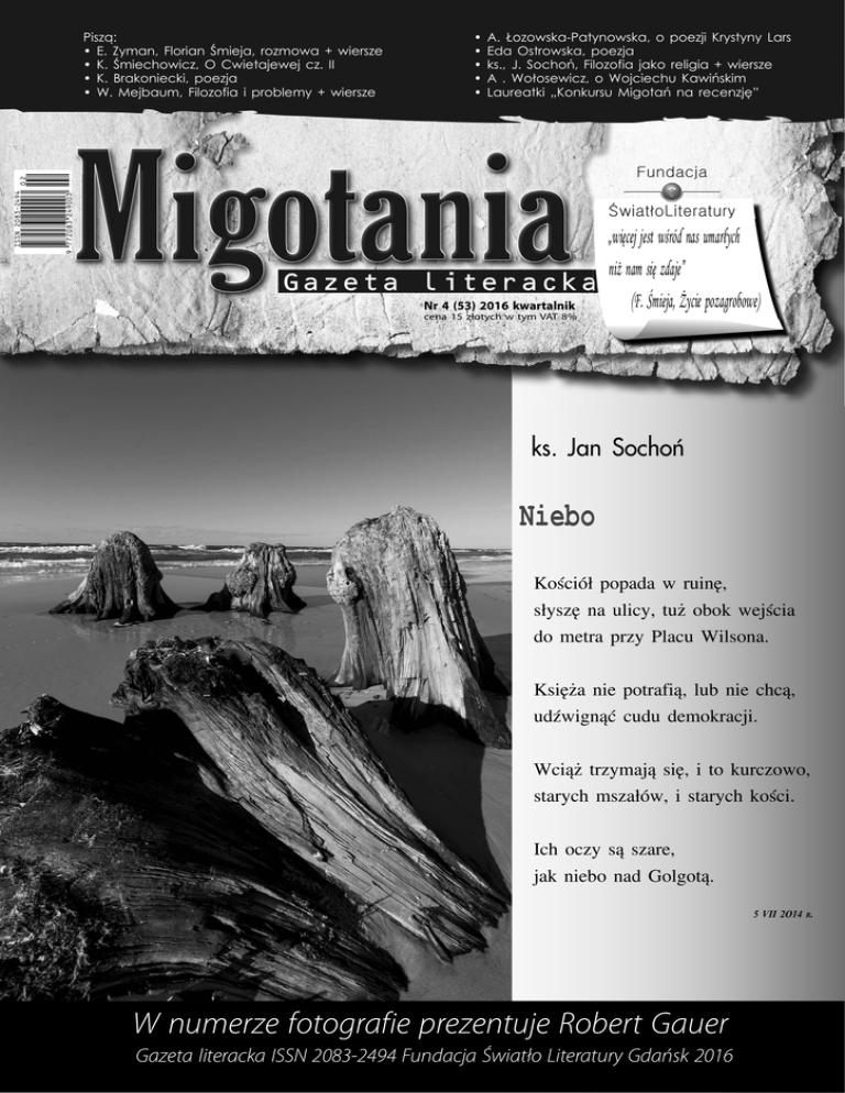 Piszą: • E. Zyman, Florian Śmieja, rozmowa + wiersze • K. Śmiechowicz, O Cwietajewej cz. II • K. Brakoniecki, poezja • W. Mejbaum, Filozofia i problemy + wiersze • • • • • A. Łozowska-Patynowska, o poezji Krystyny Lars Eda Ostrowska, poezja ks., J. Sochoń, Filozofia jako religia + wiersze A . Wołosewicz, o Wojciechu Kawińskim Laureatki „Konkursu Migotań na recenzję” Nr 4 (53) 2016 kwartalnik cena 15 złotych w tym VAT 8% „więcej jest wśród nas umarłych niż nam się zdaje” (F. Śmieja, Życie pozagrobowe) ks. Jan Sochoń Niebo Kościół popada w ruinę, słyszę na ulicy, tuż obok wejścia do metra przy Placu Wilsona. Księża nie potrafią, lub nie chcą, udźwignąć cudu demokracji. Wciąż trzymają się, i to kurczowo, starych mszałów, i starych kości. Ich oczy są szare, jak niebo nad Golgotą. 5 VII 2O14 R. W numerze fotografie prezentuje Robert Gauer Gazeta literacka ISSN 2083-2494 Fundacja Światło Literatury Gdańsk Gazeta 2016 Literacka 1 FELIETON Piotr Gajda N iemal każdy poeta najpierw był grafomanem. To otwarcie nie jest na szczęście zdaniem kategoryzującym; każdej regule przydarzają się chlubne wyjątki. Niestety, mój osobisty przykład do nich nie należy, co można łatwo sprawdzić na łamach kilku rzadkich cymeliów literackich w rodzaju Antologii wierszy poetów nagrodzonych w Turnieju Jednego Wiersza pt.: „Kobieta” w latach 1994–2005 czy piotrkowskiego pisma regionalno-kulturalnego „KurieR i Taraskę, po Konstantynów Łódzki. Krzysztof (legitymujący się podówczas dwoma nominacjami do nagrody głównej w konkursie im. Jacka Bierezina), delikatnie jak to tylko możliwe, dał mi do zrozumienia, że to, co piszę, ma rangę godną miasteczka, którego mieszkańców truł przez dekady wielki zakład wyrobów chemicznych, ale już niekoniecznie sprawdzi się „na wolnym powietrzu”. Zrozumiałem tę lekcję i w trzy miesiące później (był rok 2007) moje „nowe wiersze” ukazały się drukiem w łódzkim „Tyglu Kultury”, a ich „chrzestnym ojcem” i „redaktorem prowadzącym” był nieodżałowany Zdzisław Jaskuła. Nie wiadomo, co byłoby dalej z moją grafomanią, gdybym w swoim czasie nie zetknął się z poezją Rafała Wojaczka, nie spotkał na warsztatach literackich Marka tomiszczem przed nosami innych niespełnionych poetów na dowód własnej wielkości (poetyckiej szerokości zero), którym nie starczyło pieniędzy albo nie wychodzili ich u prezydenta lub starosty. Wklejałbym poszczególne wiersze na Fejsa i napawał się opiniami znajomych, że takie cudne. Może jakimś cudem otarłbym się o profesjonalny poetycki festiwal (jak onegdaj zapoznana animatorka kultury i słaba poetka), żeby w czasie spotkania autorskiego obecny wśród publiczności pewien hołubiony przez mainstream autor mógł rzucić w przestrzeń ciche pytanie retoryczne: „Cóż to za nieszczęsne dziewczę?”. Wspominałem wcześniej o wyjątkach… Minęło kilka lat, pomimo że zdążyłem w międzyczasie wydać dwie książki poetyckie, otrzymać nominację do Bierezina, nagrody w kilkunastu znanych konkursach poetyckich, a także publikować wiersze w ogólnopolskich czasopismach literackich, nadal Grafomania – odmiana przez przypadek FELIETON – Kultura i Rzeczywistość”, gdzie opublikowano zestawy moich absolutnie grafomańskich wierszy, jakimi w swoim czasie wygrałem kilka lokalnych konkursów poetyckich. Na szczęście koledzy po piórze byli czujni. Na portalu Nieszuflada.pl za wklejkę z wierszem „objechał mnie jak burą sukę” Jacek Dehnel, co z jednej strony mocno mnie ubodło (jak każdego podobnego mi grafomana), ale z drugiej dało sporo do myślenia. Zwłaszcza że przecież już w okolicach końca lat osiemdziesiątych dwudziestego wieku napisałem kilka według mnie (a moje „ja” zawsze bywało przesadnie krytyczne) wcale niezłych wierszy, które nigdy nie doczekały się publikacji, ponieważ podczas jednej z przeprowadzek teczkę pełną tekstów omyłkowo wrzuciłem do pieca. Ale wtedy był rok 2002, a ja po prawie dziesięciu latach od całkowitego odrzucenia poezji na rzecz twardej walki o byt w ultra-kapitalistycznej rzeczywistości powiatowego miasteczka literacko zupełnie zardzewiałem, straciłem liryczny węch i czucie. I „sadziłem” te swoje „knoty”, które mogły się podobać jurorom konkursów poetyckich wywodzącym się z szarej masy polonistów, bibliotekarzy i grafomanów z aspiracjami. Na szczęście otrzeźwienie nadeszło kilka lat później, w czym nieoceniony udział miał Krzysztof Kleszcz, poeta z tego samego miasta, o którego istnieniu tylko słyszałem, albowiem nie widywałem go na rozstrzygnięciach lokalnych konkursów poetyckich rozprzestrzeniających się „od morza do morza”, czyli mniej więcej od Tomaszowa Mazowieckiego, przez Piotrków Trybunalski Marek Wawrzkiewicz P popełniałem błędy. Jednym z nich było prowadzenie warsztatów, na które zgłosiło się około dwudziestu osób w różnym wieku, niestety, wszystkie za wyjątkiem jednej – młodego podówczas licealisty Tomasza Bąka – okazały się w istocie hardcore-grafomanami. Późniejszy autor [beep] Generation już wtedy zaprezentował wiersze, które z powodzeniem można było drukować. Dla innego ich uczestnika, dopominającego się, aby na końcu każdego wiersza umieszczać wytłumaczenie metafor, nie było już ratunku. Przy Bąku zaś nie zostało nic do roboty (a tym bardziej do zepsucia), ponieważ już wtedy wypracował nie tylko dojrzałość warsztatową, ale także i osobowościową. Został wciągnięty w łódzkie środowisko poetyckie, jednak z czasem zdecydowanie się od niego odciął, pozostając poetą niepodległym, takim, który nie ogląda się za siebie, a prze wyłącznie do przodu. Tym samym znowu wygrało życie w swoich kolejnych odsłonach, z jakich każda potwierdzała niepisaną regułę: „nie ma tego złego (choćby i w zalewi