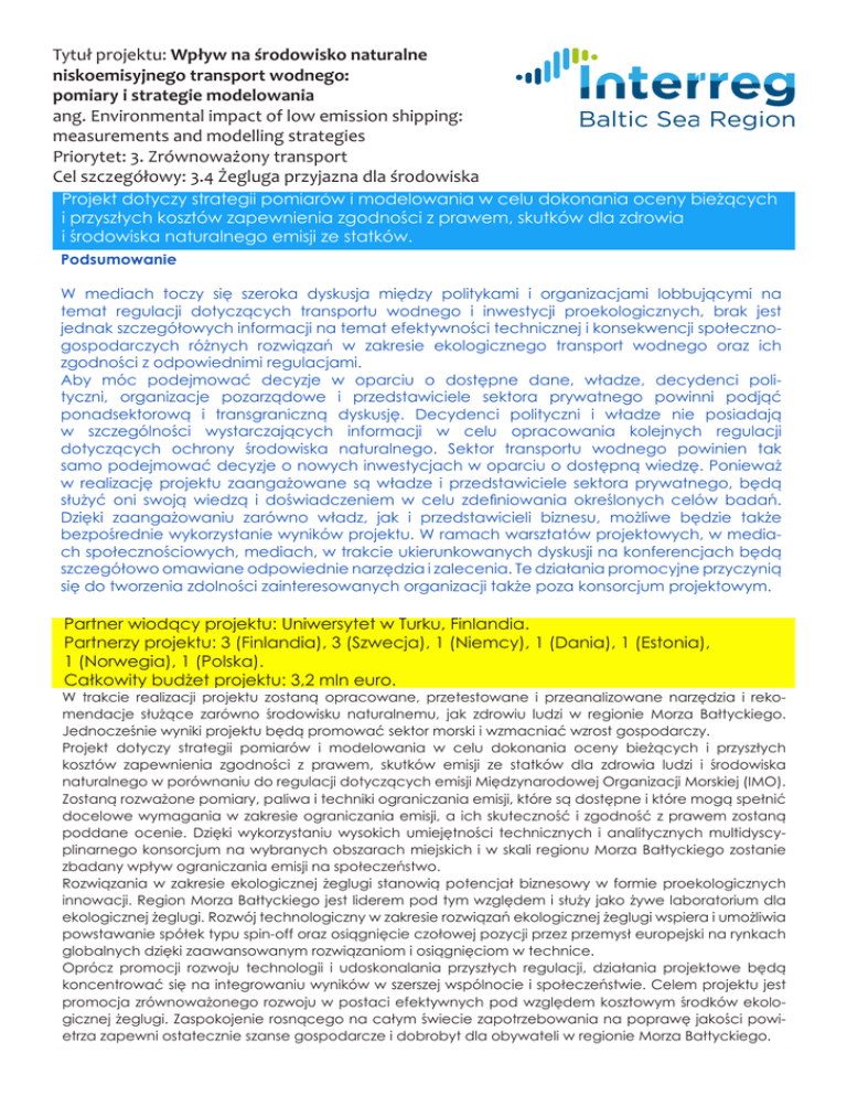 Tytuł projektu: Wpływ na środowisko naturalne niskoemisyjnego transport wodnego: pomiary i strategie modelowania ang. Environmental impact of low emission shipping: measurements and modelling strategies Priorytet: 3. Zrównoważony transport Cel szczegółowy: 3.4 Żegluga przyjazna dla środowiska Projekt dotyczy strategii pomiarów i modelowania w celu dokonania oceny bieżących i przyszłych kosztów zapewnienia zgodności z prawem, skutków dla zdrowia i środowiska naturalnego emisji ze statków. Podsumowanie W mediach toczy się szeroka dyskusja między politykami i organizacjami lobbującymi na temat regulacji dotyczących transportu wodnego i inwestycji proekologicznych, brak jest jednak szczegółowych informacji na temat efektywności technicznej i konsekwencji społecznogospodarczych różnych rozwiązań w zakresie ekologicznego transport wodnego oraz ich zgodności z odpowiednimi regulacjami. Aby móc podejmować decyzje w oparciu o dostępne dane, władze, decydenci polityczni, organizacje pozarządowe i przedstawiciele sektora prywatnego powinni podjąć ponadsektorową i transgraniczną dyskusję. Decydenci polityczni i władze nie posiadają w szczególności wystarczających informacji w celu opracowania kolejnych regulacji dotyczących ochrony środowiska naturalnego. Sektor transportu wodnego powinien tak samo podejmować decyzje o nowych inwestycjach w oparciu o dostępną wiedzę. Ponieważ w realizację projektu zaangażowane są władze i przedstawiciele sektora prywatnego, będą służyć oni swoją wiedzą i doświadczeniem w celu zdefiniowania określonych celów badań. Dzięki zaangażowaniu zarówno władz, jak i przedstawicieli biznesu, możliwe będzie także bezpośrednie wykorzystanie wyników projektu. W ramach warsztatów projektowych, w mediach społecznościowych, mediach, w trakcie ukierunkowanych dyskusji na konferencjach będą szczegółowo omawiane odpowiednie narzędzia i zalecenia. Te działania promocyjne przyczynią się do tworzenia zdolności zainteresowanych organizacji także poza konsorcjum projektowym. Partner wiodący projektu: Uniwersytet w Turku, Finlandia. Partnerzy projektu: 3 (Finlandia), 3 (Szwecja), 1 (Niemcy), 1 (Dania), 1 (Estonia), 1 (Norwegia), 1 (Polska). Całkowity budżet projektu: 3,2 mln euro. W trakcie realizacji projektu zostaną opracowane, przetestowane i przeanalizowane narzędzia i rekomendacje służące zarówno środowisku naturalnemu, jak zdrowiu ludzi w regionie Morza Bałtyckiego. Jednocześnie wyniki projektu będą promować sektor morski i wzmacniać wzrost gospodarczy. Projekt dotyczy strategii pomiarów i modelowania w celu dokonania oceny bieżących i przyszłych kosztów zapewnienia zgodności z prawem, skutków emisji ze statków dla zdrowia ludzi i środowiska naturalnego w porównaniu do regulacji dotyczących emisji Międzynarodowej Organizacji Morskiej (IMO). Zostaną rozważone pomiary, paliwa i techniki ograniczania emisji, które są dostępne i które mogą spełnić docelowe wymagania w zakresie ograniczania emisji, a ich skuteczność i zgodność z prawem zostaną poddane ocenie. Dzięki wykorzystaniu wysokich umiejętności technicznych i analitycznych multidyscyplinarnego konsorcjum na wybranych obszarach miejskich i w skali regionu Morza Bałtyckiego zostanie zbadany wpływ ograniczania emisji na społeczeństwo. Rozwiązania w zakresie ekologicznej żeglugi stanowią potencjał biznesowy w formie proekologicznych innowacji. Region Morza Bałtyckiego jest liderem pod tym względem i służy jako żywe laboratorium dla ekologicznej żeglugi. Rozwój technologiczny w zakresie rozwiązań ekologicznej żeglugi wspiera i umożliwia powstawanie spółek typu spin-off oraz osiągnięcie czołowej pozycji przez przemysł europejski na rynkach globalnych dzięki zaawansowanym rozwiązaniom i osiągnięciom w technice. Oprócz promocji rozwoju technologii i udoskonalania przyszłych regulacji, działania projektowe będą koncentrować się na integrowaniu wyników w szerszej wspólnocie i społeczeństwie. Celem projektu jest promocja zrównoważonego rozwoju w postaci efektywnych pod względem kosztowym środków ekologicznej żeglugi. Zaspokojenie rosnącego na całym świecie zapotrzebowania na poprawę jakości powietrza zapewni ostatecznie szanse gospodarcze i dobrobyt dla obywateli w regionie Morza Bałtyckiego.