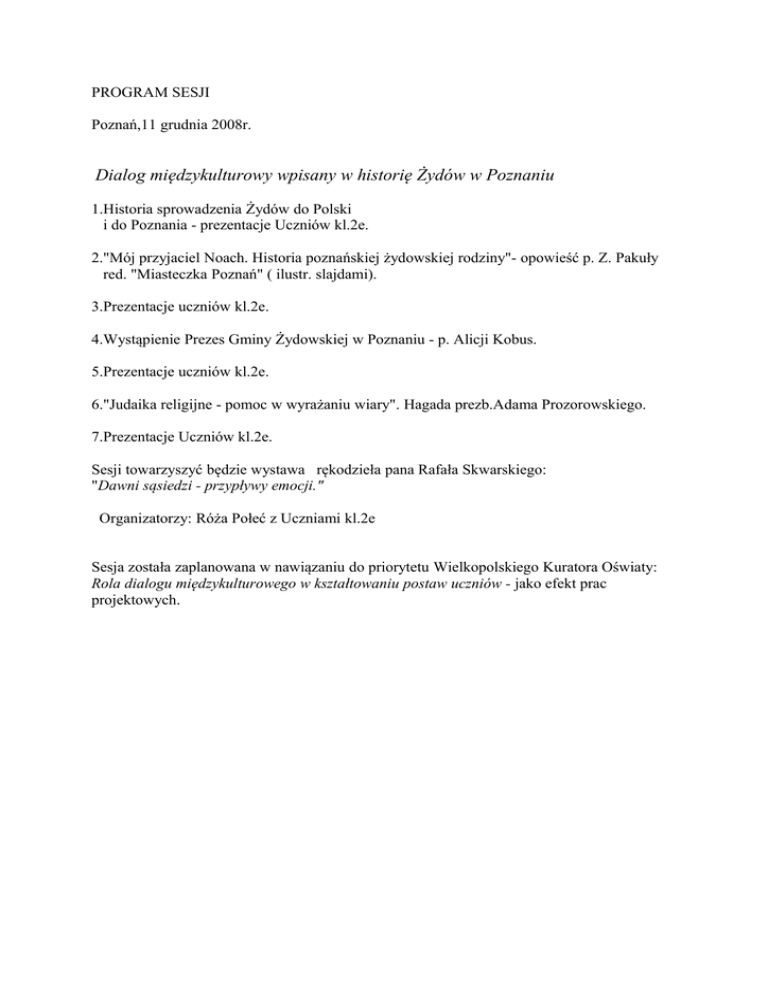 PROGRAM SESJI Poznań,11 grudnia 2008r. Dialog międzykulturowy wpisany w historię Żydów w Poznaniu 1.Historia sprowadzenia Żydów do Polski i do Poznania - prezentacje Uczniów kl.2e. 2."Mój przyjaciel Noach. Historia poznańskiej żydowskiej rodziny"- opowieść p. Z. Pakuły red. "Miasteczka Poznań" ( ilustr. slajdami). 3.Prezentacje uczniów kl.2e. 4.Wystąpienie Prezes Gminy Żydowskiej w Poznaniu - p. Alicji Kobus. 5.Prezentacje uczniów kl.2e. 6."Judaika religijne - pomoc w wyrażaniu wiary". Hagada prezb.Adama Prozorowskiego. 7.Prezentacje Uczniów kl.2e. Sesji towarzyszyć będzie wystawa rękodzieła pana Rafała Skwarskiego: "Dawni sąsiedzi - przypływy emocji." Organizatorzy: Róża Połeć z Uczniami kl.2e Sesja została zaplanowana w nawiązaniu do priorytetu Wielkopolskiego Kuratora Oświaty: Rola dialogu międzykulturowego w kształtowaniu postaw uczniów - jako efekt prac projektowych. Sesja zdaniem uczniów „Wszystkie mury muszą kiedyś runąć. Dlatego ludzie religii powinni mówić ponad tymi murami i zbliżać serca- taka jest ich jedyna rola…” Ks. dr Jerzy Strasz 11.12.2008 r. w III LO im. św. Jana Kantego ( w szkole, do której uczęszczam) odbyła się sesja naukowa zatytułowana: „Dialog międzykulturowy wpisany w historię Żydów w Poznaniu”. Gospodarzami byliśmy my - uczniowie klasy 2e - wraz z panią mgr Różą Połeć, która jest naszą nauczycielką języka polskiego i wychowawczynią. Pracowaliśmy metodą projektu i każda grupa wybrała do zaprezentowania jeden temat związany z kulturą żydowską, by podczas sesji podzielić się wiedzą z koleżankami i kolegami z innych klas i szkół. Po przemyśleniu, zdecydowałam się na zaprezentowanie przejawów kultury żydowskiej w Poznaniu. Na początku przygotowań do występu sądziłam, że mój wykład będzie jednym z najkrótszych, ponieważ nie sądziłam, iż w naszym mieście tak żywo uobecnia się wielokulturowość. Jednak każda następna przeczytana książka, informator kulturalny czy kolejne strony internetowe ukazywały mi, jak bardzo się myliłam. Poznań, ku mojemu zdziwieniu, jako jedno z nielicznych miast w Polsce jest tak otwarte na przejaw innych kultur. To właśnie u nas organizowane są „ DNI JUDAIZMU ". Możemy poszczycić się imprezami kulturalnymi, podczas których prezentowana jest między innymi muzyka żydowska czy warsztaty tańca. W muzeach znajdziemy wystawy ukazujące obrazy czy rzeźby autorów pochodzenia żydowskiego. Przechodząc ulicami, rzadko kiedy zwracamy uwagę na tablice lub pomniki poświęcone Żydom. Kiedy przedstawiałam nasze miasto pod kątem kultury żydowskiej, większość moich rówieśników nie dowierzała, jak wiele się dzieje i jak wiele nas omija z powodu braku zainteresowania tym, co nieznane i wydaje się obce. W moim wystąpieniu wspomniałam o restauracji „Cymes”, znajdującej się przy Starym Rynku, w której możemy skosztować tradycyjnych potraw przy dźwiękach muzyki żydowskiej. Większość słuchaczy wiedziała, o jakiej restauracji mówię, lecz połowa z nich nie zdawała sobie sprawy, że ma ona taki charakter kulturowy. Wtedy, stojąc na scenie, zauważałam rosnącą ciekawość odbiorców ... Zrozumiałam, dlaczego taki temat zdecydowała się zaprezentować Pani Profesor, przy naszym udziale… Udział w przygotowywaniu tej sesji oraz uczestnictwo w jej odbiorze skłoniło mnie do refleksji... Zrozumiałam, jak często jesteśmy zamknięci na to co odmienne... Nie zauważamy przejawów kultury, która tak wiele mogłaby wnieść do naszego codziennego życia. Wydarzenie, jakie miało miejsce w naszej szkole, pozwoliło na ukazanie historii rodzin żydowskich Poznania podczas II wojny światowej i ich powojennych losów, poznanie religii oraz miejsc w Poznaniu będących przejawem kultury żydowskiej. Ponadto, mam nadzieję, iż spowodowało, że młodzi ludzie zostali zachęceni do otwrtości na dialog międzykulturowy. Justyna Średzka / III LO w Poznaniu, uczennica kl.2 e / Dnia 11 grudnia 2008 w III LO w Poznaniu odbyła się sesja popularnonaukowa, której tematem przewodnim był Dialog międzykulturowy wpisany w historię Żydów w Poznaniu. Uczniowie naszej szkoły czynnie włączyli się do przygotowania i przeprowadzenia spotkania, w którym udział wzięło liczne grono zaproszonych gości nauczyciele języka polskiego i uczniowie z poznańskich szkół ponadgimnazjalnych. Choć nakład pracy młodzieży z mojej klasy 2e - pod przewodnictwem pani profesor Róży Połeć - był naprawdę duży, to trudno ocenić, czy sesja przyniosła pożądane skutki... Prezentacja została podzielona na kolejne etapy, z których każdy ukazywał inny aspekt kultury narodu żydowskiego w Poznaniu. Zgromadzeni w auli szkolnej mogli zapoznać się z literaturą, malarstwem, a także,co niezmiernie ważne, z autentycznymi wydarzeniami z życia kilku urodzonych w Polsce (w Poznaniu) Żydów. Przedstawiali je uczniowie III LO oraz redaktor " Miasteczka Poznań" - pan Zbigniew Pakuła. W moim przekonaniu kulminacyjnym momentem było wystąpienie Przewodniczącej Gminy Wyznaniowej Żydowskiej w Poznaniu - pani Alicji Kobus. W swoim wystąpieniu poruszyła niezanikający w naszym kraju problem antysemityzmu. Pani Alicja Kobus przytoczyła wiele prawdziwych historii ze swojego życia, które opowiadały głównie o upokorzeniach, jakich doznała od ludzi innych wyznań. Uważam, że dialog międzykulturowy nie jest możliwy bez wykorzenienia z naszych umysłów wrogości wobec Żydów i tego, co oni sobą reprezentują, czyli ich kultury i przekonań. Zadanie to jest bardzo trudne, ale możliwe do zrealizowania przy ogromnym nakładzie sił i przede wszystkim chęci. Jakub Polcyn / III LO w Poznaniu, kl.2e /