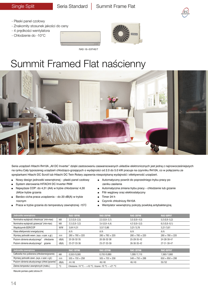 Seria Standard Single Split Summit Frame Flat - Płaski panel czołowy - Znakomity stosunek jakości do ceny - 4 prędkości wentylatora - Chłodzenie do -10°C Summit Framed Flat naścienny Seria urządzeń Hitachi R410A „All DC Inverter” dzięki zastosowaniu zaawansowanych układów elektronicznych jest jedną z najnowocześniejszych na rynku.Cały typoszereg urządzeń chłodząco-grzejących o wydajności od 2.0 do 5.0 kW pracuje na czynniku R410A, co w połączeniu ze sprężarkami Hitachi DC Scroll lub Hitachi DC Twin Rotary zapewnia niespotykaną wydajność i efektywność urządzeń. + Nowy design jednostki wewnętrznej – płaski panel czołowy + System sterowania HITACHI DC Inverter PAM + + + + Automatyczny powrót do poprzedniego trybu pracy po Najwyższe COP: do 4,31 (AA) w trybie chłodzenia/ 4,30 + Automatyczna zmiana trybu pracy – chłodzenie lub grzanie (AA)w trybie grzania + Filtr węglowy oraz elektrostatyczny Bardzo cicha praca urządzenia – do 20 dB(A) w trybie + Timer 24 h nocnym + Czynnik chłodniczy R410A Praca w trybie grzania do temperatury zewnętrznej -15oC + Wentylator wewnętrzny pokryty powłoką antybakteryjną zaniku zasilania Jednostka wewnętrzna Nominalna wydajność chłodnicza1 (min-max) Nominalna wydajność grzewcza (min-max) 2 Współczynnik EER/COP Klasa efektywności energetycznej Wymiary jednostki wewn. (wys. x szer. x gł.) Poziom ciśnienia akustycznego3 chłodzenie Poziom ciśnienia akustycznego 3 grzanie Jednostka zewnętrzna Całkowita moc pobierana (chłodzenie/grzanie) Wymiary jednostki zewn. (wys. x szer. x gł.) Poziom ciśnienia akustycznego (chłod./grzanie)3 Zakres temperatur zewnętrznych (maks.) Warunki pomiaru patrz strona 31 Chłodzenie: Grzanie: Summit Seria Standard Single Split - Wysoka wydajność i efektywność - Chłodzenie do -10°C Summit naścienny Seria urządzeń Hitachi R410A „All DC Inverter” dzięki zastosowaniu zaawansowanych układów elektronicznych jest jedną z najnowocześniejszych na rynku. Cały typoszereg urządzeń chłodząco-grzejących o wydajności od 2.0 do 5.0 kW pracuje na czynniku R410A, co w połączeniu ze sprężarkami Hitachi DC Scroll lub Hitachi DC Twin Rotary zapewnia niespotykaną wydajność i efektywność urządzeń. + System sterowania HITACHI DC Inverter PAM + Automatyczna zmiana trybu pracy – chłodzenie lub grzanie + Najwyższe COP: do 4,31 (AA) w trybie chłodzenia/ 4,30 + Filtr węglowy oraz elektrostatyczny (AA)w trybie grzania + Timer 24 h Bardzo cicha praca urządzenia – do 20 dB(A) w trybie + Czynnik chłodniczy R410A nocnym + Wentylator wewnętrzny pokryty powłoką antybakteryjną + + Praca w trybie grzania do temperatury zewnętrznej -15oC + Automatyczny powrót do poprzedniego trybu pracy po zaniku zasilania Jednostka wewnętrzna Nominalna wydajność chłodnicza1 (min-max) Nominalna wydajność grzewcza (min-max) 2 Współczynnik EER/COP Klasa efektywności energetycznej Wymiary jednostki wewn. (wys. x szer. x gł.) Poziom ciśnienia akustycznego3 chłodzenie Poziom ciśnienia akustycznego 3 grzanie Jednostka zewnętrzna Całkowita moc pobierana (chłodzenie/grzanie) Wymiary jednostki zewn. (wys. x szer. x gł.) Poziom ciśnienia akustycznego (chłod./grzanie)3 Zakres temperatur zewnętrznych (maks.) Warunki pomiaru patrz strona 31 Chłodzenie: Grzanie: