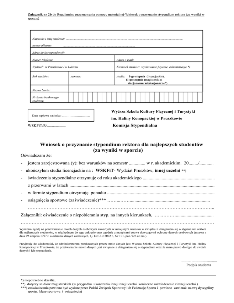 Załącznik nr 2b do Regulaminu przyznawania pomocy materialnej-Wniosek o przyznanie stypendium rektora (za wyniki w sporcie) Nazwisko i imię studenta: .................................................................................................................................................... numer albumu: ........................................................................................... Adres do korespondencji: Numer telefonu: Adres e-mail: Wydział: w Pruszkowie / w Lubiczu Kierunek studiów: wychowanie fizyczne, administracja *) Rok studiów: studia: semestr: I-go stopnia (licencjackie), II-go stopnia (magisterskie) stacjonarne/ niestacjonarne*) Nazwa banku: Nr konta bankowego studenta: Wyższa Szkoła Kultury Fizycznej i Turystyki Data wpływu wniosku: ……………………... WSKFiT/R/................... im. Haliny Konopackiej w Pruszkowie Komisja Stypendialna Wniosek o przyznanie stypendium rektora dla najlepszych studentów (za wyniki w sporcie) Oświadczam że: - jestem zarejestrowana (y): bez warunków na semestr .............. w r. akademickim. 20......../............ - ukończyłem studia licencjackie na : WSKFiT- Wydział Pruszków, innej uczelni **) - świadczenia stypendialne otrzymuję od roku akademickiego ............................................................. z przerwami w latach ........................................................................................................................... - w formie stypendium otrzymuję ponadto ........................................................................................... - osiągnięcia sportowe (zaświadczenie)*** ……...…….................................................................... ……………………………………………………………………………………………………….. Załączniki: oświadczenie o niepobieraniu styp. na innych kierunkach, …..………................................ …………………………………………………………………………………………………………… Wyrażam zgodę na przetwarzanie moich danych osobowych zawartych w niniejszym wniosku w związku z ubieganiem się o stypendium rektora dla najlepszych studentów, w niezbędnym do tego zakresie oraz zgodnie z przepisami prawa dotyczącymi ochrony danych osobowych (ustawa z dnia 29 sierpnia 1997 r. o ochronie danych osobowych, t.j. Dz.U. z 2002 r., Nr 101, poz. 926 ze zm.). Przyjmuję do wiadomości, że administratorem przekazanych przeze mnie danych jest Wyższa Szkoła Kultury Fizycznej i Turystyki im. Haliny Konopackiej w Pruszkowie, że przetwarzanie moich danych jest związane z ubieganiem się o stypendium oraz że mam prawo dostępu do swoich danych i ich poprawiania. ..................................... Podpis studenta *) niepotrzebne skreślić, **) dotyczy studiów magisterskich (w przypadku ukończenia innej innej uczelni konieczne zaświadczenie zimnej uczelni ) ***) zaświadczenia powinno być wydane przez Polski Związek Sportowy lub Federację Sportu i powinno zawierać: nazwę dyscypliny sportu, klasę sportową i osiągnięcia)