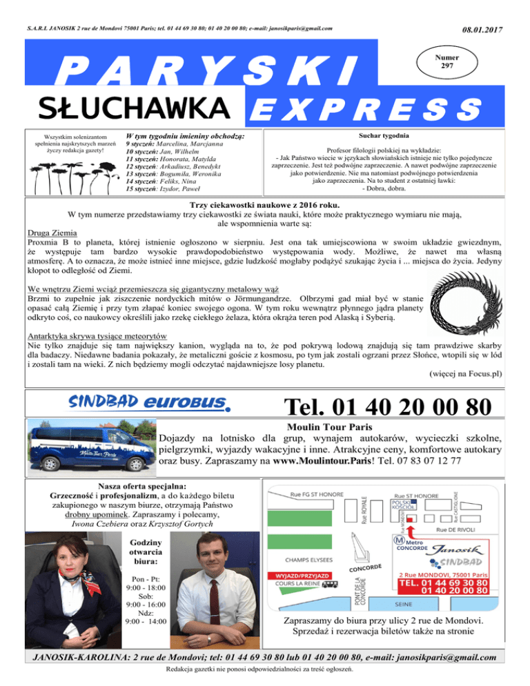 S.A.R.L JANOSIK 2 rue de Mondovi 75001 Paris; tel. 01 44 69 30 80; 01 40 20 00 80; e-mail: [email protected] 08.01.2017 PARYSKI Numer 297 SŁUCHAWKA E X P R E S S Wszystkim solenizantom spełnienia najskrytszych marzeń życzy redakcja gazety! Suchar tygodnia W tym tygodniu imieniny obchodzą: 9 styczeń: Marcelina, Marcjanna 10 styczeń: Jan, Wilhelm 11 styczeń: Honorata, Matylda 12 styczeń: Arkadiusz, Benedykt 13 styczeń: Bogumiła, Weronika 14 styczeń: Feliks, Nina 15 styczeń: Izydor, Paweł Profesor filologii polskiej na wykładzie: - Jak Państwo wiecie w językach słowiańskich istnieje nie tylko pojedyncze zaprzeczenie. Jest też podwójne zaprzeczenie. A nawet podwójne zaprzeczenie jako potwierdzenie. Nie ma natomiast podwójnego potwierdzenia jako zaprzeczenia. Na to student z ostatniej ławki: - Dobra, dobra. Trzy ciekawostki naukowe z 2016 roku. W tym numerze przedstawiamy trzy ciekawostki ze świata nauki, które może praktycznego wymiaru nie mają, ale wspomnienia warte są: Druga Ziemia Proxmia B to planeta, której istnienie ogłoszono w sierpniu. Jest ona tak umiejscowiona w swoim układzie gwiezdnym, że występuje tam bardzo wysokie prawdopodobieństwo występowania wody. Możliwe, że nawet ma własną atmosferę. A to oznacza, że może istnieć inne miejsce, gdzie ludzkość mogłaby podążyć szukając życia i ... miejsca do życia. Jedyny kłopot to odległość od Ziemi. We wnętrzu Ziemi wciąż przemieszcza się gigantyczny metalowy wąż Brzmi to zupełnie jak ziszczenie nordyckich mitów o Jörmungandrze. Olbrzymi gad miał być w stanie opasać całą Ziemię i przy tym złapać koniec swojego ogona. W tym roku wewnątrz płynnego jądra planety odkryto coś, co naukowcy określili jako rzekę ciekłego żelaza, która okrąża teren pod Alaską i Syberią. Antarktyka skrywa tysiące meteorytów Nie tylko znajduje się tam największy kanion, wygląda na to, że pod pokrywą lodową znajdują się tam prawdziwe skarby dla badaczy. Niedawne badania pokazały, że metaliczni goście z kosmosu, po tym jak zostali ogrzani przez Słońce, wtopili się w lód i zostali tam na wieki. Z nich będziemy mogli odczytać najdawniejsze losy planetu. (więcej na Focus.pl) Tel. 01 40 20 00 80 Moulin Tour Paris Dojazdy na lotnisko dla grup, wynajem autokarów, wycieczki szkolne, pielgrzymki, wyjazdy wakacyjne i inne. Atrakcyjne ceny, komfortowe autokary oraz busy. Zapraszamy na www.Moulintour.Paris! Tel. 07 83 07 12 77 Nasza oferta specjalna: Grzeczność i profesjonalizm, a do każdego biletu zakupionego w naszym biurze, otrzymają Państwo drobny upominek. Zapraszamy i polecamy, Iwona Czebiera oraz Krzysztof Gortych Godziny otwarcia biura: Pon - Pt: 9:00 - 18:00 Sob: 9:00 - 16:00 Ndz: 9:00 - 14:00 Zapraszamy do biura przy ulicy 2 rue de Mondovi. Sprzedaż i rezerwacja biletów także na stronie JANOSIK-KAROLINA: 2 rue de Mondovi; tel: 01 44 69 30 80 lub 01 40 20 00 80, e-mail: [email protected] Redakcja gazetki nie ponosi odpowiedzialności za treść ogłoszeń. PRACA : Szlifierz stoczniowy - tel. +48 789 405 802 Praca na szlifowaniu spoin szlifierką na sprężone powietrze, czyszczenie i obróbka mechaniczna spoin po spawaniu - wymagane doświadczenie. Spawacz TIG - tel. +48 571 445 378; [email protected] Spawanie elementów maszyn spożywczych, spawanie metodą TIG, spawanie stali nierdzewnej, - wymagane doświadczenie. Frezer CNC - tel. +48 571 445 378; [email protected] Ustawianie i programowanie frezarek CNC, produkcja elementów do przemysłu lotniczego ze stali, aluminium, żeliwa i plastiku, kontrola jakości wykonanych produktów - wymagane doświadczenie. Brygadzista w stoczni - tel. +48 571 445 378; [email protected] Zarządzanie zespołem spawaczy i ślusarzy, realizacja dolnych bloków kadłuba, spawanie MIG/MAG, - wymagane doświadczenie. Jeżeli chcesz zorganizować pielgrzymkę, wycieczkę lub inną imprezę – zapraszamy do nas! Wynajem autokarów, organizacja wyjazdów, atrakcyjne ceny. 01 44 69 30 80 www.facebook.com/SindbadJanosik/ MIESZKANIE — USŁUGI — NAUKA — INNE : Mężczyzna lat 42 pozna panią poważnie myślącą o życiu. Jestem uczciwym, solidnym, pracującym człowiekiem. Tel. 07 55 16 36 02. Wszelaka prawna pomoc w administracji francuskiej (RSA, CAF, CNAV, ASSURANCE MALADIE, otwieranie firm i inne). Kontakt: Edyta - 06.22.72.26.68 [email protected] Francuzka, lat 40, szuka elastycznego, poważnego mężczyzny na poziomie do wspólnego spędzania czasu z perspektywą na dłuższy związek. Tylko poważne oferty - tel. 06.70.11.49.35. Masz problemy z piciem? Może Anonimowi Alkoholicy pomogą! NIEDZIELA - 17.00: 3 rue Rampale (kod: 9172), Paris, Metro: Belleville. WTOREK – 19.30: 18 rue Claude Lorrain, Paris, Metro: Exelmans. ŚRODA – 19.30: 20 rue Legendre (I piętro), Paris, Metro: Villiers. CZWARTEK: 19.30: 11 Ville St-Jacques (kod: 0911); 10.45 -12.15: 3 rue Rampal, (kod: 9172), Metro: Belleville Godz. 19.30: (GRUPA AA DLA KOBIET) 3, rue Rampal, (kod: 9172), 75019 Paris, Metro: Belleville. Mieszkanie do wynajęcia: Epinay-sur-Seine 40 m2 - 700 euro. Tel. 06.99.72.09.02 Polski Salon Fryzjersko-Kosmetyczny MARGOT 06.16.86.31.57 - Kosmetyczka 06.83.60.47.93 - Fryzjerka Mężczyzna lat 45 pozna panią około lat 40 do poważnego związku. Tel. 06.05.97.64.55 Centrum Informacji Prawnej i Socjalnej dla Polonii oferuje pomoc w sprawach prawnych (w tym prawo pracy), socjalnych i administracyjnych oraz w urzędach. Kontakt: Tel. 06.14.31.98.47 [email protected] Przyjmę do apartamentu: oferta dla kobiety pracującej w średnim wieku. Dostępność od zaraz, w 19 dzielnicy Paryża z wygodami. Tel. 07.53.18.25.57 Mercedes Splinter (wysoki): usługi transportowe, dowóz materiałów na budowy, wywóz gruzu, przeprowadzki, usługi elektryczne - pełny zakres, usługi hydrauliczne - pełny zakres, wynajem kompletu spawalniczego do hydrauliki - szalimo, Polskie okna na wymiar (drewniane, PVC, aluminiowe). Telefon kontaktowy: 06.68