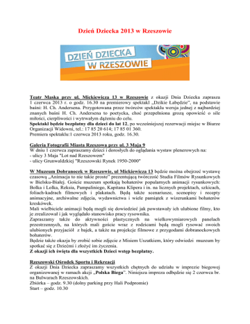 Dzień Dziecka 2013 w Rzeszowie Teatr Maska przy ul. Mickiewicza 13 w Rzeszowie z okazji Dnia Dziecka zaprasza 1 czerwca 2013 r. o godz. 16.30 na premierowy spektakl „Dzikie Łabędzie”, na podstawie baśni: H. Ch. Andersena. Przygotowana przez twórców spektaklu wersja jednej z najbardziej znanych baśni H. Ch. Andersena to poetycka, choć przepełniona grozą opowieść o sile miłości, cierpliwości i wytrwałym dążeniu do celu. Spektakl będzie bezpłatny dla dzieci do lat 12, po wcześniejszej rezerwacji miejsc w Biurze Organizacji Widowni, tel.: 17 85 20 614; 17 85 01 360. Premiera spektaklu:1 czerwca 2013 roku, godz. 16.30. Galeria Fotografii Miasta Rzeszowa przy ul. 3 Maja 9 W dniu 1 czerwca zapraszamy dzieci i dorosłych do oglądania wystaw plenerowych na: - ulicy 3 Maja "Lot nad Rzeszowem" - ulicy Grunwaldzkiej "Rzeszowski Rynek 1950-2000" W Muzeum Dobranocek w Rzeszowie, ul Mickiewicza 13 będzie można obejrzeć wystawę czasową „Animacja to nie takie proste” prezentującą twórczość Studia Filmów Rysunkowych w Bielsku-Białej. Goście muzeum spotkają bohaterów popularnych animacji rysunkowych: Bolka i Lolka, Reksia, Pampaliniego, Kapitana Klipera i in. na licznych projektach, szkicach, foliach-kadrach filmowych i plakatach. Będą także scenariusze, scenopisy i recepty animacyjne, archiwalne zdjęcia, wydawnictwa i wiele pamiątek z wizerunkami bohaterów kreskówek. Mali wielbiciele animacji będą mogli się dowiedzieć jak powstawały ich ulubione filmy, kto je zrealizował i jak wyglądało stanowisko pracy rysownika. Zapraszamy także do aktywności plastycznych na wielkowymiarowych panelach przestrzennych, na których mali goście wraz z rodzicami będą mogli rysować swoich ulubionych przyjaciół z bajek, a także na projekcje filmowe z przygodami dobranockowych bohaterów. Będzie także okazja by zrobić sobie zdjęcie z Misiem Uszatkiem, który odwiedzi muzeum by spotkać się z Dziećmi i złożyć im życzenia. Z okazji ich święta dla wszystkich Dzieci wstęp bezpłatny. Rzeszowski Ośrodek Sportu i Rekreacji Z okazji Dnia Dziecka zapraszamy wszystkich chętnych do udziału w imprezie biegowej organizowanej w ramach akcji „Polska Biega”. Niniejsza impreza odbędzie się 2 czerwca br. na Bulwarach Rzeszowskich. Zbiórka – godz. 9.30 (dolny parking przy Hali Podpromie) Start – godz. 10.30 W biegu może wziąć udział każdy, po wcześniejszym wypełnieniu i przedłożeniu u organizatora w dniu imprezy oświadczenia biegacza lub w przypadku osoby niepełnoletniej oświadczenia rodzica biegacza. Oświadczenia i regulamin biegów dostępne są na stronie www.rosir.pl. Udział w imprezie jest bezpłatny. Po zakończonym biegu każdy uczestnik otrzyma pamiątkowy dyplom. Serdecznie zapraszamy! Rzeszowski Dom Kultury W ramach obchodów Dnia Dziecka zorganizowane zostaną: 25 maja 2013 r. na Osiedlu Franciszka Kotuli odbędzie się impreza dla Dzieci organizowana przez Spółdzielnię Mieszkaniową Projektant i RDK filia Krynicka, 6 czerwca 2013 r. w Klubie Wytwórnia w Rzeszowie odbędzie się pokaz taneczny pn. „ Wszystko to, co umiem”, którego organizatorem jest RDK filia Staromieście. 7 czerwca 2013 r. w Klubie Wytwórnia w Rzeszowie odbędzie się pokaz muzyczny pn. „Lato obudziło talenty”, organizowane przez RDK filia Staromieście. 7 czerwca 2013 r. w RDK filia Biała będzie miał miejsce pokaz artystyczny pn. „Muzyka dla wszystkich”. 9 czerwca 2013 r. podczas Dni Osiedla Pobitno są przewidziane liczne atrakcje dla dzieci w ramach obchodów Dnia Dziecka. 15 czerwca 2013 r. przy siedzibie Fundacji Podkarpackie Hospicjum dla dzieci odbędzie się Piknik Charytatywny. Teatr im. Wandy Siemaszkowej w Rzeszowie, ul. Sokoła 7/9 Teatr im. Wandy Siemaszkowej zaprasza 1 i 2 czerwca 2013 r. o godz. 15.00 na spektakl pn. „Tim Talar albo sprzedany śmiech” Ireneusza Maciejewskiego. „Tim Talar albo sprzedany śmiech” to swoista przypowieść o walce dobra ze złem oraz o tym, jak cenną wartością jest bezinteresowna przyjaźń, upór i optymizm. Mówi o konsekwencjach utraty własnej osobowości na rzecz dóbr materialnych, taniego blichtru, pozornych sukcesów czy pracy. Pokazuje jak łatwo człowiek staje się obiektem manipulacji. Cena Biletu: Dzieci – 20zł, Dorośli – 30zł. Filharmonia Podkarpacka z okazji Dnia Dziecka - Bajk Muzyczna „Trzy Świnki” na podstawie opowieści braci Grimm, w wykonaniu Teatru im. Adama Mickiewicza z Częstochowy. Bajka muzyczna „Trzy Świnki” Roberta Dorosławskiego to swobodne przekształcenie znanej i bardzo lubianej opowieści, pochodzącej ze zbioru baśni braci Grimm. Tytułowe Świnki zachorowały na… nudę. Nie chcą się bawić z innymi zwierzętami, nie zamierzają także budować domu, ani porządkować podwórka, choć zima tuż tuż… Pozostałe zwierzęta wpadają na pewien pomysł. Świnki trzeba przestraszyć. Obmyślają chytry plan. Owca przebiera się za Wilka, a Krowa za Smoka. Kolejne wydarzenia przeplatane są pląsami i piosenkami aż po wspólny wokal za zakończenie. Cena biletu: 15zł Wojewódzka i Miejska Biblioteka Publiczna w Rzeszowie 1 czerwca 2013 r.(zajęcia otwarte, wstęp wolny) ODDZIAŁ DLA DZIECI I MŁODZIEŻY, ul. Słowackiego 11 01.06.2013 r. godz. 10:00 - 15:00 KUFEREK ROZMAITOŚĆI - Dzień Dziecka w Oddziale dla Dzieci i Młodzieży, literacki quiz, na który składają się zagadki, łamigłówki oraz gry i zabawy sprawnościowe - każde dziecko otrzyma nagrodę za udział w zabawie. FILIA nr 3, ul. Krzyżanowskiego 6 01.06. 2013 r., godz. 10.00 - 15.00, RODZINNY DZIEŃ DZIECKA W BIBLIOTECE – zajęcia animacyjne, w pokoju z literaturą dziecięcą będzie przygotowany kącik zabaw dla najmłodszych czytelników, ich rodziców lub opiekunów. Do dyspozycji czytelników będą gry planszowe, puzzle, kolorowanki, bloki rysunkowe, kredki, aby w miłej atmosferze maluchy razem z rodzicami mogły spędzić czas w bibliotece. FILIA 