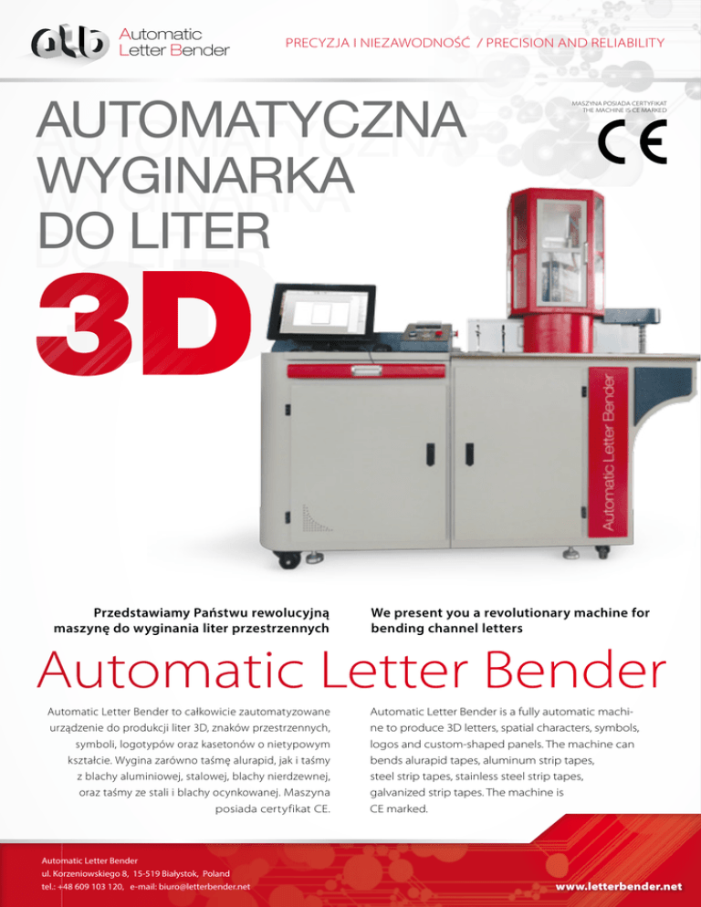 Automatic Letter Bender precyzja i niezawodność / precision and reliability automatyczna automatyczna wyginarka wyginarka do liter do liter Przedstawiamy Państwu rewolucyjną maszynę do wyginania liter przestrzennych maszyna posiada certyfikat The Machine is CE marked We present you a revolutionary machine for bending channel letters Automatic Letter Bender Automatic Letter Bender to całkowicie zautomatyzowane urządzenie do produkcji liter 3D, znaków przestrzennych, symboli, logotypów oraz kasetonów o nietypowym kształcie. Wygina zarówno taśmę alurapid, jak i taśmy z blachy aluminiowej, stalowej, blachy nierdzewnej, oraz taśmy ze stali i blachy ocynkowanej. Maszyna posiada certyfikat CE. Automatic Letter Bender is a fully automatic machine to produce 3D letters, spatial characters, symbols, logos and custom-shaped panels. The machine can bends alurapid tapes, aluminum strip tapes, steel strip tapes, stainless steel strip tapes, galvanized strip tapes. The machine is CE marked. Automatic Letter Bender ul. Korzeniowskiego 8, 15-519 Białystok, Poland tel.: +48 609 103 120, e-mail: [email protected] www.letterbender.net Automatic Letter Bender rolki prowadzące guiding rollers mocowanie taśmy tape holder Do tej pory wyginanie liter przestrzennych było procesem w pełni manualnym, trudnym, wymagającym specjalistycznego sprzętu i wyszkolonych pracowników. Czynniki te w połączeniu z czasochłonnością i dość dużą ilością błędów sprawiły, że litery przestrzenne obecnie są najbardziej pracochłonną formą reklamy na rynku. Nie musi tak być! Dzięki Automatic Letter Bender: • wydajność produkcji liter przy pomocy Automatic Letter Bender w stosunku do produkcji manualnej wzrasta średnio o 800%! • do produkcji liter przestrzennych jest potrzebny nawijarka do taśmy tape rewinder tylko jeden pracownik • wygięcie jednego znaku zajmuje tylko 3,5 minuty – w ciągu godziny można wygiąć aż 17 znaków • osiągniesz możliwie najwyższą precyzję pracy dokładność wyginania litery do 0,05 mm i 0,4° nawijarka do taśmy Przy produkcji 1 litery przestrzennej oszczędność czasu po użyciu naszej giętarki to 86 minut. Natomiast przy produkcji całego logotypu na przykład 7-znakowego zaoszczędzisz aż 10 godzin! Pomyśl, ile rzeczy mogliby zrobić Twoi pracownicy przez 10 godzin, kiedy całą pracę wykona za nich maszyna Automatic Letter Bender. panel kontrolny control panel Automatic Letter Bender umożliwia wyginanie liter z różnego rodzaju materiałów: • taśmy alurapid, taśmy z blachy aluminiowej (do 1,5mm grubości), • taśmy stalowej, taśmy z blachy nierdzewnej, taśmy blachy ocynkowanej (do 1mm grubości). Dlaczego Automatic Letter Bender to najlepszy wybór dla profesjonalistów? Ponieważ wybierając Automatic Letter Bender otrzymujesz gwarancję: szafa sterująca control cabinet ŁATWEGO UŻYTKOWANIA – Ergonomiczność i łatwy w obsłudze interfejs to cechy charakterystyczne tylko dla Automatic Letter Bender. Obsługa maszyny jest tak prosta, że Twoja firma będzie mogła uruchomić produkcję od razu po szkoleniu. Wysokiej jakości wykonania– Automatic Letter Bender ma dopracowaną konstrukcję, jest wykonany z odpowiednio dobranych wysokiej jakości podzespołów. Dzięki temu nasza giętarka do liter 3d jest bezawaryjna. WSPARCIA TECHNICZNEGO – Naszym Klientom zapewniamy serwis gwarancyjny i pogwarancyjny, a także wsparcie na każdym etapie użytkowania maszyny. MOŻLIWOŚCI REALIZACJI NIETYPOWYCH PROJEKTÓW – Żadna inna maszyna nie posiada tak szerokiego zakresu zastosowania – Automatic Letter Bender wygina litery i znaki 3D, symbole, logotypy, kasetony o nietypowym kształcie z różnego typu taśm o szerokości od 10 do 140 mm. www.letterbender.net OSZCZĘDNOŚCI PRACY - Nasza wyginarka do liter 3D posiada automatyczną funkcję kalibracji i samoregulacji, dlatego praca osoby obsługującej maszynę ogranicza się jedynie do kontroli procesu. W porównaniu do innych maszyn do gięcia liter przestrzennych Automatic Letter Bender gwarantuje znaczną oszczędność pracy. FUNKCJONALNEGO OPROGRAMOWANIA – Oprogramowanie Automatic Letter Bender zostało stworzone we współpracy z osobami na co dzień zajmującymi się wyginaniem liter, dlatego jest dopasowane do specyfiki tego typu pracy. Pozwala ono na przybliżanie i oddalanie (zoom), uzupełnianie i odejmowanie węzłów, oferuje także wiele innych funkcji ułatwiających przygotowanie projektu do wyginania. tel.: +48 609 103 120, e-mail: [email protected] Automatic Letter Bender przedział freza cutter cage By now, process of channel letters bending was completely manual, difficult, requiring specialized equipment and trained personnel. These factors, combined with too time-consuming process exposed on a lot of mistakes , lead to that channel letters are the most labor-intensive form of advertising on the market nowadays. It doesn’t have to be like that! Thanks to Automatic Letter Bender: frez podcinający scoring cutter • your productivity will increased by an average of 800% compared to manual production! • you need only 1 employee to produce channel letters • you could bend one channel letters in only 3.5 minutes – so in an hour, you can produce up to 17 characters • you will reach the highest possible precision work - accuracy for bending letters to 0.5mm and 0.4° głowica gnąca bending head You can save 86 minutes to produce one channel letter thanks to our Automatic Letter Bender Machine. So, the production of a logo (seven-character long for example) save as much as 10 hours! Can you imagine how many things your workers could do for 10 hours, when all their work will be done by Automatic Letter Bender. Automatic Letter Bender can bend letters from different type of materials: • alurapid tapes, aluminum strip tapes (up to 1.5 mm thickness), • steel strip tapes, stainless steel strip tapes, galvanised strip tapes (up to 1 mm thickness)