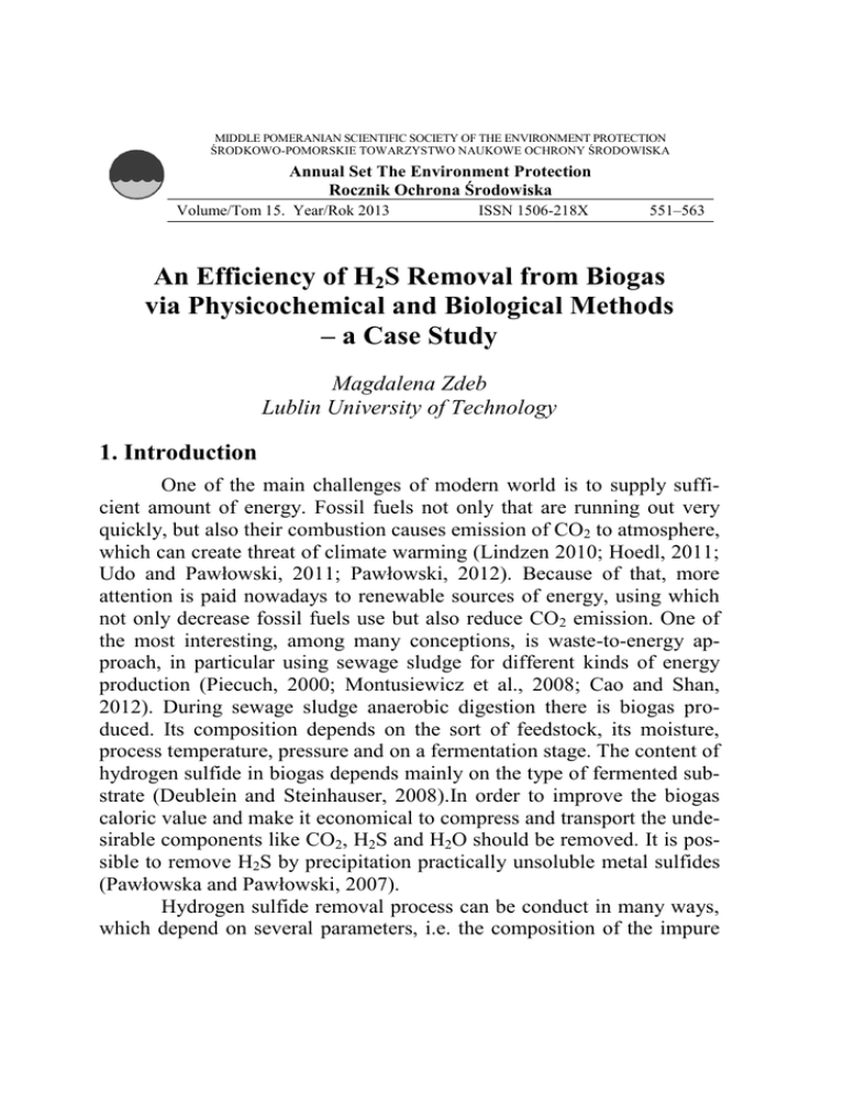 MIDDLE POMERANIAN SCIENTIFIC SOCIETY OF THE ENVIRONMENT PROTECTION ŚRODKOWO-POMORSKIE TOWARZYSTWO NAUKOWE OCHRONY ŚRODOWISKA Annual Set The Environment Protection Rocznik Ochrona Środowiska Volume/Tom 15. Year/Rok 2013 ISSN 1506-218X 551–563 An Efficiency of H2S Removal from Biogas via Physicochemical and Biological Methods – a Case Study Magdalena Zdeb Lublin University of Technology 1. Introduction One of the main challenges of modern world is to supply sufficient amount of energy. Fossil fuels not only that are running out very quickly, but also their combustion causes emission of CO2 to atmosphere, which can create threat of climate warming (Lindzen 2010; Hoedl, 2011; Udo and Pawłowski, 2011; Pawłowski, 2012). Because of that, more attention is paid nowadays to renewable sources of energy, using which not only decrease fossil fuels use but also reduce CO2 emission. One of the most interesting, among many conceptions, is waste-to-energy approach, in particular using sewage sludge for different kinds of energy production (Piecuch, 2000; Montusiewicz et al., 2008; Cao and Shan, 2012). During sewage sludge anaerobic digestion there is biogas produced. Its composition depends on the sort of feedstock, its moisture, process temperature, pressure and on a fermentation stage. The content of hydrogen sulfide in biogas depends mainly on the type of fermented substrate (Deublein and Steinhauser, 2008).In order to improve the biogas caloric value and make it economical to compress and transport the undesirable components like CO2, H2S and H2O should be removed. It is possible to remove H2S by precipitation practically unsoluble metal sulfides (Pawłowska and Pawłowski, 2007). Hydrogen sulfide removal process can be conduct in many ways, which depend on several parameters, i.e. the composition of the impure 552 Magdalena Zdeb gas, its pressure and temperature, sort and concentration of pollutants. Physical and chemical methods are regarded as less efficient because of high operating costs and high chemicals prices. Moreover, there are problems with byproducts of reactions disposal. The advantages of biological processes are low required capitals and absence of negative effects on atmosphere. One of the main factors influencing the biological process efficiency is temperature. Effective removal of most odours occurs in temperature range 20–40oC (Bohn, 1992; Yang and Allen, 1994; Zdeb and Pawłowska, 2009). In case of hydrogen sulfide, sometimes it is difficult to define what kind of elimination process occurs. The problem of H2S removal process nature was studied in few articles, but still is worth further examinations (Pawłowska et al., 2009). Suming up, biological methods seems to be the most attractive from other methods of odours removal. The wastewater treatment plant “Hajdów”near Lublin (Poland) is a mechanically-biological unit with an average daily flow about 60 000 m3/day. It produces 100 tons of mechanically dewatered sludge per day. The sewage sludge digestion is conducted at anaerobic digestors (each with a volume of 8 270 m3). As a result of a fermentation process, biogas containing some amounts of hydrogen sulfide is produced. The aim of this paper was to compare the efficiency of H2S removal from biogas conducted on the bog iron ore and in biological desulfurization station placed at the wastewater treatment plant “Hajdów”. 2. Materials and methods 2.1. Characteristic of biological desulfurization station In order to achieve an aim of the study, the data of 8 months’ time measurements conducted on the biological desulfurization station at the wastewater treatment plant “Hajdów” were analyzed. The station, working as a biotrickling filter for hydrogen sulfide removal, was examined in order to evaluate its desulfurization efficiency. A scheme of the station is presented in Fig. 1. The desulfurization installation replaced a bog iron ore, which was removed especially because of economical reasons. The raw bog iron ore costs and problems with spent material disposal were the most important negative factors resulted in such a decision. The measurements began when currently working setup started to operate, that is at the end of June 2008. An Efficiency of H2S Removal from Biogas via Physicochemical… 553 Fig. 1. Scheme of desulfurization station designed and constructed by AAT Abwasser und Abfalltechnik GmbH: 1 – biogas contaminated with hydrogen sulfide, 2 – air stream, 3 – desulfurization tower, 4 – H2S free biogas, 5 – process water, 6 – supernatant, 7 – flushing liquid, 8 – heat exchanger (AAT-Biogas Technology) Rys. 1. Schemat stacji desulfuryzacji zaprojektowanej i wykonanej przez AAT AbwasserundAbfalltechnik GmbH: 1 – biogaz zanieczyszczony siarkowodorem, 2 – strumień powietrza, 3 – wieża odsiarczalni, 4 – biogaz pozbawiony siarkowodoru, 5 – woda procesowa, 6 – roztwór płuczący, 7 – popłuczyny, 8 – wymiennik ciepła (AAT-Biogas Technology) The desulfurization tower (95 m3 volume) is made of polypropylene and filled with commercially available pall rings. Plastic pall rings serve as a large surface area basis for microbial growth and immobilization. The sulfur-oxidizing bacteria Thiobacillus (thiooxidans and thioparus) and Sulfolobus, are responsible for the biological hydrogen sulfide oxidation. There are extra media supplied to improve the H2S decomposition. The supernatant solution and small amount of fresh water (process water) are added mainly to flush the pall rings from sulfur and to provide the adequate moisture, pH and supply for the bacteria. The nutrients solution for the bacteria in a mineral fertilizer form is supplied continuously during day. Moreover, the nutrients solution is used as a pH level buffering factor. Warm water is lead to the system as a source of heat in order to maintain operating temperature on required level (28 to 32°C). The flushing liquid is brought in order to wash out H2S oxid