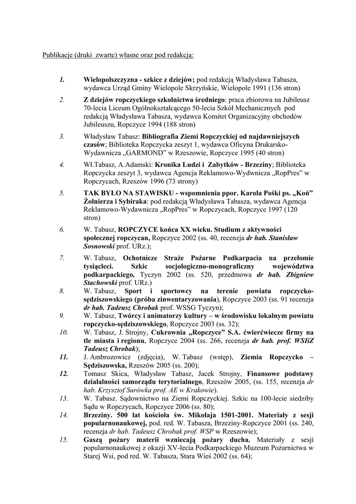 Publikacje (druki zwarte) własne oraz pod redakcją: 1. Wielopolszczyzna - szkice z dziejów; pod redakcją Władysława Tabasza, wydawca Urząd Gminy Wielopole Skrzyńskie, Wielopole 1991 (136 stron) 2. Z dziejów ropczyckiego szkolnictwa średniego: praca zbiorowa na Jubileusz 70-lecia Liceum Ogólnokształcącego 50-lecia Szkół Mechanicznych pod redakcją Władysława Tabasza, wydawca Komitet Organizacyjny obchodów Jubileuszu, Ropczyce 1994 (188 stron) 3. Władysław Tabasz: Bibliografia Ziemi Ropczyckiej od najdawniejszych czasów; Biblioteka Ropczycka zeszyt 1, wydawca Oficyna DrukarskoWydawnicza „GARMOND” w Rzeszowie, Ropczyce 1995 (40 stron) 4. Wł.Tabasz, A.Adamski: Kronika Ludzi i Zabytków - Brzeziny; Biblioteka Ropczycka zeszyt 3, wydawca Agencja Reklamowo-Wydwnicza „RopPres” w Ropczycach, Rzeszów 1996 (73 strony) 5. TAK BYŁO NA STAWISKU - wspomnienia ppor. Karola Pośki ps. „Koń” Żołnierza i Sybiraka: pod redakcją Władysława Tabasza, wydawca Agencja Reklamowo-Wydawnicza „RopPres” w Ropczycach, Ropczyce 1997 (120 stron) 6. W. Tabasz, ROPCZYCE końca XX wieku. Studium z aktywności społecznej ropczycan, Ropczyce 2002 (ss. 40, recenzja dr hab. Stanisław Sosnowski prof. URz.); 7. W. Tabasz, Ochotnicze Straże Pożarne Podkarpacia na przełomie tysiącleci. Szkic socjologiczno-monograficzny województwa podkarpackiego, Tyczyn 2002 (ss. 520, przedmowa dr hab. Zbigniew Stachowski prof. URz.) W. Tabasz, Sport i sportowcy na terenie powiatu ropczyckosędziszowskiego (próba zinwentaryzowania), Ropczyce 2003 (ss. 91 recenzja dr hab. Tadeusz Chrobak prof. WSSG Tyczyn); W. Tabasz, Twórcy i animatorzy kultury – w środowisku lokalnym powiatu ropczycko-sędziszowskiego, Ropczyce 2003 (ss. 32); W. Tabasz, J. Strojny, Cukrownia „Ropczyce” S.A. ćwierćwiecze firmy na tle miasta i regionu, Ropczyce 2004 (ss. 266, recenzja dr hab. prof. WSIiZ Tadeusz Chrobak); J. Ambrozowicz (zdjęcia), W. Tabasz (wstęp), Ziemia Ropczycko – Sędziszowska, Rzeszów 2005 (ss. 200); Tomasz Skica, Władysław Tabasz, Jacek Strojny, Finansowe podstawy działalności samorządu terytorialnego, Rzeszów 2005, (ss. 155, recenzja dr hab. Krzysztof Surówka prof. AE w Krakowie). W. Tabasz. Sądownictwo na Ziemi Ropczyckiej. Szkic na 100-lecie siedziby Sądu w Ropczycach, Ropczyce 2006 (ss. 80); Brzeziny. 500 lat kościoła św. Mikołaja 1501-2001. Materiały z sesji popularnonaukowej, pod. red. W. Tabasza, Brzeziny-Ropczyce 2001 (ss. 240, recenzja dr hab. Tadeusz Chrobak prof. WSP w Rzeszowie); Gaszą pożary materii wzniecają pożary ducha. Materiały z sesji popularnonaukowej z okazji XV-lecia Podkarpackiego Muzeum Pożarnictwa w Starej Wsi, pod red. W. Tabasza, Stara Wieś 2002 (ss. 64); 8. 9. 10. 11. 12. 13. 14. 15. 16. Barwy życia społeczności lokalnej, pod red. W. Tabasza, Ropczyce 2004, Drugie wydanie, (ss. 124, recenzja prof. nadzw. dr hab. inż. Jerzy Lewicki); 17. Tak było na Stawisku – wspomnienia ppor. Karola Pośki ps. „Koń” Żołnierza i Sybiraka, pod red. W. Tabasza, Ropczyce 2005, wydanie II, (ss. 120, recenzja prof. nadzw. dr hab. inż. Jerzy Lewicki); 18. Ekologia i Ochrona Środowiska, a wybrane aspekty rozwoju społecznogospodarczego. Pod redakcją Jana Krupy, Jacka Strojnego, Władysława Tabasz, Rzeszów 2005. 19. Rozwój lokalny. Wybrane zagadnienia społeczne. Pod redakcją Artura Grzesika, Władysława Tabasz, Rzeszów 2005, ss. 121 (recenzja prof. dr hab. Marian Malikowski). Artykuły popularnonaukowe: 1. Brzeziny /w:/ Wielopolszczyzna - szkice z dziejów; pod redakcją Władysława Tabasza, Wielopole 1991, s. 33-63 2. Glinik /w:/ Wielopolszczyzna - szkice z dziejów; pod redakcją Władysława Tabasza, Wielopole 1991, s. 65-80 3. Nawsie /w:/ Wielopolszczyzna - szkice z dziejów; pod redakcją Władysława Tabasza, Wielopole 1991, s. 81-94 4. Gimnazjum i Liceum Ogólnokształcące w latach 1923-1977 /w:/ . Z dziejów ropczyckiego szkolnictwa średniego: praca zbiorowa na Jubileusz 70-lecia Liceum Ogólnokształcącego 50-lecia Szkół Mechanicznych pod redakcją Władysława Tabasza, Ropczyce 1994, s. 7-25 5. Spółdzielczość bankowa na rzeszowszczyźnie /w:/ Stan i kierunki rozwoju spółdzielczości, Materiały z Międzynarodowej Konferencji Naukowej, Akademia Rolnicza im. Hugona Kołłątaja w Krakowie Filia w Rzeszowie Zakład Handlowej Obsługi Wsi i Rolnictwa, Redaktor naukowy Sylwester Makarski, Wydanie publikacji dofinansowane przez Komitet Badań Naukowych, Rzeszów 1995, s. 187-193 6. Cmentarzw Brzezinach - historia i teraźniejszość /w:/ Wł.Tabasz, A.Adamski: Kronika Ludzi i Zabytków - Brzeziny, Rzeszów 1996, s. 5-33 7. Sto lat brzezińskiej straży pożarnej /w:/ Wł.Tabasz, A.Adamski: Kronika Ludzi i Zabytków - Brzeziny, Rzeszów 1996, s. 5-33 8. Wpływ polityki kredytowej w latach 1985-1991 na rozwój indywidualnych gospodarstw rolnych - na przykładzie klientów Banku Spółdzielczego w Wielopolu Skrzyńskim /w:/ Ekonomiczno-organizacyjne uwarunkowania produkcji rolniczej na obszarze południowo-wschodniej Polski, Międzynarodowe Sympozjum Zespołu Energotechnologicznego Sekcji Mechanizacji Rolnictwa Komitetu Techniki Rolniczej Polskiej Akademii Nauk, Komitet Organizacyjny: Eugeniusz Machowski, Sylwester Makarski, Tadeusz Nowacki, Egeniusz Otoliński, Jan Szarek, Marek Smoleń, Marek Gaworski, Rzeszów-Jasło-Trzinica 1996, s. 535-540 9. Rzeszowski Bank Regionalny - nadzieje i obawy spółdzielczości bankowej /w:/ Ekonomiczno-organizacyjne uwarunkowania produkcji rolniczej na obszarze południowo-wschodniej Polski, Międzynarodowe Sympozjum Zespołu Energotechnologicznego Sekcji Mechanizacji Rolnictwa Komitetu Techniki Rolniczej Polskiej Akademii Nauk, Komitet Organizacyjny: Eugeniusz Machowski, Sylwester Makarski, Tadeusz Nowacki, Egeniusz Otoliński, Jan Szarek, Marek Smoleń, Marek Gaworski, Rzeszów-Jasło-Trzinica 1996, s. 541-546. 10. Wstęp /w:/ Józef Ambrozowicz: Album Ziemia Ropczycka; wydawca Agencja Wydawni