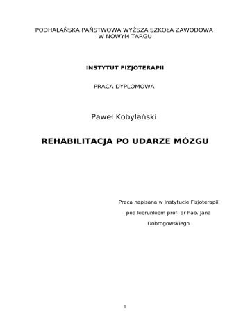 PODHALAŃSKA PAŃSTWOWA WYŻSZA SZKOŁA ZAWODOWA W NOWYM TARGU INSTYTUT FIZJOTERAPII PRACA DYPLOMOWA Paweł Kobylański REHABILITACJA PO UDARZE MÓZGU Praca napisana w Instytucie Fizjoterapii pod kierunkiem prof. dr hab. Jana Dobrogowskiego 1 Nowy Targ 2009 r. SPIS TREŚCI: Wstęp…………………………………………………………………………………………..3 Cel pracy……………………………………………………………………………………….4 Rozdział I. Udar mózgu………………………………………………………………………..5 1. Definicja i klasyfikacja udaru……………………………………………………...5 2. Etiologia i patofizjologia…………………………………………………………...6 2.1. Główne przyczyny udaru………………………………………………..6 2.2.Czynniki ryzyka………………………………………………………….7 3. Obraz kliniczny……………………………………………………………………..9 3.1. Obraz kliniczny udaru niedokrwiennego………………………………..9 3.1.1. Udar niedokrwienny zakrzepowy………………………….11 3.1.2. Udar niedokrwienny zatorowy……………………………..12 3.2. Obraz kliniczny udaru krwotocznego………………………………….15 3.2.1. Krwotok sródmózgowy……………………………………15 3.2.2. Krwotok podpajęczynówkowy………………………….…16 4. Skutki i następstwa udaru…………………………………………………………18 4.1. Porażenie i niedowład połowiczy……………………………………...18 4.2. Zaburzenie funkcji informatyczno-poznawczych………………..…….20 5. Diagnostyka w udarze mózgu…………………………………………………..…21 5.1. Badanie lekarskie………………………………………………………21 5.2. Badania obrazowe w udarze mózgu…………………………...……….23 5.3. Inne badania……………………………………………………………26 Rozdział II. Rehabilitacja po udarze mózgu……………………………………….…………27 1. Cele rehabilitacji………………………………………………………………….27 2. Kompleksowość postępowania po udarze mózgu…………………………..……28 3. Czynniki utrudniające rehabilitację………………………………………………30 4. Etapy rozwoju udaru…………………………………………………………..….31 4.1. Okres wstrząsu mózgowego…………………………………………...31 4.2. Okres hipotonii…………………………………………………….…..31 2 4.3. Normalizacja napięcia mięśniowego…………………………..………31 4.4. Okres hipertonii…………………………………………………..……32 5. Rehabilitacja w poszczególnych okresach leczenia udaru………………………..33 5.1. Okres wczesny szpitalny……………………………………………….33 5.1.1. Środki zapobiegające powikłaniom………………………..35 5.1.2. Uruchamianie pacjenta po udarze mózgu……………….....42 5.1.3. Pionizacja i związane z nią ćwiczenia…………………..…45 5.1.4. Zaopatrzenie ortopedyczne…………………………...……50 5.2. Okres wczesny ambulatoryjny lub przedłużonej rehabilitacjistacjonarnej………………………………………………52 5.3. Okres późny ambulatoryjny……………………………………...……57 6. Metody usprawniania po udarze………………………………………………....58 6.1. Proprioceptywne torowanie nerwowo-mięśniowe (PNF)……………..58 6.2. Koncepcja neurorozwojowa wg Bobath……………………………….60 Rozdział III. Rehabilitacja neuropsychologiczna………………………………………...…..63 Rozdział IV. Błędy w rehabilitacji……………………………………………………………64 Rozdział V. Profilaktyka po udarze mózgu……………………………………………….…67 Podsumowanie…………………………………………………………………………….….69 Spis treści………………………………………………………………………………..……70 Streszczenie………………………………………………………………………………...…?? Oświadczenie…………………………………………………………………………………?? 3 Wstęp. Główną przyczyną niepełnosprawności w krajach rozwiniętych jest udar mózgu. Stanowi on problem medyczny obciążający nie tylko osobę chorą, ale również osoby opiekujące się nią oraz pośrednio – poprzez koszty pomocy medycznej i socjalnej – całe społeczeństwo. O ile sam udar mózgu poprzez specyficzną dynamikę obrazu klinicznego i szybkość narastania objawów jest procesem trwającym niezbyt długo, o tyle jego następstwa i powikłania mogą towarzyszyć pacjentowi do końca życia. [34] Udar mózgu jest trzecią co do częstości przyczyną śmierci. Rocznie na świecie z powodu udaru umiera 4,6 mln ludzi, w tym 3,2 mln w krajach rozwijających się i 1,2 mln w krajach wysoko uprzemysłowionych. Śmiertelność w pierwszych trzech miesiącach od zachorowania wynosi około 20%, a przy ponownym udarze współczynnik śmiertelności jest wyższy o około 25% niż przy pierwszym udarze. Poza tym współczynnik ten jest zależny od przyczyny udaru: W krwawieniu śródczaszkowym jest trzykrotnie wyższy niż w udarze niedokrwiennym. Zapadalność na udary mózgu w Polsce kształtuje się na średnim europejskim poziomie (około 170/100 tysięcy ludności/rok), natomiast umieralność należy do jednej z najwyższych (80/100 tysięcy ludności/rok) i nie wykazuje 