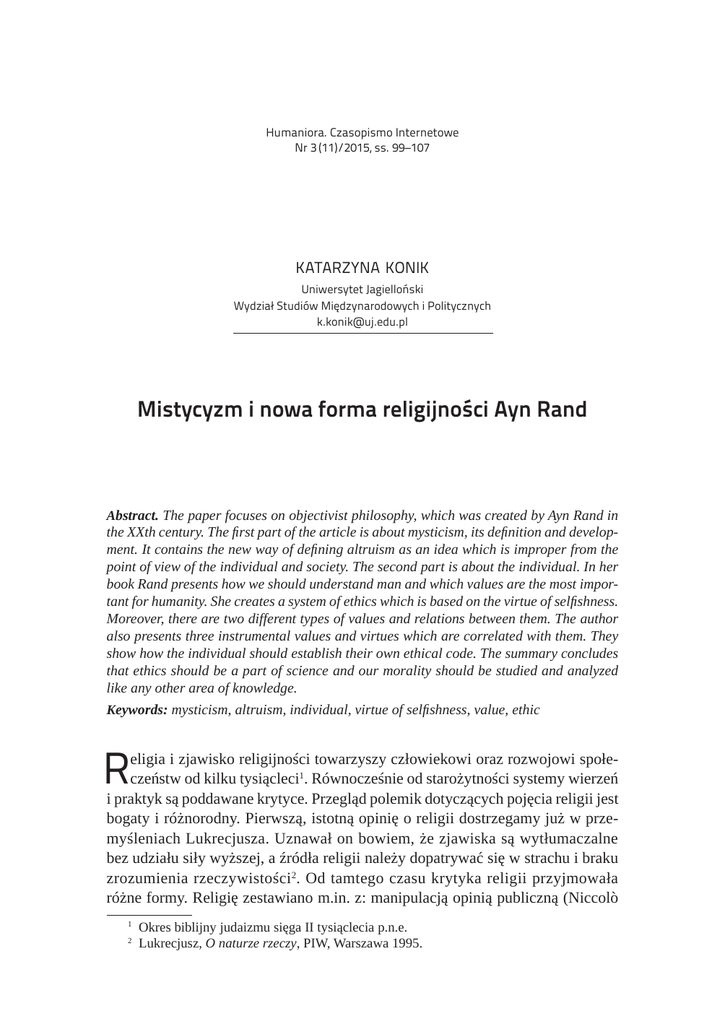 Humaniora. Czasopismo Internetowe Nr 3 (11)/2015, ss. 99–107 katarzyna konik Uniwersytet Jagielloński Wydział Studiów Międzynarodowych i Politycznych [email protected] Mistycyzm i nowa forma religijności Ayn Rand Abstract. The paper focuses on objectivist philosophy, which was created by Ayn Rand in the XXth century. The first part of the article is about mysticism, its definition and development. It contains the new way of defining altruism as an idea which is improper from the point of view of the individual and society. The second part is about the individual. In her book Rand presents how we should understand man and which values are the most important for humanity. She creates a system of ethics which is based on the virtue of selfishness. Moreover, there are two different types of values and relations between them. The author also presents three instrumental values and virtues which are correlated with them. They show how the individual should establish their own ethical code. The summary concludes that ethics should be a part of science and our morality should be studied and analyzed like any other area of knowledge. Keywords: mysticism, altruism, individual, virtue of selfishness, value, ethic R eligia i zjawisko religijności towarzyszy człowiekowi oraz rozwojowi społeczeństw od kilku tysiącleci1. Równocześnie od starożytności systemy wierzeń i praktyk są poddawane krytyce. Przegląd polemik dotyczących pojęcia religii jest bogaty i różnorodny. Pierwszą, istotną opinię o religii dostrzegamy już w przemyśleniach Lukrecjusza. Uznawał on bowiem, że zjawiska są wytłumaczalne bez udziału siły wyższej, a źródła religii należy dopatrywać się w strachu i braku zrozumienia rzeczywistości2. Od tamtego czasu krytyka religii przyjmowała różne formy. Religię zestawiano m.in. z: manipulacją opinią publiczną (Niccolò Okres biblijny judaizmu sięga II tysiąclecia p.n.e. Lukrecjusz, O naturze rzeczy, PIW, Warszawa 1995. 1 2 100 katarzyna konik Machiavelli), narzędziem rozładowywania cierpienia (Karol Marks), problematyką grzechu pierworodnego (Fryderyk Nietzsche) czy irracjonalnością (Richard Dawkins)3. Rozszerzanie się krytyki religii jest uzasadniane rozwojem nauki, gdyż większość wyznań religijnych miała na celu pełnienie funkcji eksplanacyjnej względem zjawisk nierozumianych4. Różnorakie podstawy krytyki spowodowały, że obecnie poszukuje się elementu mogącego religię zastąpić. Rolę tę przypisuje się nauce, filozofii bądź sztuce. Koncepcje takie prezentowane są przez Sama Harrisa, Christophera Hitchensa, Lawrencea Kraussa, Michela Onfraya czy Carla Sagana, którzy reprezentują kult rozumu oraz ideę ateizmu. W specyficzny sposób religię postrzegała Ayn Rand, której rozważania w kontekście mistycyzmu i religijności niejednokrotnie są pomijane przez naukowców5. Określając religię formą mistycyzmu, w swoich rozważaniach uwypukla negatywny wpływ systemu wierzeń na człowieka, jego życie i docelowo cały system społeczny. Promowała szczególną etykę opartą na racjonalnym myśleniu. Krytyka religii (zwłaszcza katolickiej) i jej pozycji we współczesnym świecie ukazuje, w jaki sposób współczesna jednostka powinna postrzegać samą siebie, a także jakich zjawisk, wynikających z religijności, unikać w swym działaniu. Podkreślając rolę rozumu i indywidualizmu, Ayn Rand tworzy nurt filozoficzny, który powinien stanowić fundament działalności ludzkiej i podstawę etyki. Tym samym kreuje postawę ateistyczną, w której celem i źródłem moralności staje się człowiek. Podważając pozytywne znaczenie religii, wypracowuje zasady zastępujące religijność, a tym samym postuluje zamianę wiary w Boga na wiarę w człowieka oraz przyznanie mu pełnej siły kreacyjnej i sprawczej. Ta antropocentryczna filozofia definiuje na nowo pojęcie cnoty, altruizmu, egoizmu, zasad moralnych, zachowań niemoralnych oraz przewiduje system gratyfikacji i karalności działań ludzkich. Analiza tak postrzeganej nowej formy religijności będzie bazować na omówieniu problemu mistycyzmu i jego aspektów w kontekście ludzkiej moralności oraz na prezentacji założeń filozofii mającej stać się podstawą działań świadomego człowieka. Ayn Rand wyróżniała trzy teorie etyczne o charakterze następczym: mistyczną, neomistyczną i relatywistyczną, z których każda cechuje się formą altruizmu, pomimo innego uzasadniania tejże postawy6. 3 N. Machiavelli, Książę, MT Biznes, Warszawa 2009; K. Marks, Przyczynek do krytyki heglowskiej filozofii prawa. Wstęp, Warszawa 2005, http://www.filozofia.uw.edu.pl/skfm/publikacje/marks04.pdf [12.05.2016]; F. Nietzsche, Tako rzecze Zaratustra, Wyd. vis-à-vis/Etiuda, Kraków 2010; R. Dawkins, Bóg urojony, CiS, Warszawa 2007. Nie jest to katalog zamknięty i pełny. Ma na celu ukazanie różnorodności krytyki religii. 4 D. Denett, Odczarowanie. Religia jako zjawisko naturalne, PIW, Warszawa 2008. Rozważania są motywowane postrzeganiem religii w kategoriach naukowych. 5 Ayn Rand jest twórczynią filozofii obiektywnej, niesłusznie przedstawianej jako nurt libertarianizmu. Dotychczasowe prace skupiają uwagę głównie na rozważaniach wokół pojęcia cnoty egoizmu. 6 A. Rand, Etyka absolutna, w: eadem, Cnota egoizmu, tłum. na podstawie wydania Oficyny Liberałów (Warszawa 1987), Wyd. Zysk i S-ka, Poznań 2000, s. 39. Mistycyzm i nowa forma religijności Ayn Rand 101 Koncepcja mistyczna zakłada, że człowiek nie jest zdolny do wykonywania narzuconego mu arbitralnie wzoru postępowania. Wzór postępowania pomyślany jest jako abstrakcyjna zasada, sterująca wyborami człowieka, realizująca cel ostateczny i kształtująca wartości oraz cele dalsze. Mistycyzm zakłada bowiem wzór życia, który narzucony człowiekowi, nie może zostać przez niego zrealizowany7. Brak możliwości realizacji wyznaczonego sposobu działania pozostawia w człowieku p
