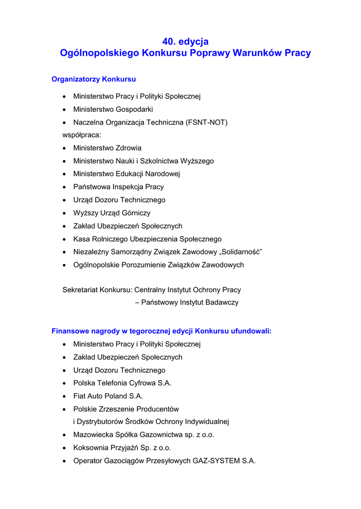 40. edycja Ogólnopolskiego Konkursu Poprawy Warunków Pracy Organizatorzy Konkursu Ministerstwo Pracy i Polityki Społecznej Ministerstwo Gospodarki Naczelna Organizacja Techniczna (FSNT-NOT) współpraca: Ministerstwo Zdrowia Ministerstwo Nauki i Szkolnictwa Wyższego Ministerstwo Edukacji Narodowej Państwowa Inspekcja Pracy Urząd Dozoru Technicznego Wyższy Urząd Górniczy Zakład Ubezpieczeń Społecznych Kasa Rolniczego Ubezpieczenia Społecznego Niezależny Samorządny Związek Zawodowy „Solidarność” Ogólnopolskie Porozumienie Związków Zawodowych Sekretariat Konkursu: Centralny Instytut Ochrony Pracy – Państwowy Instytut Badawczy Finansowe nagrody w tegorocznej edycji Konkursu ufundowali: Ministerstwo Pracy i Polityki Społecznej Zakład Ubezpieczeń Społecznych Urząd Dozoru Technicznego Polska Telefonia Cyfrowa S.A. Fiat Auto Poland S.A. Polskie Zrzeszenie Producentów i Dystrybutorów Środków Ochrony Indywidualnej Mazowiecka Spółka Gazownictwa sp. z o.o. Koksownia Przyjaźń Sp. z o.o. Operator Gazociągów Przesyłowych GAZ-SYSTEM S.A. Team Prevent Sp. z o.o. Pani Prezes Naczelnej Organizacji Technicznej FSNT- NOT ufundowała ponadto nagrody rzeczowe w postaci trzech rocznych prenumerat „Przeglądu Technicznego”. Wyniki 40. edycji Konkursu Kategoria: Rozwiązania techniczne i organizacyjne NAGRODA I STOPNIA Poprawa bezpieczeństwa pracy w górniczych wyrobiskach eksploatacyjnych poprzez wdrożenie systemu PECM z modułem Gather Autorzy: - Marek Jaszczuk, Stanisław Szweda, Józef Markowicz z Politechniki Śląskiej w Gliwicach; Wydział Górnictwa i Geologii; Instytut Mechanizacji Górnictwa - Joanna Rogala-Rojek, Dariusz Jenczmyk, Aleksander Piecha z Instytutu Techniki Górniczej KOMAG w Gliwicach - Jacek Stankiewicz, Marcin Szczurkowski, Michał Warzecha z ELSTA Sp. z o.o. w Wieliczce W polskim górnictwie dominującym systemem podziemnej eksploatacji pokładów węgla kamiennego jest system ścianowy, w którym podstawową rolę w zapewnianiu bezpieczeństwa załóg górniczych, spełniają sekcje obudowy zmechanizowanej. Ze względu na potrzebę ograniczania wydatków inwestycyjnych, co jest wymuszane sytuacją ekonomiczną, w zakładach wydobywczych powszechnym zjawiskiem było stosowanie starych i wyeksploatowanych sekcji ścianowych obudowy zmechanizowanej. Wiązało się to z ryzykiem, gdyż z reguły było brak danych dotyczących przebiegu ich eksploatacji. Obecne przepisy zobowiązują przeprowadzania regularnej dokumentowania eksploatacji. oceny użytkownika ich Ponieważ stanu tych urządzeń technicznego, dotychczas stosowane a do także systemy identyfikacji sekcji obudowy i jej elementów oraz sposoby sprawdzania przebiegu 2 ich użytkowania opierały się na tradycyjnych metodach, opracowano nowe, skuteczniejsze rozwiązanie. Nowe rozwiązanie polega na zastosowaniu technologii radiowej identyfikacji elektronicznej (RFID - Radio Frequency IDentification) do zdalnego odczytu danych zakodowanych w układach elektronicznych umieszczonych w poszczególnych elementach. Do odczytu danych został opracowany autorski elektroniczny system identyfikacji elementów sekcji obudowy zmechanizowanej PECM (Platforma Ewidencji Części Maszyn). Umożliwia on łatwe monitorowanie przebiegu i stopnia eksploatacji bardzo dużej liczby podstawowych elementów sekcji ścianowych obudów zmechanizowanych. Zastosowanie tego systemu umożliwia uzyskanie rzetelnych i wiarygodnych informacji o podstawowych elementach nośnych obudowy. Kompleksowe gromadzenie i przetwarzanie danych w systemie elektronicznym podnosi jakość procesu oceny stanu technicznego, co także ma wpływ na ograniczanie zagrożeń na stanowiskach pracy w kopalniach. Rozwiązanie zastosowano w 20 kopalniach, a ponadto stosują je wszyscy producenci zaopatrujący rynek krajowy w sekcje obudowy zmechanizowanej. Szacuje się, iż poprawa warunków pracy osiągnięta dzięki zastosowaniu niniejszego rozwiązania nastąpiła u ok. 6.000 osób. NAGRODA II STOPNIA Program „Zgłoś zagrożenie bezpieczeństwa” Autorzy: - Dariusz Loska, Przemysław Gostomski, Jan Płaza, Jan Szrajber, Leszek Majczyna, Mariusz Kondracki, Łukasz Stańczak z Polskiego Koncernu Naftowego ORLEN S.A. w Płocku Przeprowadzona w PKN Orlen wewnętrzna analiza istniejącego potencjału prewencyjnego wykazała niedostateczne wykorzystanie możliwości aktywnego przeciwdziałania wypadkom, katastrofom i awariom. Dlatego w 2011 r. został opracowany i wdrożony program pn. „Zgłoś zagrożenie bezpieczeństwa”, którego celem jest zwiększenie zaangażowania pracowników w dbałość o bezpieczeństwo swoje i osób współpracujących w firmie. System stanowi dodatkowy kanał komunikacji między pracownikami. W celu 3 umożliwienia skutecznego funkcjonowania został on umieszczony w wewnętrznej sieci Intranet Orlenu, jako odpowiedź na potrzeby pracowników dotyczące ułatwienia możliwości zgłaszania ewentualnych zagrożeń na stanowisku pracy. Program jest przyjazny dla użytkownika i łatwy w obsłudze. Zgłoszenia przekazywane przez pracowników drogą e-mailową trafiają do ich bezpośrednich przełożonych, a następnie do działu BHP. Tam zespół specjalistów analizuje problemy i wprowadza działania naprawcze (często przy współpracy ze zgłaszającym lub jego kierownikiem), w celu wyeliminowania zagrożenia. Założeniem programu jest szybkie reagowanie na zgłoszenia i rozwiązywanie co najmniej 80% zasygnalizowanych problemów w ciągu maksymalnie jednego miesiąca. Nowe rozwiązanie ułatwia wszystkim pracownikom identyfikację i umożliwia monitorowanie nowo pojawiających się zagrożeń oraz zwiększa ich zaangażowanie w identyfikację zagrożeń i proponowanie działań naprawczych i zapobiegawczych. Program wdrożono w PKN Orlen S.A. na 100 wydziałach produkcyjnych, a jego zasięgiem objęto ponad 4.000 pracowników. Program jest wdrażany w spółkach Grupy Kapitałowej. Po wdrożeniu rozwiąza