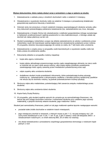 Wykaz dokumentów, które należy złożyć wraz z wnioskiem o ulgę w opłacie za studia: 1. Zaświadczenie z zakładu pracy o średnich dochodach netto z ostatnich 3 miesięcy. 2. Oświadczenie o wysokości dochodu netto za ostatnie 3 miesiące z prowadzonej działalności gospodarczej opatrzone klauzulą o karalności. 3. Odcinek renty lub emerytury z trzech ostatnich miesięcy poprzedzających złożenie wniosku albo inny dokument potwierdzający pobierane świadczenia (np. zaświadczenie zus, krus, decyzja). 4. Zaświadczenie z Urzędu Gminy lub oświadczenie o wielkości gospodarstwa rolnego wyrażonego w hektarach przeliczeniowych ogólnej powierzchni w roku kalendarzowym, z którego ustala się dochód lub nakaz płatniczy za ten rok. 5. Student posiadający rodzeństwo uczące się składa zaświadczenie ze szkoły o pobieraniu przez rodzeństwo nauki lub kserokopie ważnej legitymacji lub oświadczenie podpisane przez rodzica. W przypadku dziecka nieuczęszczającego do szkoły (w wieku do 7 lat) ksero aktu urodzenia. 6. Zaświadczenie z urzędu pracy w przypadku osób bezrobotnych o wysokości zasiłku netto lub braku prawa do pobierania zasiłku. 7. Dokumenty składne w przypadku rodziny niepełnej: kopia aktu zgonu rodzica/ów; kopia odpisu aktualnego prawomocnego wyroku sądu zasądzającego alimenty na rzecz osób w rodzinie lub na rzecz osób spoza rodziny, albo kopię odpisu protokołu posiedzenia zawierającego treść ugody zawartej przed mediatorem potwierdzonej przez sąd; odpis zupełny aktu urodzenia studenta; dodatkowo student może przedstawić dokumenty, które poświadczają trudną sytuację rodzinną np.: zaświadczenie o otrzymywaniu zasiłków z ośrodka pomocy społecznej (zasiłków nie wlicza się do dochodu rodziny, są jednak poświadczeniem trudnej sytuacji). 8. Skrócony odpis aktu małżeństwa, potwierdzający fakt zawarcia związku małżeńskiego przez studenta. 9. Skrócony odpis aktu urodzenia dzieci studenta. 10. Kopie Karty Dużej Rodziny. 11. W przypadku, gdy student spełnia warunki do uznania go za samodzielnego finansowo, nie bierze się pod uwagę dochodów rodziców i rodzeństwa studenta przy ustalaniu jego sytuacji materialnej, a jedynie dochody własne studenta, jego małżonka i dzieci. Student jest samodzielny finansowo, jeżeli on lub jego małżonek spełnia łącznie następujące warunki: posiadał stałe źródło dochodów w ostatnim trzech miesiącach; jego miesięczny dochód w okresach, o których mowa w pkt 1 i 2, nie jest mniejszy niż 1,30 sumy kwot określonych w art. 5 ust. 1 i art. 6 ust. 2 pkt 3 ustawy z dnia 28 listopada 2003 r. o świadczeniach rodzinnych ( w chwili obecnej 850, 20 zł netto na rodzinę); nie złożył oświadczenia o prowadzeniu wspólnego gospodarstwa domowego z rodzicami bądź jednym z nich