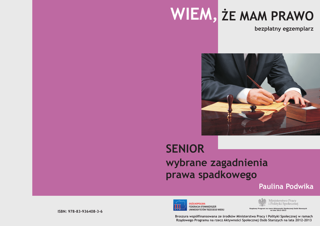 WIEM, ŻE MAM PRAWO bezpłatny egzemplarz SENIOR wybrane zagadnienia prawa spadkowego Paulina Podwika Ministerstwo Pracy i Polityki Społecznej ISBN: 978-83-936408-3-6 Rządowy Program na rzecz Aktywności Społecznej Osób Starszych na lata 2012-2013 Broszura współfinansowana ze środków Ministerstwa Pracy i Polityki Społecznej w ramach Rządowego Programu na rzecz Aktywności Społecznej Osób Starszych na lata 2012-2013 WIEM, ŻE MAM PRAWO SENIOR wybrane zagadnienia prawa spadkowego Paulina Podwika Nowy Sącz, grudzień 2013 OPRACOWANIE: Paulina Podwika WYDAWCA: Ogólnopolska Federacja Stowarzyszeń Uniwersytetów Trzeciego Wieku ADRES WYDAWCY: ul. Jagiellońska 18, 33-300 Nowy Sącz, tel./fax (+48 18) 443 57 08 e-mail: [email protected] www.federacjautw.pl KOREKTA: Joanna Jachimowicz ZDJĘCIE NA OKŁADCE: prawa autorskie -© Iurii Sokolov - Fotolia.com skład i druk: Drukarnia NOWODRUK s.c. tel. (+48 18) 443 56 69 ISBN: 978-83-936408-3-6 NAKŁAD: 2000 sztuk Egzemplarz bezpłatny Broszura współfinansowana ze środków Ministerstwa Pracy i Polityki Społecznej w ramach Rządowego Programu na rzecz Aktywności Społecznej Osób Starszych na lata 2012-2013 2 SPIS TREŚCI: I. Wybrane definicje................................................................... 5 II. Skład spadku......................................................................... 5 III.Dziedziczenie........................................................................ 7 1/ ustawowe - krąg spadkobierców ustawowych............................... 7 2/ testamentowe.................................................................. 12 a/ rodzaje testamentów...................................................... 12 b/ odwołanie testamentu.................................................... 19 c/ niegodność dziedziczenia................................................. 20 IV. Przyjęcie i odrzucenie spadku. Odpowiedzialność za długi spadkowe... 21 3 4 I. WYBRANE DEFINICJE 1) spadek - ogół praw i obowiązków majątkowych należących do spadkodawcy w chwili jego śmierci i przechodzących na jego następców prawnych, 2) spadkodawca - osoba fizyczna, której prawa i obowiązki majątkowe o charakterze cywilnoprawnym przechodzą po jej śmierci na następców prawnych, 3) spadkobierca - podmiot (osoba fizyczna, prawna, jednostka organizacyjna), na który przechodzi ogół praw i obowiązków osoby zmarłej, 4) otwarcie spadku - zdarzenie, które powoduje, że wszystkie prawa i obowiązki, które do tej pory przysługiwały zmarłemu, przechodzą na jego spadkobierców. Chwilą otwarcia spadku jest chwila śmierci spadkodawcy, 5) testament - dokument zawierający oświadczenie ostatniej woli spadkodawcy, 6) testator - osoba, która rozporządza majątkiem na wypadek śmierci, 7) zachowek - roszczenie o zapłatę określonej sumy pieniężnej przysługujące zstępnym, małżonkowi i rodzicom spadkodawcy na wypadek pominięcia ich przez spadkodawcę w testamencie - względem spadkobierców powołanych do dziedziczenia. II. SKŁAD SPADKU Chwila śmierci spadkodawcy przesądza o składzie majątku spadkowego. Na spadkobierców przechodzą bowiem tylko te prawa i obowiązki, których podmiotem był spadkodawca w chwili śmierci, a które nie wygasły. 5 PRZYKŁAD Odziedziczyć możemy zatem np.: prawo własności nieruchomości i rzeczy ruchomych (samochód, dzieło sztuki, biżuterię), udział we współwłasności, prawo użytkowania wieczystego, spółdzielcze własnościowe prawo do lokalu mieszkalnego, wierzytelności, prawa i obowiązki związane ze stosunkiem pracy zmarłego pracownika, roszczenie o zapłatę zaległych rat renty, które były wymagalne przed śmiercią spadkodawcy, prawa wynikające z dostarczania środków utrzymania lub wychowania przez osobę niebędącą do tego zobowiązaną lub zobowiązaną w dalszej kolejności, prawo do patentu, prawo odkupu i pierwokupu. Nie wchodzą więc w skład spadku prawa i obowiązki: a/ o charakterze administracyjnoprawnym (np. zezwolenie), karnoprawnym (np. obowiązek zapłaty grzywny lub mandatu) oraz finansowoprawnym (np. podatki). Wyjątek od tej zasady stanowi prawo podatnika do zwrotu nadpłaty podatku dochodowego przechodzące na jego spadkobierców, b/ o charakterze niemajątkowym, tj. prawa i obowiązki osobiste (np. roszczenia o zadośćuczynienie za wyrządzoną krzywdę, chyba że za życia spadkodawcy roszczenie zostało uznane na piśmie lub za życia spadkodawcy (poszkodowanego) wytoczono powództwo o to roszczenie oraz prawa i obowiązki rodzinne (np. prawo do ustalenia ojcostwa, żądanie rozwodu lub unieważnienia małżeństwa), c/ prawa i obowiązki ściśle związane z osobą spadkodawcy, np. prawo do alimentacji i obowiązek alimentacyjny, służebność osobista, prawo do renty przyznanej w związku z uszkodzeniem ciała lub wywołaniem rozstroju zdrowia, uprawnienie do odwołania darowizny, d/ przechodzące na określone osoby, niezależnie od tego, czy są spadkobiercami, np. prawo najmu lokalu mieszkalnego, spółdzielcze lokatorskie prawo do lokalu mieszkalnego, uprawnienia z tytułu umowy ubezpieczenia, tzw. zapis bankowy. 6 WAŻNE W razie śmierci najemcy lokalu mieszkalnego, w stosunek najmu lokalu wstępują: małżonek niebędący współnajemcą lokalu, dzieci najemcy i jego współmałżonka, inne osoby, wobec których najemca był obowiązany do świadczeń alimentacyjnych, oraz osoba, która pozostawała faktycznie we wspólnym pożyciu z najemcą. Warunkiem wstąpienia w stosunek najmu lokalu mieszkalnego jest stałe zamieszkiwanie z najemcą w tym lokalu do chwili jego śmierci. W przypadku braku osób uprawnionych, stosunek najmu lokalu mieszkalnego wygasa (art. 691 kodeksu cywilnego). Wnuk zmarłego najemcy nie należy do osób wymienionych w art. 691 § 1 kodeksu cywilnego także wtedy, gdy łączyła go z najemcą więź gospodarcza i uczuciowa1. Z kolei osobą bliską dla zmarłego najemcy jest m.in. konkubent2.