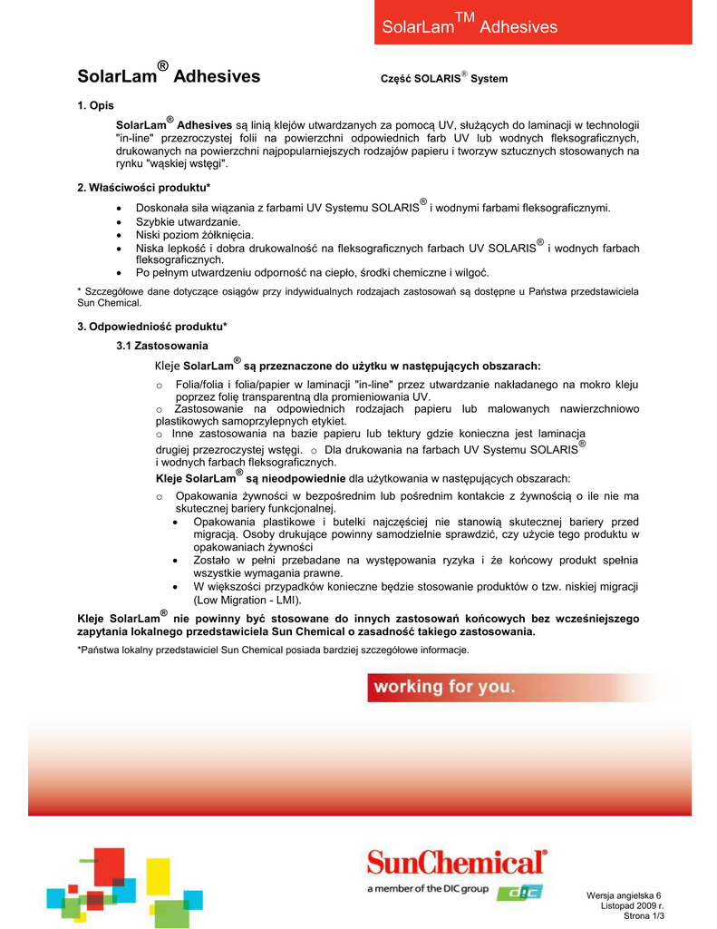 SolarLam ® SolarLam Adhesives TM Adhesives ® Część SOLARIS System 1. Opis ® SolarLam Adhesives są linią klejów utwardzanych za pomocą UV, służących do laminacji w technologii "in-line" przezroczystej folii na powierzchni odpowiednich farb UV lub wodnych fleksograficznych, drukowanych na powierzchni najpopularniejszych rodzajów papieru i tworzyw sztucznych stosowanych na rynku "wąskiej wstęgi". 2. Właściwości produktu* ® Doskonała siła wiązania z farbami UV Systemu SOLARIS i wodnymi farbami fleksograficznymi. Szybkie utwardzanie. Niski poziom żółknięcia. ® Niska lepkość i dobra drukowalność na fleksograficznych farbach UV SOLARIS i wodnych farbach fleksograficznych. Po pełnym utwardzeniu odporność na ciepło, środki chemiczne i wilgoć. * Szczegółowe dane dotyczące osiągów przy indywidualnych rodzajach zastosowań są dostępne u Państwa przedstawiciela Sun Chemical. 3. Odpowiedniość produktu* 3.1 Zastosowania ® Kleje SolarLam są przeznaczone do użytku w następujących obszarach: Folia/folia i folia/papier w laminacji "in-line" przez utwardzanie nakładanego na mokro kleju poprzez folię transparentną dla promieniowania UV. o Zastosowanie na odpowiednich rodzajach papieru lub malowanych nawierzchniowo plastikowych samoprzylepnych etykiet. o Inne zastosowania na bazie papieru lub tektury gdzie konieczna jest laminacja ® drugiej przezroczystej wstęgi. o Dla drukowania na farbach UV Systemu SOLARIS i wodnych farbach fleksograficznych. ® Kleje SolarLam są nieodpowiednie dla użytkowania w następujących obszarach: o o Opakowania żywności w bezpośrednim lub pośrednim kontakcie z żywnością o ile nie ma skutecznej bariery funkcjonalnej. Opakowania plastikowe i butelki najczęściej nie stanowią skutecznej bariery przed migracją. Osoby drukujące powinny samodzielnie sprawdzić, czy użycie tego produktu w opakowaniach żywności Zostało w pełni przebadane na występowania ryzyka i że końcowy produkt spełnia wszystkie wymagania prawne. W większości przypadków konieczne będzie stosowanie produktów o tzw. niskiej migracji (Low Migration - LMI). ® Kleje SolarLam nie powinny być stosowane do innych zastosowań końcowych bez wcześniejszego zapytania lokalnego przedstawiciela Sun Chemical o zasadność takiego zastosowania. *Państwa lokalny przedstawiciel Sun Chemical posiada bardziej szczegółowe informacje. Wersja angielska 6 Listopad 2009 r. Strona 1/3 SolarLam TM Adhesives 3.2 Podłoże ® Kleje SolarLam są odpowiednie dla większości rodzajów etykiet stosowanych w druku wąskowstęgowym. Dla podłóż plastikowych niepokrywanych nawierzchniowo rekomendowana jest obróbka koronowa w celu zapewnienia odpowiedniego poziomu obróbki 38-44 Dynes/cm, lecz przed rozpoczęciem druku komercyjnego powinno się dokonać wstępne testy. Biorąc pod uwagę znaczące różnice występujące pomiędzy różnymi rodzajami podłoży, osoby odpowiedzialne za druk powinny kierować się szczegółowymi wytycznymi producenta podłoża i zrealizować wszelkie konieczne testy przed rozpoczęciem komercyjnego drukowania. Druga nałożona wstęga powinna być transparentna dla światła UV by pozwolić na prawidłowe utrwalenie mokrego kleju znajdującego się poniżej. W większości przypadków odpowiednie są przezroczyste folie polipropylenowe i cienkie folie poliestrowe. W celu zwiększenia siły wiązania przydatna może być obróbka koronowa drugiej warstwy w celu poprawienia nawodnienia i przywieralności kleju. * Państwa lokalny przedstawiciel Sun Chemical posiada bardziej szczegółowe informacje. 4. Bezpieczeństwo, zdrowie i środowisko ® Kleje SolarLam powinny być stosowane w warunkach odpowiadającym ogólnie stosowanej higienie przemysłowej. Informacje znajdują się na etykietach produktów i odpowiednich Kartach Charakterystyki Produktów. Więcej informacji dotyczących postępowania z materiałami UV znajduje się w broszurze opublikowanej przez Brytyjski Komitet Doradczy Przemysłu Drukarskiego pt. "Safety in the use of inks, varnishes and lacquers cured by ultra violet light’’ (POL. Bezpieczne użytkowanie farb, werniksów i lakierów utwardzanych światłem ultrafioletowym). 4.1 Składowanie ® Kleje SolarLam dostarczane są w 5 kilogramowych czarnych plastikowych puszkach. Okres przydatności do użycia wynosi, co najmniej 12 miesięcy od dat produkcji, w przypadku przechowywania w oryginalnych pojemnikach w temperaturze od 5 do 25°C i przy ochronie przed bezpośrednim światłem słonecznym, lecz produkt może być przydatny do użycia przez dłuższy okres. 4.2 Utylizacja odpadów Przy utylizacji odpadów związanych z produkcją drukarską należy zachować ostrożność. Utylizacja powinna być realizowana zgodnie z branżowymi dobrymi praktykami oraz zgodnie ze wszystkimi obowiązującymi lokalnymi wytycznymi i regulacjami prawnymi. Więcej informacji znajduje się na Karcie Charakterystyki Produktu. 5. Warunki druku 5.1 Lepkość druku ® Kleje SolarLam dostarczane są w formie gotowej do użycia i nie powinny wymagać ingerencji niezależnie czy stosowane są w systemach zamkniętych czy otwartych. 5.2 Zmywanie Dostępnych jest duża ilość środków odpowiednich dla farb UV oraz różnych składników systemów drukowania jak płyty fleksograficzne i orurowanie. Prosimy o kontakt z służbami technicznymi Sun Chemical lub też Państwa lokalnym przedstawicielem Sun Chemical w celu uzyskania rekomendacji i porady. 5.3 Formy i rolki ® Kleje SolarLam zaprojektowane zostały do współpracy z formami foto polimerowymi, które są powszechnie używane w tej branży. W przypadku użycia tego produktu wszystkie rolki, rurki i uszczelniacze muszą być odporne na materiały UV. Wersja angielska 6 Listopad 2009 r. Strona 2/3 Kleje SolarLam TM 5.4 Czynniki wpływające na końcową siłę łączenia o rodzaj i grubość podłoża. o poziom energii powierzchniowej i typ obu podłoży o przyleganie farb do baz