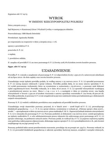 Sygnatura akt I C 19/15 WYROK W IMIENIU RZECZYPOSPOLITEJ POLSKIEJ Dnia 5 sierpnia 2015 r. Sąd Rejonowy w Kamiennej Górze I Wydział Cywilny w następującym składzie: Przewodniczący: SSR Marek Dziwiński Protokolant: Agnieszka Hadała po rozpoznaniu na rozprawie w dniu 5 sierpnia 2015 r. w K. sprawy z powództwa P. S. przeciwko S. P. (1) o zapłatę I powództwo oddala; II zasądza od powódki P. S. na rzecz pozwanego S. P. (1) kwotę 1218,78 zł tytułem zwrotu kosztów procesu. Sygn. akt I C 19/15 UZASADNIENIE Powódka P. S. wniosła o zasądzenie od pozwanego S. P. (1) odpowiednio kwoty 1.530,00 zł z ustawowymi odsetkami od 29 lipca 2012r. do dnia zapłaty oraz zwrotu kosztów procesu. Uzasadniając swoje żądanie powódka podała, że według umowy z 25 czerwca 2011r. F. G. (1) sprzedał pozwanemu S. P. (1) szereg maszyn rolniczych i sprzęt rolniczy. Powódka podała dalej, że na mocy umowy sprzedaży F. G. (1) wydał pozwanemu ruchomości, które są wymienione w zestawieniu z 25.06.2011r., a pozwany miał dokonać wpłat uzgodnionych kwot. Powódka wskazała, że w dniu 18.07.2012r. F. G. (1) sprzedał wierzytelność wynikającą z przedmiotowej umowy na rzecz Biura (...) sp. z o.o. w L. a następnie w dniu 10 września 2012r. ona kupiła wierzytelność w kwocie 1.530,00 zł tytułem roszczenia z umowy sprzedaży rozrzutnika F. (na kwotę 18.500,00 zł). Powódka podniosła, że pozwany S. P. (1) nie uregulował na jej rzecz należności mimo powiadomienia go o dokonanych cesjach wierzytelności. Pozwany S. P. (1) wniósł o oddalenie powództwa oraz zasądzenia od powódki kosztów procesu. Uzasadniając swoje stanowisko pozwany przyznał, że w latach 2007 – 2008 kupił od F. G. (1), prowadzącego działalność gospodarczą – (...) – F. G. (1), sprzęt rolniczy, wymieniony w wykazie pt. „Pobrany sprzęt z dnia 2007r., 2008r.” – sporządzonym w dniu 25 czerwca 2011r. przez małżonkę F. M. G.. Zaprzeczył jednak istnieniu wierzytelności F. G. (1) w stosunku do pozwanego S. P. (1). Pozwany podniósł, że dokument z 25 czerwca 2011r. został sporządzony na żądanie małżonków P. w celu udokumentowania prawa własności do nabywanego przez pozwanego od F. G. (1) sprzętu rolniczego, na podstawie ustnych umów. Pozwany podał, że rozliczył się z F. G. (1) poprzez częściową zapłatę ceny gotówką a także poprzez odpracowanie, dokonując napraw sprzętu F. G. (1) w przedsiębiorstwie w K., jak również znajdującego się na jego posesji we W.. Pozwany podniósł także zarzut przedawnienia roszczenia, powołując się na przepis art. 554 k.c. Pozwany wskazał, że F. G. (1) prowadził działalność gospodarczą w zakresie sprzedaży hurtowej maszyn, urządzeń i narzędzi rolniczych, w związku z tym roszczenia z tytułu sprzedaży dokonanej w zakresie takiej działalności gospodarczej podlegają, na podstawie wymienionego wyżej przepisu, dwuletniemu przedawnieniu. Sąd ustalił następujący stan faktyczny: Pozwany S. P. (1) w latach 2007 – 2008r. nabył od F. G. (1), prowadzącego działalność gospodarczą pod firmą (...) w zakresie sprzedaży maszyn, urządzeń i narzędzi rolniczych, szereg maszyn i sprzętu rolniczego m. in. rozrzutnik F. za kwotę 18.500,00 zł. /dowód: zestawienie z 25.06.2011r. k – 8, decyzja o wykreśleniu wpisu ewidencji działalności gospodarczej k – 35 i lista ogłoszeń w gazeci e A. (...). k – 53-58 / Za część rzeczy pozwany płacił gotówką, m.in. za rozrzutnik F., a za część zapłata następowała w postaci równowartości pracy świadczonej przez S. P. (1) na rzecz firmy (...). Pozwany, będący ślusarzem – mechanikiem, dokonywał napraw sprzętu F. G. (1) przeznaczonego na sprzedaż, wykonując tę pracę w siedzibie przedsiębiorstwa w K. oraz siebie w domu we W., gdzie składowana była część maszyn i narzędzi należących do F. G. (1). /dowód: zeznania świadków E. G. – k – 184 odwrót-185, M. P. – k – 184, R. P. – k – 198-199, kserokopia zeszytu – k – 36-43 , zeznania pozwanego S. P. hciarza złożone na rozprawie w dniu 5 sierpnia 2015 r. / Uzgodniona pomiędzy F. G. (1) i S. P. (1) stawka wynosiła 20,00 zł za godzinę pracy. W okresie od 2007r. do 2011r. pozwany wykonał pracę na rzecz przedsiębiorstwa pozwanego przez 2.515 godzin , nie otrzymując pieniędzy. Zapłata za prace następowała w formie odbierania przez S. P. (1) maszyn i narzędzi rolniczych. /dowód: zeznan ia świadków E. G. – k – 184 odwrót-185, R. P. – k – 198-199, kserokopia zeszytu – k – 36-43 , zeznania pozwanego S. P. złożone na rozprawie w dniu 5 sierpnia 2015 r./ Po wcześniejszym okresie bardzo dobrych stosunków pomiędzy rodzinami G. i P., wystąpiły nieporozumienia na tle wzajemnych rozliczeń. W dniu 25 czerwca 2011r. w domu pozwanego, z jego inicjatywy, doszło do spotkania, którego celem było m. in. sporządzenie zestawienia maszyn i urządzeń nabytych przez S. P. (1) od F. G. (1) w latach 2007 -2008. Wykaz ten pisała M. G. pod dyktando jej męża. Został tam użyty zapis, że F. G. (1) sprzedaje „na płatność” określone maszyny i urządzenia. W zestawieniu tym znalazły się następujące maszyny i sprzęt rolniczy: - rozsiewacz 1.750,00 zł, - podnośnik 750,00 zł, - ceownik, rura, sznurek, kostka 290,00 zł, - żmijka na kłos 250,00 zł, - wiertarka 600,00 zł, - sprężarka 850,00 zł, - ściągacz 300,00 zł, - rozrzutnik forszit 18.500,00 zł, - samozbierająca 8.500,00 zł, - waga 1 t 1.700,00 zł, - siewnik 6.500,00 zł, - zbiornik 30 t lit 3.800,00 zł, - opony 500,00 zł, - przęsła 540,00 zł. W zestawieniu znalazł się również zapis o odliczeniu słomy P. P. 1.500,00 zł. Wykaz powyższy został podpisany przez F. G. (1) i S. P. (1). /dowód: zestawienie z 25 czerwca 2011r. – k – 8, zeznania świadka R. P. – k – 198-199, zeznani a pozwanego S. P. złożone na rozprawie w dniu 5 sierpnia 2015 r./ Umową przelewu wierzyte