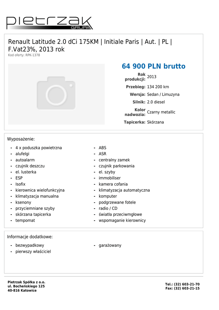 Renault Latitude 2.0 dCi 175KM | Initiale Paris | Aut. | PL | F.Vat23%, 2013 rok Kod oferty: RPK-1378 64 900 PLN brutto Rok 2013 produkcji: Przebieg: 134 200 km Wersja: Sedan / Limuzyna Silnik: 2.0 diesel Kolor Czarny metallic nadwozia: Tapicerka: Skórzana Wyposażenie: - 4 x poduszka powietrzna alufelgi autoalarm czujnik deszczu el. lusterka ESP Isofix kierownica wielofunkcyjna klimatyzacja manualna ksenony przyciemniane szyby skórzana tapicerka tempomat - ABS ASR centralny zamek czujnik parkowania el. szyby immobiliser kamera cofania klimatyzacja automatyczna komputer podgrzewane fotele radio / CD światła przeciwmgłowe wspomaganie kierownicy Informacje dodatkowe: - bezwypadkowy - pierwszy właściciel Pietrzak Spółka z o.o. ul. Bocheńskiego 125 40-816 Katowice - garażowany Tel.: (32) 603-21-70 Fax: (32) 603-21-15
