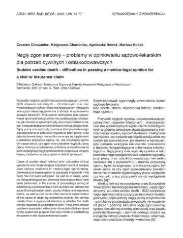 ARCH. MED. SĄD. KRYM., 2007, LVII, 72-77 Sprawozdanie z konferencji Czesław Chowaniec, Małgorzata Chowaniec, Agnieszka Nowak, Mariusz Kobek Nagły zgon sercowy – problemy w opiniowaniu sądowo-lekarskim dla potrzeb cywilnych i odszkodowawczych Sudden cardiac death – difficulties in passing a medico-legal opinion for a civil or insurance claim Z Katedry i Zakładu Medycyny Sądowej Śląskiej Akademii Medycznej w Katowicach Kierownik: prof. dr hab. n. med. Zofia Olszowy Przypadki nagłych zgonów bez poprzedzających uchwytnych objawów klinicznych – chorobowych oraz bez wyraźniejszych wykładników morfologicznych w badaniu sekcyjnym stwarzają poważne trudności w opiniowaniu sądowo-lekarskim. Praktycznie niemożliwe jest opracowanie opinii jeśli sekcja zwłok nie została przeprowadzona, jak również w sytuacjach gdy nie przeprowadzono badań histopatologicznych i chemiczno-toksykologicznych. Sądy pracy oraz wydziały cywilne w toku prowadzonego postępowania o ustalenie wypadku przy pracy oraz odszkodowawczego nierzadko zwracają się z pytaniami o ustalenie przyczyny zgonu, np. czy przyczyną zgonu był zawał serca, czy zgon miał charakter wypadku przy pracy. Autorzy przedstawiają problemy opiniodawcze na jakie napotykają biegli jednocześnie proponują przyjęty własny model konstrukcji opinii w takich sprawach. Cases of sudden death without prior noticeable clinical symptoms and morphological indicators found at autopsy pose serious problems in medico-legal opinionating. Developing an expert opinion is practically impossible if the body has not been autopsied, as well as in cases, when no histopathological and chemical-toxicological tests have been performed. In the course of proceedings aiming at establishing a given event as a work accident and address the issue of compensation claim, courts of labor and insurance claims, as well as civil courts often demand determination of the cause of death by answering whether the demise resulted from a myocardial infarction or whether the death may be regarded as an accident at work. The authors present problems associated with opinion formulation that are faced by the expert and propose their own model of establishing an opinion in the above mentioned cases Słowa kluczowe: zgon nagły, zawał serca, opinia sądowo-lekarska Key words: death, myocardial infarct, medicolegal opinion Przypadki nagłych zgonów bez poprzedzających uchwytnych objawów klinicznych – chorobowych oraz bez wyraźniejszych wykładników morfologicznych w badaniu sekcyjnym stwarzają poważne trudności w opiniowaniu sądowo-lekarskim. Praktycznie niemożliwe jest wydanie opinii jeśli sekcja zwłok nie została przeprowadzona, jak również w sytuacjach gdy badanie sekcyjne nie zostało poszerzone o badania histopatologiczne i chemiczno-toksykologiczne. Sądy pracy oraz wydziały cywilne w toku prowadzonego postępowania o ustalenie wypadku przy pracy oraz odszkodowawczego nierzadko zwracają się z pytaniami o ustalenie przyczyny zgonu, bywa że sugerując, iż przyczyną zgonu był zawał serca, to czy zgon spowodowany zawałem serca miał charakter wypadku przy pracy, względnie czy warunki pracy przyczyniły się do wystąpienia zawału [4]? Według definicji wprowadzonej przez Europejskie Towarzystwo Kardiologiczne terminem „nagły zgon sercowy” (sudden cardiac death – SCD) określa się nagły zgon naturalny z przyczyn sercowych (kardiogennych), poprzedzony nagłą utratą przytomności – gdy objawy poprzedzające wystąpiły nie wcześniej niż przed 1 godziną. Aktualnie nagły zgon sercowy oprócz niestabilnej choroby wieńcowej oraz zawału podwsierdziowego i pełnościennego mieści się w pojęciu ostrego zespołu wieńcowego, obejmującego ostre postacie choroby wieńcowej [8]. Nr 1 Nagły zgon sercowy Z danych epidemiologicznych wynika, że u osób młodych choroba wieńcowa stanowi około 10% przypadków nagłych zgonów sercowych, natomiast powyżej 35 roku życia nagły zgon sercowy jest w około 80% spowodowany zaburzeniami rytmu serca w przebiegu choroby wieńcowej. Wg danych statystycznych 30-40% chorych ze świeżym zawałem serca umiera w okresie przedszpitalnym. W większości przypadków bezpośrednią przyczyną nagłego zgonu sercowego są ciężkie zaburzenia rytmu – migotanie komór, częstoskurcz komorowy, rzadziej asystolia i blok przedsionkowo-komorowy. W ciągu ostatnich lat w Polsce zaobserwowano 3-krotny wzrost częstości występowania nagłego zgonu sercowego; przy czym w środowisku wielkomiejskim wzrost ten jest aż 7-krotny. Zagrożenie wystąpienia nagłego zgonu sercowego wzrasta wraz z zaawansowaniem choroby wieńcowej. U osób z licznymi czynnikami ryzyka choroby wieńcowej wynosi 1-2% rocznie, u chorych po przebytym ostrym zespole wieńcowym 5%, u osób z pozawałową dysfunkcją lewej komory serca 20%, zaś 30% u chorych, u których w wywiadzie odnotowano epizod ciężkiej arytmii komorowej. Największe znaczenie w etiologii nagłych zgonów sercowych ma choroba wieńcowa i niewydolność serca. W 75-80% przypadków rejestrowanym rytmem serca u chorych z zatrzymaniem krążenia jest migotanie komór, zaś bradykardia występuje znacznie rzadziej. U około 5-10% osób nagły zgon sercowy występuje przy braku choroby wieńcowej lub niewydolności serca [6, 7, 13, 14]. Naświetlając problematykę nagłego zgonu sercowego wskazać należy, że w złożonym patomechanizmie wyróżnia się wpływ czynników anatomicznych, elektrofizjologicznych oraz czynnościowych. Wśród czynników czynnościowych wyróżnia się: niedokrwienie i uszkodzenie poreperfuzyjne mięśnia sercowego, zaburzenia elektrolitowe (hipokalemia, hipomagnezemia, wewnątrzkomórkowa hiperkalcemia) kwasica, hipoksemia, proarytmiczne działanie leków, zaburzenia neurohormonalne, nadmierna aktywacja układu współczulnego. Podłożem zaburzeń rytmu serca mogą być: fala nawrotna re-entry, potencjały następcze, wzmożenie