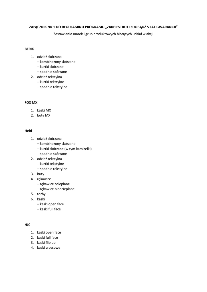 ZAŁĄCZNIK NR 1 DO REGULAMINU PROGRAMU „ZAREJESTRUJ I ZDOBĄDŹ 5 LAT GWARANCJI” Zestawienie marek i grup produktowych biorących udział w akcji BERIK 1. odzież skórzana – kombinezony skórzane – kurtki skórzane – spodnie skórzane 2. odzież tekstylna – kurtki tekstylne – spodnie tekstylne FOX MX 1. kaski MX 2. buty MX Held 1. odzież skórzana – kombinezony skórzane – kurtki skórzane (w tym kamizelki) – spodnie skórzane 2. odzież tekstylna – kurtki tekstylne – spodnie tekstylne 3. buty 4. rękawice – rękawice ocieplane – rękawice nieocieplane 5. torby 6. kaski – kaski open face – kaski full face HJC 1. 2. 3. 4. kaski open face kaski full face kaski flip up kaski crossowe Ozone 1. kaski – kaski open face – kaski full face – kaski crossowe 2. odzież – kurtki tekstylne – spodnie tekstylne – kombinezony skórzane – kurtki skórzane – spodnie skórzane 3. rękawice 4. buty RST 1. odzież skórzana – kombinezony skórzane – kurtki skórzane – spodnie skórzane 2. odzież tekstylna – kurtki tekstylne – spodnie tekstylne 3. rękawice 4. buty SW-Motech 1. wszystkie produkty Arai 1. kaski open face 2. kaski full face 3. kaski crossowe Airoh 1. on road – kaski full face – kaski open face 2. off-road – kaski crossowe – kaski junior Rebelhorn 1. 2. 3. 4. 5. odzież skórzana odzież tekstylna rękawice buty torby POD 1. ortezy Atlas 1. ochraniacze karku 2. buzery SHIFT 1. kaski