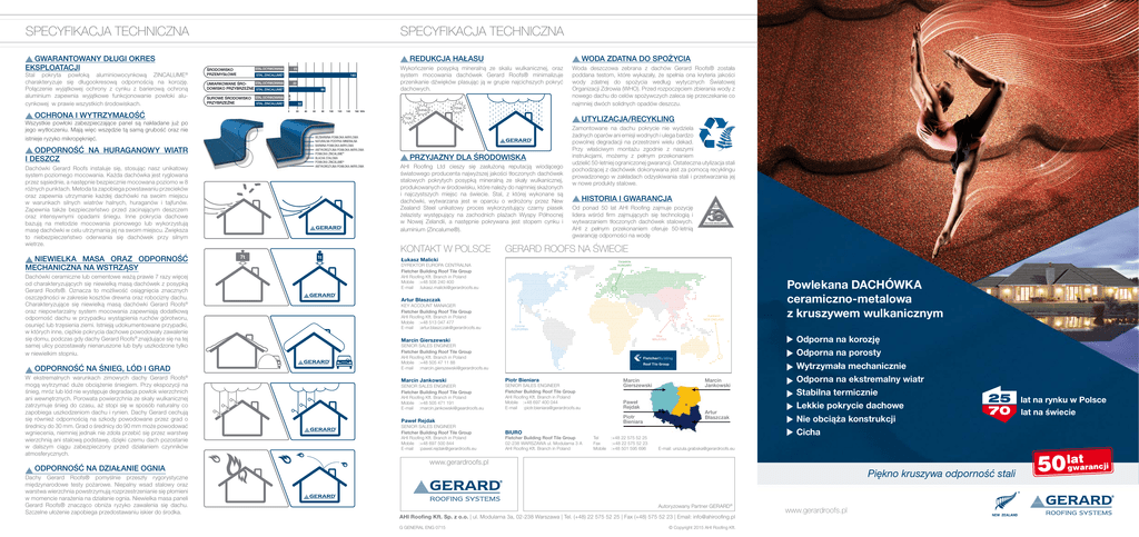 SPECYFIKACJA TECHNICZNA GWARANTOWANY DŁUGI OKRES EKSPLOATACJI Stal pokryta powłoką aluminiowocynkową ZINCALUME® charakteryzuje się długookresową odpornością na korozję. Połączenie wyjątkowej ochrony z cynku z barierową ochroną aluminium zapewnia wyjątkowe funkcjonowanie powłoki alu cynkowej w prawie wszystkich środowiskach. SPECYFIKACJA TECHNICZNA REDUKCJA HAŁASU ŚRODOWISKO PRZEMYSŁOWE STAL ZINCALUME® STAL OCYNKOWANA UMIARKOWANE ŚRODOWISKO PRZYBRZEŻNE STAL ZINCALUME® SUROWE ŚRODOWISKO PRZYBRZEŻNE STAL OCYNKOWANA STAL ZINCALUME® OCHRONA I WYTRZYMAŁOŚĆ Woda deszczowa zebrana z dachów Gerard Roofs® została poddana testom, które wykazały, że spełnia ona kryteria jakości wody zdatnej do spożycia według wytycznych Światowej Organizacji Zdrowia (WHO). Przed rozpoczęciem zbierania wody z nowego dachu do celów spożywczych zaleca się przeczekanie co najmniej dwóch solidnych opadów deszczu. UTYLIZACJA/RECYKLING TOK BEZBARWNA POWŁOKA AKRYLOWA NATURALNA POSYPKA MINERALNA BARWNA POWŁOKA AKRYLOWA ANTYKOROZYJNA POWŁOKA AKRYLOWA POWŁOKA ZINCALUME® BLACHA STALOWA POWŁOKA ZINCALUME® ANTYKOROZYJNA POWŁOKA AKRYLOWA ODPORNOŚĆ NA HURAGANOWY WIATR I DESZCZ Dachówki Gerard Roofs instaluje się, stosując nasz unikatowy system poziomego mocowania. Każda dachówka jest ryglowana przez sąsiednie, a następnie bezpiecznie mocowana poziomo w 8 różnych punktach. Metoda ta zapobiega powstawaniu przecieków oraz zapewnia utrzymanie każdej dachówki na swoim miejscu w warunkach silnych wiatrów halnych, huraganów i tajfunów. Zapewnia także bezpieczeństwo przed zacinającym deszczem oraz intensywnymi opadami śniegu. Inne pokrycia dachowe bazują na metodzie mocowania pionowego lub wykorzystują masę dachówki w celu utrzymania jej na swoim miejscu. Zwiększa to niebezpieczeństwo oderwania się dachówek przy silnym wietrze. PRZYJAZNY DLA ŚRODOWISKA AHI Roofing Ltd cieszy się zasłużoną reputacją wiodącego światowego producenta najwyższej jakości tłoczonych dachówek stalowych pokrytych posypką mineralną ze skały wulkanicznej, produkowanych w środowisku, które należy do najmniej skażonych i najczystszych miejsc na świecie. Stal, z której wykonane są dachówki, wytwarzana jest w oparciu o wdrożony przez New Zealand Steel unikatowy proces wykorzystujący czarny piasek żelazisty występujący na zachodnich plażach Wyspy Północnej w Nowej Zelandii, a następnie pokrywana jest stopem cynku i aluminium (Zincalume®). KONTAKT W POLSCE NIEWIELKA MASA ORAZ ODPORNOŚĆ MECHANICZNA NA WSTRZĄSY Zamontowane na dachu pokrycie nie wydziela żadnych oparów ani emisji wodnych i ulega bardzo powolnej degradacji na przestrzeni wielu dekad. Przy właściwym montażu zgodnie z naszymi instrukcjami, możemy z pełnym przekonaniem udzielić 50-letniej ograniczonej gwarancji. Ostateczna utylizacja stali pochodzącej z dachówek dokonywana jest za pomocą recyklingu prowadzonego w zakładach odzyskiwania stali i przetwarzania jej w nowe produkty stalowe. HISTORIA I GWARANCJA Od ponad 50 lat AHI Roofing zajmuje pozycję lidera wśród firm zajmujących się technologią i wytwarzaniem tłoczonych dachówek stalowych. AHI z pełnym przekonaniem oferuje 50-letnią gwarancję odporności na wodę GERARD ROOFS NA ŚWIECIE Łukasz Malicki BANG PING TOK Varpalota HUNGARY DYREKTOR EUROPA CENTRALNA Fletcher Building Roof Tile Group AHI Roofing Kft. Branch in Poland Mobile :+48 508 240 400 E-mail :[email protected] Artur Błaszczak KEY ACCOUNT MANAGER Fletcher Building Roof Tile Group AHI Roofing Kft. Branch in Poland Mobile :+48 513 047 477 E-mail :[email protected] Auckland NEW ZAELAND Nilai MALAYSIA SENIOR SALES ENGINEER Fletcher Building Roof Tile Group AHI Roofing Kft. Branch in Poland Mobile :+48 505 47 11 88 E-mail :[email protected] ODPORNOŚĆ NA ŚNIEG, LÓD I GRAD Marcin Jankowski SENIOR SALES ENGINEER Fletcher Building Roof Tile Group AHI Roofing Kft. Branch in Poland Mobile :+48 505 471 191 E-mail :[email protected] Piotr Bieniara Marcin Gierszewski SENIOR SALES ENGINEER Fletcher Building Roof Tile Group AHI Roofing Kft. Branch in Poland Mobile :+48 697 400 044 E-mail :[email protected] Paweł Rejdak Piotr Bieniara Paweł Rejdak SENIOR SALES ENGINEER Fletcher Building Roof Tile Group AHI Roofing Kft. Branch in Poland Mobile :+48 697 500 844 E-mail :[email protected] Powlekana DACHÓWKA ceramiczno-metalowa z kruszywem wulkanicznym Corona CALIFORNIA Marcin Gierszewski W ekstremalnych warunkach zimowych dachy Gerard Roofs® mogą wytrzymać duże obciążenie śniegiem. Przy ekspozycji na śnieg, mróz lub lód nie występuje degradacja powłok wierzchnich ani wewnętrznych. Porowata powierzchnia ze skały wulkanicznej zatrzymuje śnieg do czasu, aż stopi się w sposób naturalny co zapobiega uszkodzeniom dachu i rynien. Dachy Gerard cechują się również odpornością na szkody powodowane przez grad o średnicy do 30 mm. Grad o średnicy do 90 mm może powodować wgniecenia, niemniej jednak nie zdoła przebić się przez warstwę wierzchnią ani stalową podstawę, dzięki czemu dach pozostanie w dalszym ciągu zabezpieczony przed działaniem czynników atmosferycznych. BIURO Fletcher Building Roof Tile Group 02-238 WARSZAWA ul. Modularna 3 A AHI Roofing Kft. Branch in Poland Tel Fax Mobile :+48 22 575 52 25 :+48 22 575 52 23 :+48 501 595 696 Marcin Jankowski Artur Błaszczak Odporna na korozję Odporna na porosty Wytrzymała mechanicznie Odporna na ekstremalny wiatr Stabilna termicznie Lekkie pokrycie dachowe Nie obciąża konstrukcji Cicha E-mail: [email protected] www.gerardroofs.pl ODPORNOŚĆ NA DZIAŁANIE OGNIA Dachy Gerard Roofs® pomyślnie przeszły rygorystyczne międzynarodowe testy pożarowe. Niepalny wsad stalowy oraz warstwa wierzchnia powstrzymują rozprzestrzenianie się płomieni w momencie narażenia na działanie ognia. Niewielka masa paneli Gerard Roofs® znacząco obniża ryzyko zawalenia się dachu. Szczelne ułożenie zapob