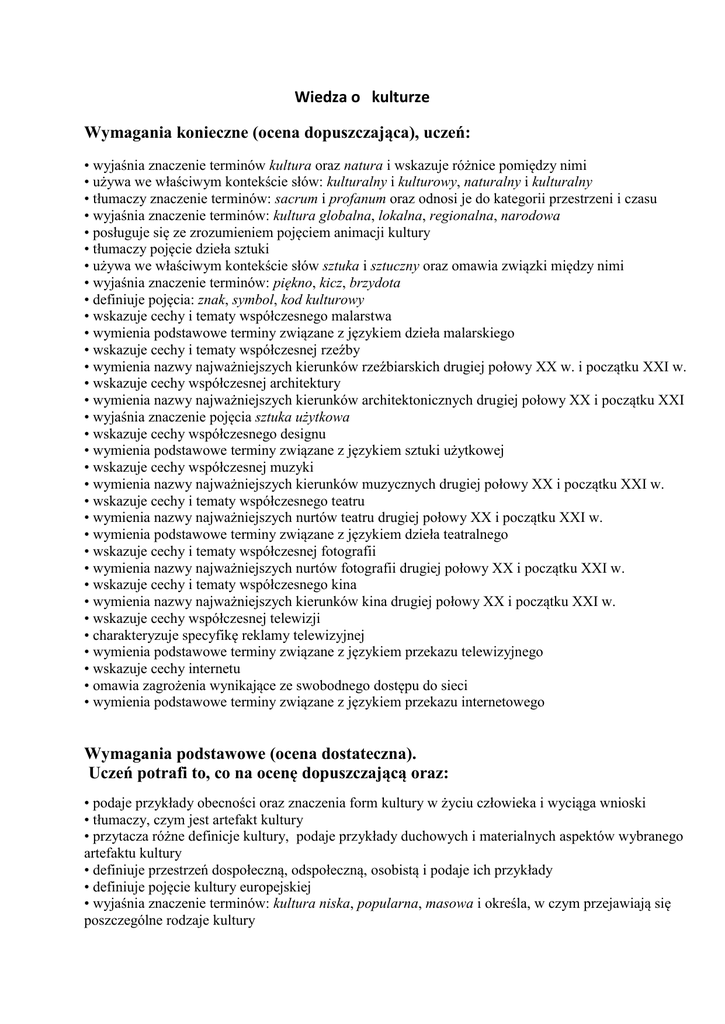 Wiedza o kulturze Wymagania konieczne (ocena dopuszczająca), uczeń: • wyjaśnia znaczenie terminów kultura oraz natura i wskazuje różnice pomiędzy nimi • używa we właściwym kontekście słów: kulturalny i kulturowy, naturalny i kulturalny • tłumaczy znaczenie terminów: sacrum i profanum oraz odnosi je do kategorii przestrzeni i czasu • wyjaśnia znaczenie terminów: kultura globalna, lokalna, regionalna, narodowa • posługuje się ze zrozumieniem pojęciem animacji kultury • tłumaczy pojęcie dzieła sztuki • używa we właściwym kontekście słów sztuka i sztuczny oraz omawia związki między nimi • wyjaśnia znaczenie terminów: piękno, kicz, brzydota • definiuje pojęcia: znak, symbol, kod kulturowy • wskazuje cechy i tematy współczesnego malarstwa • wymienia podstawowe terminy związane z językiem dzieła malarskiego • wskazuje cechy i tematy współczesnej rzeźby • wymienia nazwy najważniejszych kierunków rzeźbiarskich drugiej połowy XX w. i początku XXI w. • wskazuje cechy współczesnej architektury • wymienia nazwy najważniejszych kierunków architektonicznych drugiej połowy XX i początku XXI • wyjaśnia znaczenie pojęcia sztuka użytkowa • wskazuje cechy współczesnego designu • wymienia podstawowe terminy związane z językiem sztuki użytkowej • wskazuje cechy współczesnej muzyki • wymienia nazwy najważniejszych kierunków muzycznych drugiej połowy XX i początku XXI w. • wskazuje cechy i tematy współczesnego teatru • wymienia nazwy najważniejszych nurtów teatru drugiej połowy XX i początku XXI w. • wymienia podstawowe terminy związane z językiem dzieła teatralnego • wskazuje cechy i tematy współczesnej fotografii • wymienia nazwy najważniejszych nurtów fotografii drugiej połowy XX i początku XXI w. • wskazuje cechy i tematy współczesnego kina • wymienia nazwy najważniejszych kierunków kina drugiej połowy XX i początku XXI w. • wskazuje cechy współczesnej telewizji • charakteryzuje specyfikę reklamy telewizyjnej • wymienia podstawowe terminy związane z językiem przekazu telewizyjnego • wskazuje cechy internetu • omawia zagrożenia wynikające ze swobodnego dostępu do sieci • wymienia podstawowe terminy związane z językiem przekazu internetowego Wymagania podstawowe (ocena dostateczna). Uczeń potrafi to, co na ocenę dopuszczającą oraz: • podaje przykłady obecności oraz znaczenia form kultury w życiu człowieka i wyciąga wnioski • tłumaczy, czym jest artefakt kultury • przytacza różne definicje kultury, podaje przykłady duchowych i materialnych aspektów wybranego artefaktu kultury • definiuje przestrzeń dospołeczną, odspołeczną, osobistą i podaje ich przykłady • definiuje pojęcie kultury europejskiej • wyjaśnia znaczenie terminów: kultura niska, popularna, masowa i określa, w czym przejawiają się poszczególne rodzaje kultury • opisuje różnice między kulturą elitarną i ludową • podaje przykłady homogenizacji i makdonaldyzacji kultury • omawia pojęcie handmade w odniesieniu do kultury • tłumaczy, czym są stereotypy narodowe • charakteryzuje prądy kontrkulturowe, subkulturowe i alternatywne jako elementy kultury niezależnej • wyjaśnia znaczenie pojęć mimesis i tèchne • przytacza koncepcje pojmowania sztuki obecne w dziejach kultury • wymienia funkcje sztuki • uczestniczy w dyskusji na temat charakteru współczesnego malarstwa i rzeźbiarstwa • wykonuje kolaż związany tematycznie z wybranym dziełem • wyjaśnia pojęcie street artu i odszukuje jego przykłady w swojej najbliższej okolicy • odróżnia składniki formy i treści obrazu i pracy rzeźbiarskiej • odróżnia składniki formy i treści dzieła architektonicznego • wskazuje elementy języka architektury w przykładowym omówieniu budowli • podaje cechy wybranych nurtów współczesnego designu • omawia znaczenie sztuki użytkowej w przestrzeni społecznej • podaje główne cechy wybranych nurtów współczesnej muzyki • podaje najważniejsze fakty z historii muzyki • przywołuje nazwiska muzyków wpływających na młode pokolenie i analizuje ich twórczość • podaje główne cechy wybranych nurtów współczesnego teatru • określa, na czym polegają różnice pomiędzy teatrem dramatycznym, teatrem przedmiotu, teatrem muzycznym, taneczno-ruchowym, a także radiowym i telewizyjnym • wylicza najważniejsze fakty z historii teatru • wylicza główne cechy wybranych zjawisk współczesnej fotografii • podaje nazwiska przedstawicieli różnych nurtów fotografii XX i XXI w. • przytacza najważniejsze fakty z historii fotografii • przywołuje nazwiska polskich fotografów i określa tematykę ich prac • charakteryzuje wybrane nurty współczesnej kinematografii • podaje nazwiska ważnych przedstawicieli kina XX i XXI w. • przywołuje najważniejsze fakty z historii kinematografii • omawia osiągnięcia polskich reżyserów filmowych • wymienia tytuły ważnych dzieł filmowych w historii kinematografii • podaje najważniejsze fakty z historii telewizji • omawia znaczenie reklamy w świecie mediów i w życiu człowieka • podaje przykłady wydarzeń medialnych • wylicza tytuły programów real TV i omawia ich specyfikę • wskazuje elementy języka telewizji w przykładowym omówieniu programu telewizyjnego • przywołuje najważniejsze fakty z historii internetu • podaje znaczenie terminów: netgeneracja i pokolenie Web 2.0. • omawia specyfikę bloga i ruchu dziennikarstwa obywatelskiego • w przykładowym omówieniu zjawiska fotobloga wskazuje elementy języka internetu • charakteryzuje role odgrywane w życiu społecznym przez współczesnego człowieka • wyjaśnia, czym są subkultury • gromadzi argumenty na poparcie tezy, że moda to zjawisko społeczne Wymagania rozszerzające(ocena dobra) Uczeń potrafi to, co na ocenę dostateczną oraz: • porównuje p