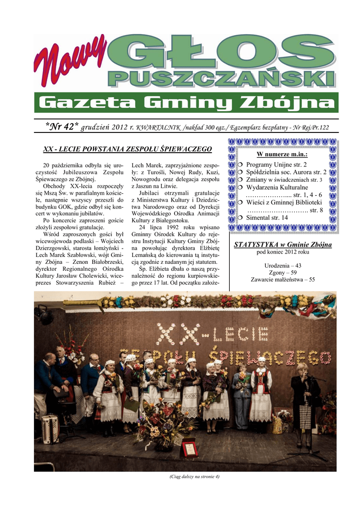 *Nr 42* grudzień 2012 r. KWARTALNIK /nakład 300 egz./ Egzemplarz bezpłatny - Nr Rej.Pr.122 XX - LECIE POWSTANIA ZESPOŁU ŚPIEWACZEGO 20 października odbyła się uroczystość Jubileuszowa Zespołu Śpiewaczego ze Zbójnej. Obchody XX-lecia rozpoczęły się Mszą Św. w parafialnym kościele, następnie wszyscy przeszli do budynku GOK, gdzie odbył się koncert w wykonaniu jubilatów. Po koncercie zaproszeni goście złożyli zespołowi gratulacje. Wśród zaproszonych gości był wicewojewoda podlaski – Wojciech Dzierzgowski, starosta łomżyński Lech Marek Szabłowski, wójt Gminy Zbójna – Zenon Białobrzeski, dyrektor Regionalnego Ośrodka Kultury Jarosław Cholewicki, wiceprezes Stowarzyszenia Rubież – Lech Marek, zaprzyjaźnione zespoły: z Turośli, Nowej Rudy, Kuzi, Nowogrodu oraz delegacja zespołu z Jaszun na Litwie. Jubilaci otrzymali gratulacje z Ministerstwa Kultury i Dziedzictwa Narodowego oraz od Dyrekcji Wojewódzkiego Ośrodka Animacji Kultury z Białegostoku. 24 lipca 1992 roku wpisano Gminny Ośrodek Kultury do rejestru Instytucji Kultury Gminy Zbójna powołując dyrektora Elżbietę Lemańską do kierowania tą instytucją zgodnie z nadanym jej statutem. Śp. Elżbieta dbała o naszą przynależność do regionu kurpiowskiego przez 17 lat. Od początku założe- (Ciąg dalszy na stronie 4) W numerze m.in.: Programy Unijne str. 2 Spółdzielnia soc. Aurora str. 2 Zmiany w świadczeniach str. 3 Wydarzenia Kulturalne ……………….... str. 1, 4 - 6 Wieści z Gminnej Biblioteki ………………………. str. 8 Simental str. 14 STATYSTYKA w Gminie Zbójna pod koniec 2012 roku Urodzenia – 43 Zgony – 59 Zawarcie małżeństwa – 55 PROGRAMY UNIJNE „KURPIE JAK MALOWANE” Projekt jest realizowany ze środków Unii Europejskiej w ramach Osi 4 Leader Programu Rozwoju Obszarów Wiejskich na lata 2007-2013, dzięki Fundacji „Kraina Mlekiem Płynąca” z Małego Płocka. W ramach tego projektu zostały zakupione kompletne stroje kurpiowskie dla Zespołu Śpiewaczego przy świetlicy wiejskiej w Kuziach. Stroje są wykonane zgodnie z tradycją i kulturą kurpiowską, którą dzięki realizacji projektu członkowie zespołu będą krzewić na terenie całego kraju i poza granicami. Przypomnijmy, że Zespół Śpiewaczy w Kuziach powstał pod koniec 2010 r. Zadebiutował w maju 2011 r. na Regionalnym Przeglądzie Kapel Śpiewaków i Gawędziarzy Ludowych w Zbójnej zajmując II miejsce, w czerwcu 2011 r. na Ogólnopolskich Dniach Kultury Kurpiowskiej w Nowogrodzie zajął III miejsce. Zespół Śpiewaczy z Kuzi reprezentował Gminę Zbójna również na XVII Regionalnych Spotkaniach Zespołów Artystycznych Ochotniczych Straży Pożarnych w 2011 r., gdzie zakwalifikował się na Ogólnopolskie Spotkania Zespołów Artystycznych Ochotniczych Straży Pożarnych w Wiśle w dniach 22-24 czerwca 2012 r. Natomiast 15 kwietnia tego roku reprezentował Gminę Zbójna w Ostrołęce na XXIX Kurpiowskich Prezentacjach Artystycznych. „PODKREŚLENIE TOŻSAMOŚCI KURPIOWSKIEJ GMINY ZBÓJNA” Projekt jest realizowany ze środków Unii Europejskiej w ramach Osi 4 Leader Programu Rozwoju Obszarów Wiejskich na lata 2007-2013, dzięki Fundacji „Kraina Mlekiem Płynąca” z Małego Płocka. W ramach tego projektu został zagospodarowany skwerek. Dotychczas nasadzono rośliny ozdobne i postawiono kapliczkę z Jezusem Frasobliwym oraz zostały wykonane alejki z kostki brukowej. Zostaną ustawione regionalne elementy wizualizacyjne w postaci tablicy z mapą, witaczy miejscowości Zbójna, tablic i słupa ogłoszeniowego przy GOK-u oraz ławek z bala. Rezultatem będzie podniesienie walorów turystycznych Gminy Zbójna, zostanie stworzone miejsce odpoczynku dla mieszkańców i ciekawe miejsce dla ludzi przejeżdżających przez naszą Gminę, którzy będą mogli chwilę odpocząć, zatrzymać się i zapoznać z geografią naszej gminy oraz odnaleźć poszukiwaną lokalizację. Realizacja tego zadania wpłynie nie tylko na podniesienie walorów turystycznych Gminy Zbójna, Skwerek ale również przybliży okolicznym mieszkańcom bogatą kulturę kurpiowską i ozdobi całą miejscowość. ROZBUDOWA SIECI WODOCIĄGOWEJ Projekt p.n. „Rozbudowa sieci wodociągowej na terenie gminy Zbójna wraz z budową naturalnej oczyszczalni ścieków przy Domu Nauczyciela” realizowany jest w ramach działania “Podstawowe usługi dla gospodarki i ludności wiejskiej” Programu Rozwoju Obszarów Wiejskich na lata 2007-2013, współfinansowanego przez Unię Europejską i obejmuje budowę naturalnej oczyszczalni ścieków przy Domu Nauczyciela w Zbójnej oraz rozbudowę sieci wodociągowej na terenie siedmiu miejscowości naszej gminy: Kolonia Budniki i Dukat, Gawrychy, Jurki, Kuzie, Osowiec, Popiołki, Wyk. Małgorzata Niewiadomska SPÓŁDZIELNIA SOCJALNA AURORA Spółdzielnia socjalna to instytucja, która prowadzi działalność łączącą cele gospodarcze i społeczne. Członkowie spółdzielni, tworzą dla siebie miejsca pracy, zapewniając dochód sobie i swoim rodzinom, a poprzez wspólne działania zmieniają siebie i środowisko, w którym żyją. Spółdzielnia Socjalna AURORA została założona przez pięć osób bezrobotnych mieszkających w Zbójnej. Założyły ją panie: Agata Kowalczyk prezes, Marzena Malesa – zastępca prezesa oraz Elżbieta Brzózka, Mariola Domańska i Sylwia Szaniawska. Należy zaznaczyć, że dużą rolę w tym przedsięwzięciu odegrał Wójt Gminy Zenon Białobrzeski i Kierownik GOPS w Zbójnej – Renata Bajno, którzy in2 spirowali do działania, motywowali oraz zaoferowali wsparcie członkiniom nowopowstającej spółdzielni. Spółdzielnia rozpoczęła działalność w listopadzie tego roku i powstała w ramach projektu realizowanego przez Starostwo Powiatowe w Łomży „Spółdzielnia Socjalna – szansą na lepsze jutro” współfinansowanego ze środków Unii Europejskiej w ramach Europejskiego Funduszu Społecznego. W ramach proje