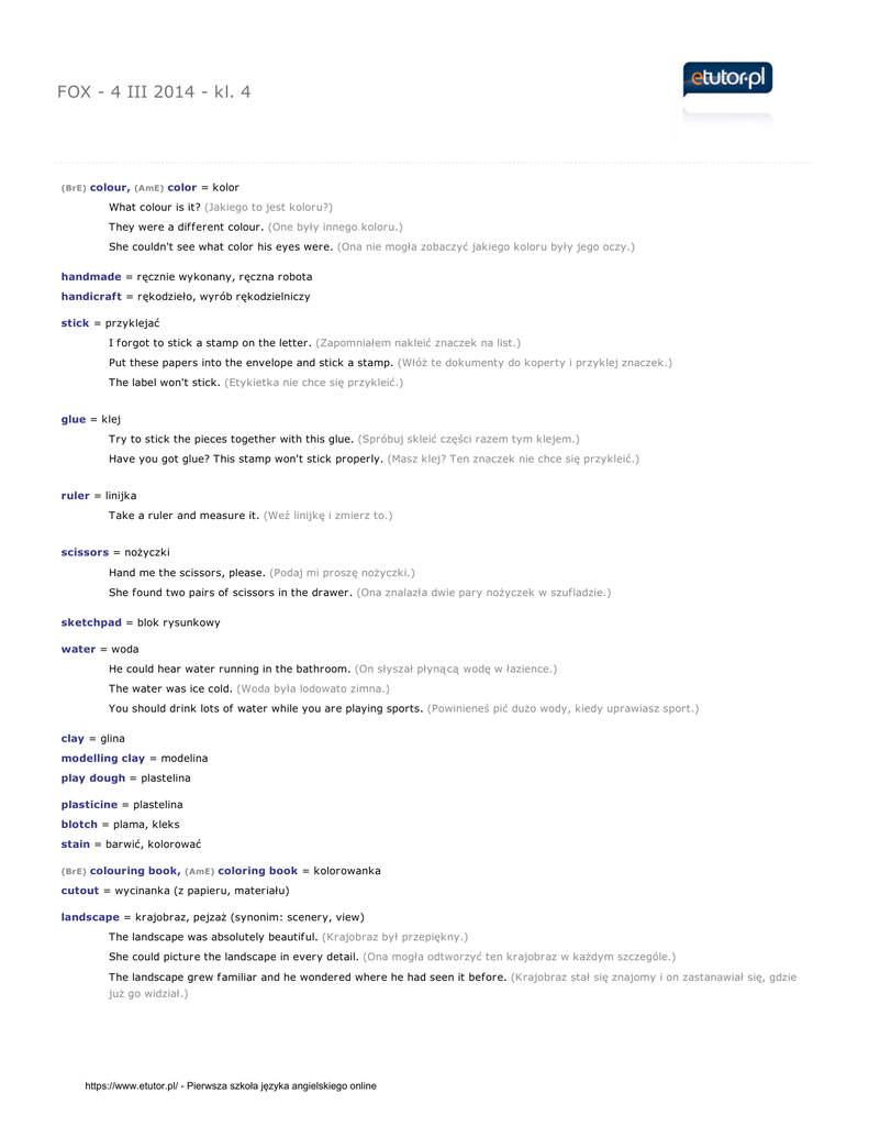FOX - 4 III 2014 - kl. 4 (BrE) colour, (AmE) color = kolor What colour is it? (Jakiego to jest koloru?) They were a different colour. (One były innego koloru.) She couldn't see what color his eyes were. (Ona nie mogła zobaczyć jakiego koloru były jego oczy.) handmade = ręcznie wykonany, ręczna robota handicraft = rękodzieło, wyrób rękodzielniczy stick = przyklejać I forgot to stick a stamp on the letter. (Zapomniałem nakleić znaczek na list.) Put these papers into the envelope and stick a stamp. (Włóż te dokumenty do koperty i przyklej znaczek.) The label won't stick. (Etykietka nie chce się przykleić.) glue = klej Try to stick the pieces together with this glue. (Spróbuj skleić części razem tym klejem.) Have you got glue? This stamp won't stick properly. (Masz klej? Ten znaczek nie chce się przykleić.) ruler = linijka Take a ruler and measure it. (Weź linijkę i zmierz to.) scissors = nożyczki Hand me the scissors, please. (Podaj mi proszę nożyczki.) She found two pairs of scissors in the drawer. (Ona znalazła dwie pary nożyczek w szufladzie.) sketchpad = blok rysunkowy water = woda He could hear water running in the bathroom. (On słyszał płynącą wodę w łazience.) The water was ice cold. (Woda była lodowato zimna.) You should drink lots of water while you are playing sports. (Powinieneś pić dużo wody, kiedy uprawiasz sport.) clay = glina modelling clay = modelina play dough = plastelina plasticine = plastelina blotch = plama, kleks stain = barwić, kolorować (BrE) colouring book, (AmE) coloring book = kolorowanka cutout = wycinanka (z papieru, materiału) landscape = krajobraz, pejzaż (synonim: scenery, view) The landscape was absolutely beautiful. (Krajobraz był przepiękny.) She could picture the landscape in every detail. (Ona mogła odtworzyć ten krajobraz w każdym szczególe.) The landscape grew familiar and he wondered where he had seen it before. (Krajobraz stał się znajomy i on zastanawiał się, gdzie już go widział.) https://www.etutor.pl/ - Pierwsza szkoła języka angielskiego online self-portrait = autoportret portrait = portret (BrE) watercolour, (AmE) watercolor = farba wodna, akwarela marker = marker, gruby pisak felt-tip pen, felt-tipped pen, felt-tip = pisak, mazak crayon = kredka sketch = szkicować, naszkicować (np. plan jakiegoś miejsca) sketch = szkic draw = rysować, szkicować He drew a picture on a napkin. (On narysował obrazek na serwetce.) She draws beautifully. (Ona pięknie rysuje.) oil paint = farba olejna paint = malować paint = farba Is the paint dry? (Czy farba już wyschła?) (BrE) coloured pencils, (AmE) colored pencils = kredki Jenny drew a picture in coloured pencils for her art class. (Jenny narysowała kredkami obrazek na zajęcia ze sztuki.) He has a whole box of coloured pencils. (On ma całe pudełko kredek.) She had not seen colored pencils in any store for a long time. (Ona nie widziała kredek w żadnym sklepie przez długi czas.) draw in pencil = rysować ołówkiem sharpener, pencil sharpener = temperówka Have you got a sharpener? My pencil is blunt. (Masz temperówkę? Mój ołówek jest tępy.) pencil case, pencil box = piórnik pencil = ołówek Have you got a pencil and paper? (Masz ołówek i papier?) He put down the pencil for a moment. (On odłożył na moment ołówek.) cardboard = tektura, karton The dumpster was full of cardboard. (Kontener na śmieci był pełen kartonu.) paper = papier We've run out of paper. (Skończył się nam papier.) drawing paper = papier rysunkowy, papier kreślarski tissue paper = bibułka piece of paper, sheet of paper = kartka papieru He wrote a note for her on a sheet of paper. (On napisał dla niej wiadomość na kartce papieru.) on paper = na papierze (w formie papierowej) easel = sztaluga palette = paleta (do mieszania farb) brush = pędzel https://www.etutor.pl/ - Pierwsza szkoła języka angielskiego online still life, still art = martwa natura art class = lekcja sztuki art teacher = nauczuciel sztuki art school = akademia sztuk pięknych, szkoła artystyczna work of art = dzieło sztuki modern art = sztuka nowoczesna art gallery = galeria sztuki fine art, the fine arts = sztuki piękne art museum = muzeum sztuki art education = edukacja obejmująca sztukę art = sztuka (dziedzina działalności artystycznej) He is an art teacher. (On jest nauczycielem sztuki.) I don't like modern art. (Nie lubię sztuki współczesnej.) Copyright (C) 2012 by eTutor.pl and its licensors. All rights reserved. https://www.etutor.pl/ - Pierwsza szkoła języka angielskiego online https://www.etutor.pl/ - Pierwsza szkoła języka angielskiego online