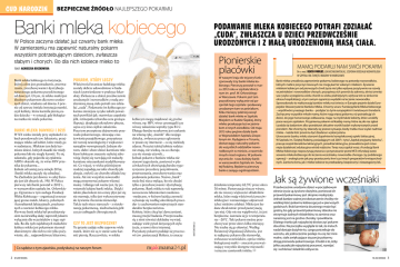 Cud narodzin BEZPIECZNE ŹRÓDŁO NAJLEPSZEGO POKARMU Banki mleka kobiecego PODAWANIE MLEKA KOBIECEGO POTRAFI ZDZIAŁAĆ „CUDA”, ZWŁASZCZA U DZIECI PRZEDWCZEŚNIE URODZONYCH I Z MAŁĄ URODZENIOWĄ MASĄ CIAŁA. W Polsce zaczyna działać już czwarty bank mleka. W zamierzeniu ma zapewnić naturalny pokarm wszystkim potrzebującym dzieciom, zwłaszcza słabym i chorych. Bo dla nich kobiece mleko to B Pionierskie placówki TEKST: AGNIESZKA ROSZKOWSKA BANKI MLEKA DAWNIEJ I DZIŚ W XX wieku istniały przy szpitalach i izbach porodowych tzw. laktatoria, przyjmujące mleko od kobiet, które miały go w nadmiarze. Mlekiem tym były karmione dzieci, których maatki nie miały pokarmu lub nie mogły karmić. To się załamało, gdy pojawiła się epidemia AIDS i okazało się, że wirus HIV przenika do pokarmu... Jednak od tamtej pory minęło 20 lat, i banki mleka zaczęły się odradzać. Na Zachodzie już dawno: w całej Europie jest ich obecnie ok. 190. W Polsce pierwszy taki bank powstał w 2012 r., w warszawskim szpitalu im. Orłowskiego. Ogromna w tym zasługa Fundacji Mleka Kobiecego – organizacji zrzeszającej grono matek, lekarzy, położnych i konsultantek laktacyjnych, przekonanych o wartości kobiecego mleka. Pierwszy bank mleka był przedsięwzięciem na niewielką skalę: zapewnił pokarm wyłącznie dla wcześniaków z tego szpitala. Bo dla tych najsłabszych maluchów kobiece mleko jest pokarmem nieomal zbawiennym: dla nich to nie tylko pożywienie, ale... najprawdziwsze lekarstwo. Właściwości lecznicze ludzkiego mleka zostały dobrze udowodnione w badaniach i potwierdzone w praktyce lekarskiej. Zwłaszcza u dzieci przedwcześnie urodzonych i noworodków z małą urodzeniową masą ciała potrafi ono zdziałać „cuda”. Podawanie im kobiecego pokarmu zmniejsza ryzyko takich poważnych powikłań jak: martwicze zapalenie jelit, retinopatia (choroba oczu grożąca ślepotą), dysplazja oskrzelowo-płucna, sepsa czy inne ciężkie zakażenia. Poza tym przyspiesza dojrzewanie przewodu pokarmowego, skracając czas żywienia pozajelitowego, przyspiesza też rozwój neurologiczny i większości narządów wewnętrznych. Jednym słowem, słabe i chore dzieci karmione mlekiem kobiecym znacznie szybciej zdrowieją i lepiej się rozwijają niż maluchy karmione mieszankami modyfikowanymi. Co więcej, w wieku późniejszym rzadziej zapadają na takie choroby jak alergia, otyłość czy choroby układu krążenia. Ale nie wszystkie noworodki mogą otrzymywać pokarm własnej mamy. I dlatego tak ważne jest, by powstawały kolejne banki mleka. Dzięki takim placówkom ten cenny płyn już się nie marnuje, tylko jest wykorzystywany do żywienia i leczenia niemowląt. Także tych nieco starszych – z nietolerancją pokarmową, niedrożnością jelit czy po zabiegach chirurgicznych. CZY TO JEST BEZPIECZNE? To pytanie zadaje sobie zapewne wiele matek, które nie są w stanie same karmić piersią. Rzeczywiście, w mleku Co sądzisz o tym zjawisku, podyskutuj na naszym forum 2 W naszym kraju do tej pory funkcjonowały trzy banki mleka kobiecego. Pierwszy powstał w marcu 2012 roku w szpitalu klinicznym im. prof. W. Orłowskiego w Warszawie. Pokarm jest tam pozyskiwany wyłącznie od pacjentek tego szpitala i podawany urodzonym tam wcześniakom. Kilka miesięcy później zaczął działać bank mleka w Szpitalu Miejskim w Rudzie Śląskiej, który mleko przekazuje też wcześniakom z innych ośrodków. Od maja 2013 roku prężnie działa bank w Wojewódzkim Szpitalu Zespolonym im. Rydygiera w Toruniu, dostarczając naturalny pokarm do wszystkich oddziałów noworodkowych w mieście, a nawet do innych miast regionu. W połowie stycznia br. rusza kolejny bank: w warszawskim Szpitalu im. Świętej Rodziny. Będzie to pierwszy bank o zasięgu ogólnopolskim. POKARM, KTÓRY LECZY kobiecym mogą znajdować się groźne wirusy, np. HIV, wirus cytomegalii czy wirusy zakażenia wątroby typu B i C. Dlatego bardzo ryzykowne jest szukanie na własną rękę „mamki” dla swojego dziecka, zwłaszcza przez ogłoszenia w prasie czy internecie – co się niekiedy zdarza. Przecież takiej kobiety rodzice nie znają, nie wiedzą, na co choruje, czy nie stosuje używek... Jednak pokarm z banków mleka nie stanowi zagrożenia, ponieważ w placówkach tych obowiązują bardzo rygorystyczne procedury pozyskiwania, przetwarzania, przechowywania oraz podawania pokarmu. Nazwa „bank” może być nieco myląca, bo nie chodzi tylko o przechowywanie i dystrybucję pokarmu. Bank mleka to tak naprawdę nowoczesne laboratorium naukowo-medyczne, w którym każdą czynność wykonuje się według określonych procedur i z zachowaniem najwyższych standardów bezpieczeństwa. Kobiety, które chcą być dawczyniami, muszą przejść badania. Przeprowadza się z nimi również dokładny wywiad, zadając wiele pytań dotyczących stylu życia, a nawet sfery intymnej. Pozyskany pokarm poddaje się procesowi tzw. pasteryzacji Holtera, to znaczy SHUTTERSTOCK (2) Bank mleka kobiecego to instytucja, której celem jest gromadzenie, przetwarzanie, przechowywanie i dystrybucja naturalnego pokarmu pozyskiwanego od dawczyń. O tym, że mleko matki jest idealnym pokarmem dla nowo urodzonych dzieci, wiadomo od dawna. I pewnie od zawsze istniała instytucja mamki, czyli kobiety, która karmiła piersią cudze dziecko – w sytuacji, gdy biologiczna matka nie miała pokarmu. działaniu temperatry 62,5°C przez okres 30 minut. Pasteryzacja niszczy wirusy, ale nie niszczy większości składników mleka, które mają właściwości przeciwinfekcyjne i wzmacniające odporność (choć niektóre osłabia). Mleko jest badane dwukrotnie: przed pasteryzacją i po niej. Gdy nie ma wątpliwości, że jest bezpieczne, zamraża się je w temperaturze –20°C. Taki pokarm można przechowywać przez okres kilku miesięcy. Nie trzeba się go obawiać. Według Światowej Organizacji Zdrowia, jest to najlepszy pokarm dla niemowląt, zwłaszcz