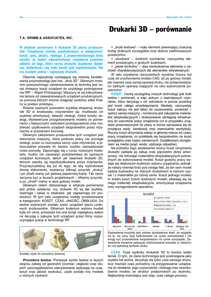864 MECHANIK NR 11/2010 Drukarki 3D – porównanie T.A. GRIMM & ASSOCIATES, INC. W artykule porównano 6 drukarek 3D pięciu producentów. Urządzenia zostały przetestowane w kategoriach: koszt, czas, jakość, obsługa. Z przeprowadzonego testu wynika, że wybór odpowiedniego urządzenia powinien zależeć od tego, która cecha drukarki (szybkość działania, dokładność czy niski koszt) jest najistotniejsza. Nie ma bowiem jednej i najlepszej drukarki. Obecnie najszybciej rozwijającą się metodą kształtowania przyrostowego jest tzw. „druk 3D”. Głównym motorem powszechnego zainteresowania tą techniką jest coraz mniejszy koszt urządzeń do szybkiego prototypowania (RP – Rapid Prototyping). Maszyny te są zdecydowanie tańsze od zaawansowanych urządzeń produkcyjnych, za pomocą których można osiągnąć podobny efekt finalny w postaci prototypu. Równie ważnymi powodami szybkiej ekspansji drukarek 3D w środowisku inżynierskim są: możliwość ich szybkiej amortyzacji, łatwość obsługi, niskie koszty obsługi, błyskawiczne przygotowywanie modelu (w porównaniu z klasycznymi metodami prototypowania) oraz możliwość użytkowania urządzeń bezpośrednio przez inżynierów w przestrzeni biurowej. Głównym założeniem producentów tych urządzeń jest stworzenie maszyny, która podczas pracy nie wymaga obsługi, przez co oszczędza cenny czas inżynierów, a jednocześnie pozwala im bardzo szybko zwizualizować nowe pomysły. Zapoznając się z coraz nowszymi modelami, trudno nie zauważyć podobieństwa do typowych urządzeń biurowych, takich jak laserowe drukarki 2D, których zasoby są współużytkowane przez inżynierów. Przyzwyczailiśmy się już do tego, że aby wydrukować stronę dokumentu, wystarczy kliknąć przycisk „drukuj” i po chwili mamy już gotową papierową kopię. Tak samo zaczyna być w biurach projektowych – klikamy przycisk, a po „chwili” mamy w ręce gotowy model. Głównym celem dokonanego w artykule porównania jest próba ustalenia, czy drukarki 3D są tak szybkie, niedrogie i łatwe w obsłudze, jak zapewniają ich producenci. W tym celu urządzenia zostały przetestowane w kategoriach: KOSZT, CZAS, JAKOŚĆ, OBSŁUGA. Do testów wybranych zostało sześć urządzeń pięciu czołowych producentów. Głównym kryterium wyboru modeli była ich cena, ponieważ ma ona wciąż największy wpływ na decyzję o zakupie tych urządzeń przez firmy rozpoczynające pracę w technologii RP. „bryła testowa” – mały element zawierający znaczną liczbę drobnych szczegółów oraz dobrze zdefiniowanych powierzchni, „obudowa” – średnich rozmiarów, rzeczywisty element produkcyjny o grubych ściankach, „panel kontrolny” – dwa cienkościenne elementy o cechach charakterystycznych dla elementów wtryskiwanych. W celu uzyskania rzeczywistych wyników liczony był czas od uruchomienia modelu CAD, aż po gotowy model, jak również czas samej operacji druku; nie przeprowadzano żadnych operacji mających na celu wykończenie powierzchni. KOSZT. Cechą szczególną nowych technologii jest brak testów i porównań, a więc jednym z ważniejszych czynników, które decydują o ich wdrożeniu w proces produkcji jest koszt całego przedsięwzięcia. Niestety, rzeczywisty koszt zakupu nie jest łatwy do oszacowania, ponieważ – oprócz samej maszyny – konieczne jest zakupienie materiałów eksploatacyjnych i dostosowanie istniejącej infrastruktury do warunków pracy urządzenia (co w przypadku urządzeń przeznaczonych do pracy w biurze sprowadza się do przyłącza wody, kanalizacji oraz ewentualnie wentylacji). Roczny koszt utrzymania zależy w głównej mierze od czasu pracy urządzenia, co przekłada się bezpośrednio na koszt przeglądów oraz części zamiennych. Dodatkowym obciążeniem są media (prąd, woda, utylizacja odpadów). Na potrzeby tego zestawienia roczny koszt utrzymania drukarki zakłada jej zakup oraz pięcioletni okres amortyzacji, nie wliczając materiałów eksploatacyjnych potrzebnych do wykonywania modeli. Koszt godziny pracy wydaje się właściwym kryterium wyboru urządzenia, jednakże należy również brać pod uwagę fakt, że ten sam model będzie budowany na różnych drukarkach w różnym czasie i z materiałów po różnej cenie. Koszt jednego modelu to średni koszt trzech testowych modeli; składają się na niego materiały eksploatacyjne, amortyzacja urządzenia oraz wynagrodzenie operatora. Zestawienie kosztów jest celowo pozbawione skali, ze względu na to, że ceny były kalkulowane na rynek amerykański i nie mogą być przeniesione bezpośrednio na rynek europejski. Zestawienie wyraźnie pokazuje zróżnicowanie kosztów w zależności od wybranej techniki druku Kształty użyte do procedury testowej Procedura testów: Ponieważ wyniki testów w dużym stopniu zależą od geometrii (rozmiar, objętość oraz stopień uszczegółowienia zdecydowanie wpływają na czas, koszt oraz jakość wydruku), użyte zostały trzy modele o różnych cechach: CZAS. Czas wydruku drukarek 3D to bardzo ważki temat. O tym, że dana technologia jest postrzegana jako szybka lub wolna, decyduje nie tylko czas samego druku, lecz również czas potrzebny na przygotowanie urządzenia do działania, jego czyszczenie i obsługę oraz oswobodzenie modelu ze struktur podporowych po wydruku. Najbardziej miarodajny jest więc czas całego procesu. MECHANIK NR 11/2010 865 Alaris30 (Objet Geometries) Technika druku: PolyJet (głowica drukująca osadza krople żywicy, które są utwardzane światłem UV) Przestrzeń robocza: 9 dm3 Warstwa: 28 µm ProJet SD 3000 (3D Systems) Technika druku: Multi-Jet Modeling (podobnie jak w PolyJet, przy czym materiałem podporowym jest tutaj wosk) Przestrzeń robocza: 11,2 dm3 Min. warstwa: 25 µm SD300 Pro (Solido) Technika druku: Plastic Sheet Lamination (warstwy folii PVC są ze sobą sklejane, a ich kształt jest wycinany za pomocą ostrza) Przestrzeń robocza: 