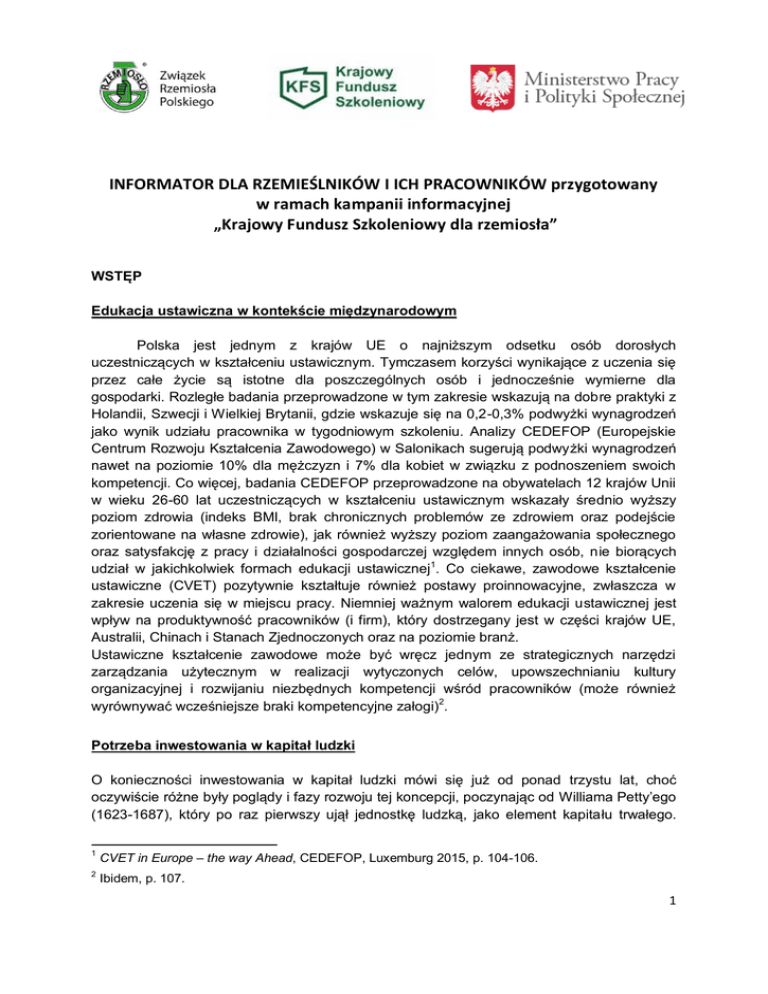 INFORMATOR DLA RZEMIEŚLNIKÓW I ICH PRACOWNIKÓW przygotowany w ramach kampanii informacyjnej „Krajowy Fundusz Szkoleniowy dla rzemiosła” WSTĘP Edukacja ustawiczna w kontekście międzynarodowym Polska jest jednym z krajów UE o najniższym odsetku osób dorosłych uczestniczących w kształceniu ustawicznym. Tymczasem korzyści wynikające z uczenia się przez całe życie są istotne dla poszczególnych osób i jednocześnie wymierne dla gospodarki. Rozległe badania przeprowadzone w tym zakresie wskazują na dobre praktyki z Holandii, Szwecji i Wielkiej Brytanii, gdzie wskazuje się na 0,2-0,3% podwyżki wynagrodzeń jako wynik udziału pracownika w tygodniowym szkoleniu. Analizy CEDEFOP (Europejskie Centrum Rozwoju Kształcenia Zawodowego) w Salonikach sugerują podwyżki wynagrodzeń nawet na poziomie 10% dla mężczyzn i 7% dla kobiet w związku z podnoszeniem swoich kompetencji. Co więcej, badania CEDEFOP przeprowadzone na obywatelach 12 krajów Unii w wieku 26-60 lat uczestniczących w kształceniu ustawicznym wskazały średnio wyższy poziom zdrowia (indeks BMI, brak chronicznych problemów ze zdrowiem oraz podejście zorientowane na własne zdrowie), jak również wyższy poziom zaangażowania społecznego oraz satysfakcję z pracy i działalności gospodarczej względem innych osób, nie biorących udział w jakichkolwiek formach edukacji ustawicznej1. Co ciekawe, zawodowe kształcenie ustawiczne (CVET) pozytywnie kształtuje również postawy proinnowacyjne, zwłaszcza w zakresie uczenia się w miejscu pracy. Niemniej ważnym walorem edukacji ustawicznej jest wpływ na produktywność pracowników (i firm), który dostrzegany jest w części krajów UE, Australii, Chinach i Stanach Zjednoczonych oraz na poziomie branż. Ustawiczne kształcenie zawodowe może być wręcz jednym ze strategicznych narzędzi zarządzania użytecznym w realizacji wytyczonych celów, upowszechnianiu kultury organizacyjnej i rozwijaniu niezbędnych kompetencji wśród pracowników (może również wyrównywać wcześniejsze braki kompetencyjne załogi)2. Potrzeba inwestowania w kapitał ludzki O konieczności inwestowania w kapitał ludzki mówi się już od ponad trzystu lat, choć oczywiście różne były poglądy i fazy rozwoju tej koncepcji, poczynając od Williama Petty’ego (1623-1687), który po raz pierwszy ujął jednostkę ludzką, jako element kapitału trwałego. 1 CVET in Europe – the way Ahead, CEDEFOP, Luxemburg 2015, p. 104-106. 2 Ibidem, p. 107. 1 Stwierdził, iż na człowieka także ponosi się wydatki, z czego później przychodzi zdolność do świadczenia usług, którymi spłaca się te inwestycje z zyskiem. Jednym z jego twierdzeń było iż „praca jest ojcem dobrobytu, a Ziemia jego matką”. Już wtedy starano się wycenić wartość ludzkiej jednostki oraz procedur jej kapitalizowania i zarobkowania. Określano koszty (głównie utrzymania), „obecną wartość” człowieka i przyszłe - możliwe dochody z nim związane. Oceny te dokonywano w kontekście budowania potęgi państwa, określania efektów edukacji, rozwiązywania kwestii związanych ze zdrowiem oraz migracjami. Kolejne poglądy sformułował Adam Smith, który w „Bogactwie Narodów” w 1776 wyróżnił „przydatne umiejętności uzyskane przez członków społeczności” jako jeden z czterech czynników rozwoju, obok maszyn, budynków i ziemi. Wiek XIX przyniósł wiele nowych idei stworzonych na fali oświecenia i rewolucji przemysłowej, gdzie można by wspomnieć m.in. filozofie Marksa i Engelsa. Prawdziwy przełom w formowaniu teorii kapitału ludzkiego nastąpił jednak w toku prac naukowych chicagowskiej szkoły ekonomicznej. W latach 60. XX wieku Jacob Mincer (urodzony w Tomaszowie Lubelskim) zaproponował model, w którym jednostka decydując się na zdobycie dodatkowego wykształcenia, ponosi koszt związany z utraconymi zarobkami, ponieważ wchodzi na rynek pracy później niż osoba o niższym wykształceniu (relacja dochodu do czasu spędzonego w szkole), przy czym, obok formalnego wykształcenia ważną determinantą osiąganych dochodów są umiejętności i doświadczenie oraz szkolenia nabyte w trakcie pracy zawodowej - choć stopniowo po pewnym czasie wpływ ten maleje z wiekiem (ujęte w równaniu jako kwadrat długości życia zawodowego pracownika). Gary Becker - w odróżnieniu od Mincera - uwzględnia bezpośrednie wydatki na edukację, a nie tylko korzyści z edukacji. Becker wyróżnia formalne kwalifikacje, doświadczenie zawodowe oraz zdrowie, jako odrębne formy kapitału ludzkiego. Najwięcej uwagi poświęca szkoleniom zawodowym, które według niego są podstawą modelu inwestycji w kapitał ludzki. Tak więc, edukacja i podnoszenie kwalifikacji w drodze szkoleń to inwestycje jednostek (w siebie) lub przedsiębiorstw. Stopa zwrotu z takiej inwestycji zależy od wysokości poniesionych nakładów i oczekiwanych w przyszłości zysków. Przy czym, zgodnie z teorią kapitału ludzkiego, istotny wpływ na koszt ma wybór momentu podejmowania kształcenia – zgodnie z teorią utraconych korzyści, inwestycje w edukację dokonywane w okresie młodości są „tańsze” niż kształcenie w późniejszym okresie, jako że nie odbierają czasu, który może być przeznaczony na zarobkowanie. W tym momencie należy zauważyć także, że zgodnie z coraz częściej prezentowanym na poziomie UE poglądem, mniejsze znaczenie ma forma kształcenia: formalna (często sprowadzana do szkolnej), pozaformalna lub nieformalna. Kształcenie w rzemiośle tradycyjnie i od wieków obejmuje swoim zasięgiem wszystkie te formy, wykorzystując w praktyce m.in. kształcenie incydentalne, czy też naukę w dobie obserwacji pracy mistrzów (tzw. „Job-shadowing”). Na pierwszy rzut oka nie widać bezpośredniego związku z ekonomią, a jednak dzięki badaniom podjętym m.in. przez prof. Gary’ego Beckera możemy rozwijać ten wątek naukowy znajdując znakomite uzasadnienie do kon