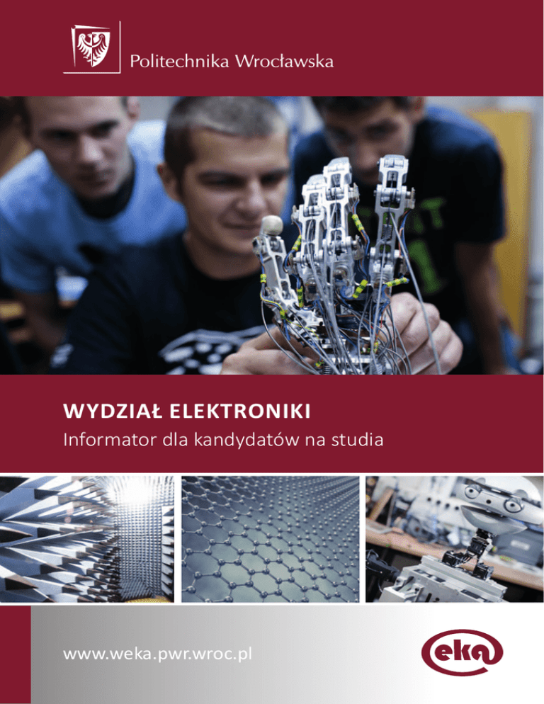 www.weka.pwr.wroc.pl Wydział Elektroniki Informator dla kandydatów na studia www.weka.pwr.wroc.pl I II Wydział elektroniki Władze Dziekan prof. dr hab. inż. Jan Zarzycki Prodziekan ds. socjalnych studentów i spraw finansowych Wydziału dr hab. inż. Andrzej Kucharski, prof. PWr Prodziekan ds. dydaktyki i rekrutacji - 1,2,3 semestr studiów I stopnia oraz 1 semestr studiów iI stopnia dr inż. Ewa Szlachcic Prodziekan ds. toku studiów - 2,3 semestr studiów iI stopnia dr inż. Leszek Koszałka Prodziekan ds. toku studiów - studia zaoczne oraz praktyki studenckie dr inż. Jerzy Kotowski Prodziekan ds. toku studiów - 4,5,6,7 semestr studiów I stopnia doc. dr inż. Andrzej Stępień www.weka.pwr.wroc.pl Informacje ogólne Wydział Elektroniki Politechniki Wrocławskiej to największy wydział zajmujący się elektroniką, technikami informacyjnymi i telekomunikacyjnymi (ICT, Information and Communication Technologies) oraz automatyką i robotyką w Polsce i w Politechnice Wrocławskiej. Kształci ponad 6 tys. studentów. Co roku dyplomy ukończenia studiów magisterskich i inżynierskich otrzymuje ponad tysiąc absolwentów. Jest także jednym z najstarszych wydziałów, bowiem jego historia sięga roku 1945, przy czym formalnie utworzony został w roku 1952, najpierw jako Wydział Łączności, potem przemianowany na Wydział Elektroniki. Mimo szerokiego spektrum kierunków kształcenia, w odróżnieniu od większości podobnych wydziałów innych politechnik, pozostaje wierny tradycyjnej nazwie Wydział Elektroniki. Wydział ma znakomitą kadrę naukową i dydaktyczną, ponad 60-letnie doświadczenie w kształceniu i prowadzeniu badań naukowych (w tym granty indywidualne MNiSZW i programu europejskiego PR6, PR7), rozliczne kontakty międzynarodowe, świetnie wyposażone laboratoria specjalistyczne, bogaty księgozbiór biblioteczny, obszerne sale dydaktyczne zlokalizowane w kompleksie budynków C-1, C-3, C-4, C-5, C-15, D-5, D-20 przy ul. Z. Janiszewskiego 11/17 oraz E-1 przy ul. B. Prusa 53/55. Obecnie trwają prace budowlane przy wznoszeniu nowego centrum dydaktycznego zaawansowanych technologii Technopolis, w którym powstają laboratoria studenckie i pracownie doktoranckie wyposażone w najnowocześniejsze dostępne urządzenia technologiczne i stanowiska badawcze. Otwarcie Technopolis jest przewidywane na październik 2014 roku. W gronie pracowników naukowo-dydaktycznych jest 18 profesorów tytularnych, 25 doktorów habilitowanych (w większości zatrudnionych na stanowisku profesora nadzwyczajnego) oraz ponad 160 doktorów. Gwarantuje to naszym studentom i doktorantom zdobycie wysokich kwalifikacji zawodowych i naukowych. Wyniki naszych badań naukowych są znane i publikowane na całym świecie, a nasi studenci, realizujący część programu studiów za granicą, są tam uznawani za najlepszych. Wydział prowadzi studium doktoranckie, na którym prace doktorskie przygotowuje ok. 150 doktorantów. W skład Wydziału Elektroniki wchodzą: • Instytut Informatyki, Automatyki i Robotyki (I-6), • Katedra Metrologii Elektronicznej i Fotonicznej (K-1), • Katedra Systemów i Sieci Komputerowych (K-2), • Katedra Telekomunikacji i Teleinformatyki (K-3), • Katedra Teorii Pola, Układów Elektronicznych i Optoelektroniki (K-4), • Katedra Akustyki i Multimediów (K-5), • Katedra Systemów Przetwarzania Sygnałów (K-6). Wydział i jego jednostki posiadają prawa doktoryzo wania, a także prawa habilitowania w zakresie automatyki i robotyki, informatyki, elektroniki i telekomunikacji. Siła Wydziału to również ponad 20 studenckich, aktywnie działających kół naukowych, oraz studia na wybranych specjalnościach w języku angielskim. 1 2 Wydział elektroniki Działalność dydaktyczna Studia na Wydziale Elektroniki pozwalają zdobyć wszechstronną wiedzę w obszarze najszybciej rozwijających się współcześnie dziedzin nauki i techniki, a mianowicie: informatyki, telekomunikacji, teleinformatyki, elektroniki oraz automatyki i robotyki. Mając na uwadze zarówno nieznane wyzwania nowego świata, błyskawicznie zmieniające się warunki życia, nowe technologie, przenikanie się dyscyplin naukowych, zmiany ekonomiczne i społeczne, a także konieczność nieustannej edukacji społeczeństwa XXI wieku, dostosowaliśmy zakres edukacji tak, aby absolwent sprostał stawianym wymaganiom. Staramy się zapewnić wszechstronne wykształcenie zawodowe oraz gruntowne poznanie szerokich podstaw poszczególnych dziedzin wiedzy elektronicznej i informatycznej. Dbamy również o roz wijanie umiejętności kreatywnego myślenia. Doskonalimy proces samokształcenia wsparty otwartością na wiedzę. Troszczymy się równocześnie o wykształcenie menedżerskie i biegłość w posługiwaniu się językami obcymi. Ponad 60 laboratoriów specjalistycznych dobrze wyposażonych w sprzęt renomowanych firm stanowi doskonałe wsparcie procesu kształcenia. Gwarancją jakości wykształcenia są także zewnętrzne oceny, a mianowicie certyfikaty: Państwowej Komisji Akredytacyjnej (PKA – obecnie Polska Komisja Akredytacyjna) oraz Komisji Akredytacyjnej Uczelni Technicznych (KAUT) dla kierunków: In- formatyka (kierunek wyróżniony przez PKA), Automatyka i Robotyka (kierunek wyróżniony przez PKA) oraz Elektronika i Telekomunikacja. Potwierdzają one najwyższą jakość kształcenia. Czwarty z kierunków, unikatowy w skali kraju i najmłodszy na Wydziale – Teleinformatyka – dopiero w 2008 roku miał swoich pierwszych absolwentów. Z tego względu dopiero w najbliższych latach może być poddany procesowi certyfikacji. Po ukończeniu studiów na Wydziale Elektroniki absolwent będzie przygotowany do podjęcia w krótkim czasie pracy zawodowej, założenia własnej firmy, używającej innowacyjnych technologii, oraz do rozwiązywania nieznanych dzisiaj problemów. Kształcenie na Wydziale Elektroniki prowadzone jest w systemie ECTS (European Credit Transfer System - Europejski Syste