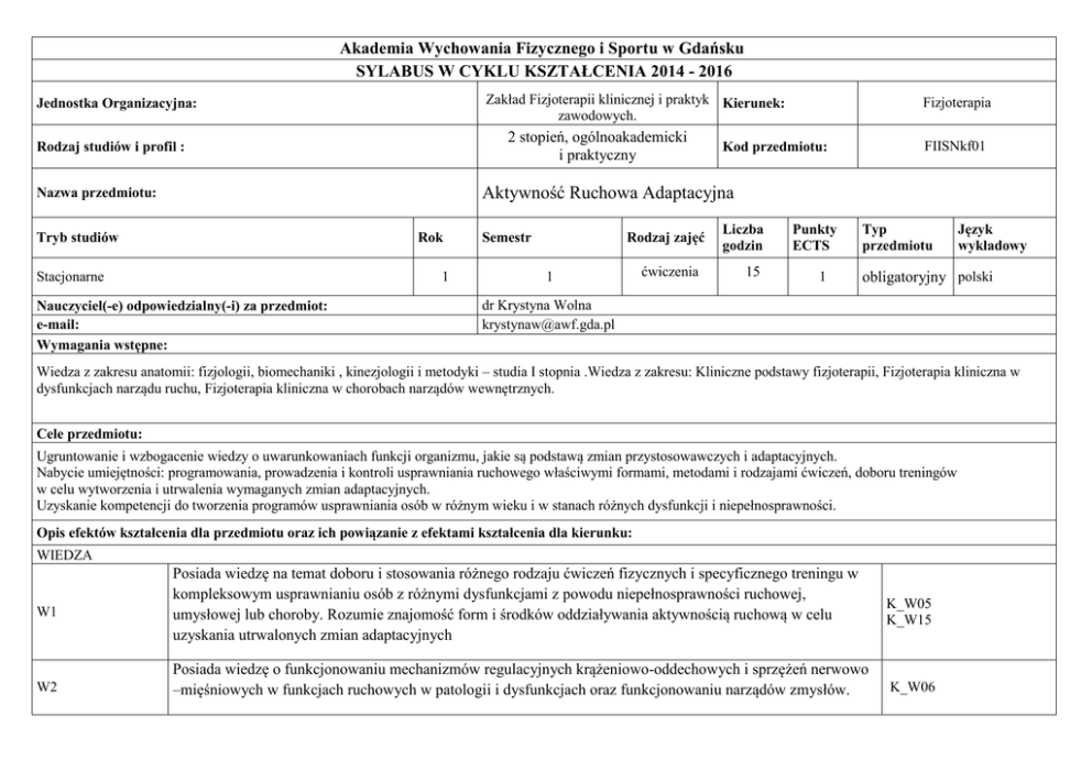 Akademia Wychowania Fizycznego i Sportu w Gdańsku SYLABUS W CYKLU KSZTAŁCENIA 2014 - 2016 Zakład Fizjoterapii klinicznej i praktyk Kierunek: zawodowych. Jednostka Organizacyjna: 2 stopień, ogólnoakademicki i praktyczny Rodzaj studiów i profil : Fizjoterapia FIISNkf01 Kod przedmiotu: Aktywność Ruchowa Adaptacyjna Nazwa przedmiotu: Tryb studiów Rok Stacjonarne 1 Nauczyciel(-e) odpowiedzialny(-i) za przedmiot: e-mail: Wymagania wstępne: Semestr Rodzaj zajęć 1 ćwiczenia Liczba godzin 15 Punkty ECTS 1 Typ przedmiotu Język wykładowy obligatoryjny polski dr Krystyna Wolna [email protected] Wiedza z zakresu anatomii: fizjologii, biomechaniki , kinezjologii i metodyki – studia I stopnia .Wiedza z zakresu: Kliniczne podstawy fizjoterapii, Fizjoterapia kliniczna w dysfunkcjach narządu ruchu, Fizjoterapia kliniczna w chorobach narządów wewnętrznych. Cele przedmiotu: Ugruntowanie i wzbogacenie wiedzy o uwarunkowaniach funkcji organizmu, jakie są podstawą zmian przystosowawczych i adaptacyjnych. Nabycie umiejętności: programowania, prowadzenia i kontroli usprawniania ruchowego właściwymi formami, metodami i rodzajami ćwiczeń, doboru treningów w celu wytworzenia i utrwalenia wymaganych zmian adaptacyjnych. Uzyskanie kompetencji do tworzenia programów usprawniania osób w różnym wieku i w stanach różnych dysfunkcji i niepełnosprawności. Opis efektów kształcenia dla przedmiotu oraz ich powiązanie z efektami kształcenia dla kierunku: WIEDZA W1 W2 Posiada wiedzę na temat doboru i stosowania różnego rodzaju ćwiczeń fizycznych i specyficznego treningu w kompleksowym usprawnianiu osób z różnymi dysfunkcjami z powodu niepełnosprawności ruchowej, umysłowej lub choroby. Rozumie znajomość form i środków oddziaływania aktywnością ruchową w celu uzyskania utrwalonych zmian adaptacyjnych Posiada wiedzę o funkcjonowaniu mechanizmów regulacyjnych krążeniowo-oddechowych i sprzężeń nerwowo –mięśniowych w funkcjach ruchowych w patologii i dysfunkcjach oraz funkcjonowaniu narządów zmysłów. K_W05 K_W15 K_W06 W3 Posiada podstawową wiedzę psycho-pedagogicznych zasad (w tym zasad bezpieczeństwa) organizacji i prowadzenia zajęć usprawniających dla osób i grup z różnymi dysfunkcjami w celu wypracowania zmian adaptacyjnych. K_W04 UMIEJĘTNOŚCI U1 U2 Potrafi zaprogramować, opracować, prezentować i modyfikować programy usprawniania z uwzględnieniem zasad i celów aktywności ruchowej dla osób z różnymi chorobami i dysfunkcjami stosownie do stanu zdrowia K_U08 oraz celów kompleksowego usprawniania dla uzyskania efektów adaptacji. Umiejętność wyboru i wykonywania K_U09 K_U04 testów i prób oceny wydolności i sprawności ruchowej. Posiada umiejętność ruchową oraz potrafi korzystać z dostępnej wiedzy w zakresie adaptacyjnej aktywności ruchowej w celu właściwego doboru różnych form usprawniania ruchowego, które potrafi zademonstrować oraz K_U22 nauczyć osoby niepełnosprawne. KOMPETENCJE K1 Potrafi kreować i promować odpowiednie działania aktywności ruchowej adaptacyjnej zgodnie ze standardami międzynarodowymi. Prowadzi stałą działalność na rzecz prozdrowotnego stylu życia. K_K05 K_K11 Kryteria i metody oceny osiągniętych efektów kształcenia: Zaliczenie z oceną na podstawie przygotowania i przeprowadzenia. projektu praktycznego dla wybranej grupy pacjentów Ocena eksperta składa się ze zgodności ze standardem, podanymi przez prowadzącego wytycznymi, innowacyjności, przestrzegania zasad bezpieczeństwa oraz poprawności merytorycznej. Umiejętność pracy w zespole Aktywny udział studentów w wymaganej liczbie godzin ćwiczeń Aby uzyskać zaliczenie przedmiotu na ocenę dostateczną student musi osiągnąć wszystkie wymienione przedmiotowe efekty kształcenia. Metody i formy realizacji przedmiotu: Ćwiczenia audytoryjne zadaniowo – projektowe i demonstrowanie – przekazywanie nauczania umiejętności ruchowych. Treści kształcenia: Ćwiczenia: 1. Podstawowe definicje, pojęcia i terminologia metodyki ARA. 2. Zajęcia organizacyjne – podział tematów konspektów do samodzielnego prowadzenia. 3. Aktywność fizyczna spełniająca funkcje adaptacyjne dla osób po schorzeniach narządu ruchu. . 4. Aktywność fizyczna spełniająca funkcje adaptacyjne dla osób po amputacjach lub z brakiem kończyny, 5. Aktywność fizyczna spełniająca funkcje adaptacyjne dla osób po urazach chorobach kręgosłupa. 6. Aktywność fizyczna spełniająca funkcje adaptacyjne dla osób po urazach i chorobach ośrodkowego układu nerwowego. 7. Aktywność fizyczna spełniająca funkcje adaptacyjne dla osób z uszkodzeniem narządu wzroku – niewidomych i niedowidzących. 8. Aktywność fizyczna spełniająca funkcje adaptacyjne dla osób z uszkodzeniem narządu słuchu- głuchych i niedosłyszących. 9.Aktywność fizyczna spełniająca funkcje adaptacyjne dla osób niepełnosprawnych intelektualnie. 10. Aktywność fizyczna spełniająca funkcje adaptacyjne dla osób po zawale serca, chorobie niedokrwiennej serca i po operacji serca. 11. Aktywność fizyczna spełniająca funkcje adaptacyjne dla osób z chorobą nadciśnieniową. 12.Aktywność fizyczna spełniająca funkcje adaptacyjne dla chorych na cukrzycę z nadwagą i otyłością. 13.Aktywność fizyczna spełniająca funkcje adaptacyjne w geriatrii. 14. Formy aktywności fizycznej – integracyjne. 15. Zaliczenie przedmiotu. Forma zaliczenia: Zaliczenie z oceną Literatura: Podstawowa: 1. Suchanowski A., Okulczyk K. (2012) Aktywność ruchowa adaptacyjna. AWFiS Gdańsk 2. Traczyk W.Z. (1992): Fizjologia człowieka w zarysie. Wydawnictwo Lekarskie PZWL, Warszawa. 3. Kozłowski S., Nazar K. (1999): Wprowadzenie do fizjologii kliniczne (wydanie trzecie). Wydawnictwo Lekarskie PZWL, Warszawa. 4. Górski J. (2001): Fizjologiczne podstawy wysiłku fizycznego. Wydawnictwo Lekarskie PZWL, Warszawa.. 5. Nowotny J. (2004) „Podstawy Fizjoterapii”, Część 1, Czę