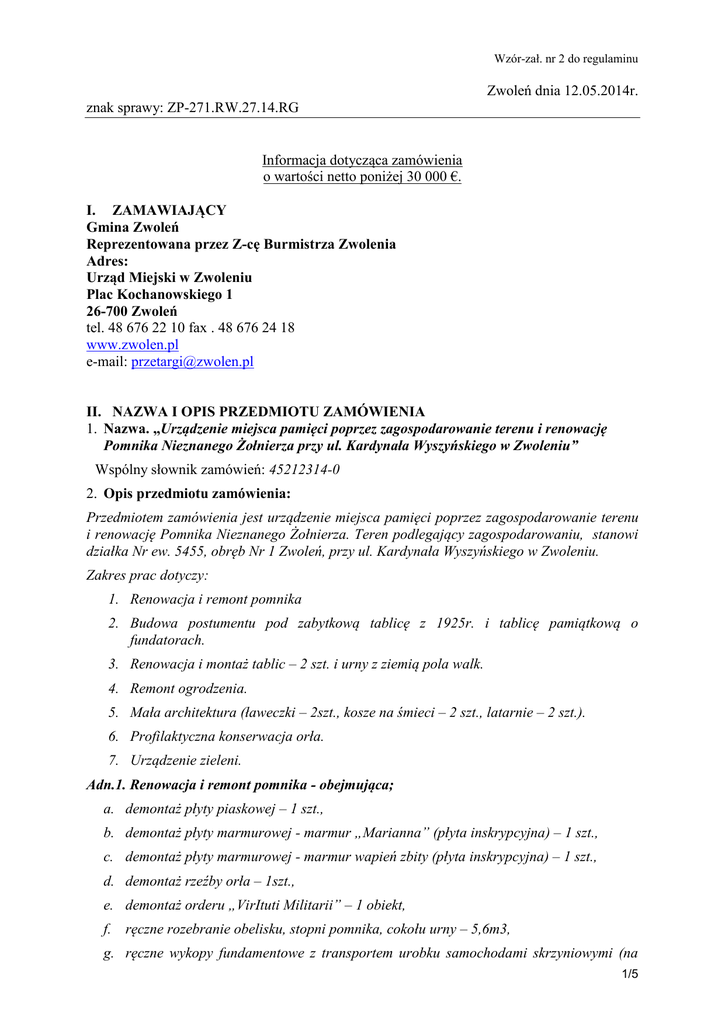 Wzór-zał. nr 2 do regulaminu Zwoleń dnia 12.05.2014r. znak sprawy: ZP-271.RW.27.14.RG Informacja dotycząca zamówienia o wartości netto poniżej 30 000 €. I. ZAMAWIAJĄCY Gmina Zwoleń Reprezentowana przez Z-cę Burmistrza Zwolenia Adres: Urząd Miejski w Zwoleniu Plac Kochanowskiego 1 26-700 Zwoleń tel. 48 676 22 10 fax . 48 676 24 18 www.zwolen.pl e-mail: [email protected] II. NAZWA I OPIS PRZEDMIOTU ZAMÓWIENIA 1. Nazwa. „Urządzenie miejsca pamięci poprzez zagospodarowanie terenu i renowację Pomnika Nieznanego Żołnierza przy ul. Kardynała Wyszyńskiego w Zwoleniu” Wspólny słownik zamówień: 45212314-0 2. Opis przedmiotu zamówienia: Przedmiotem zamówienia jest urządzenie miejsca pamięci poprzez zagospodarowanie terenu i renowację Pomnika Nieznanego Żołnierza. Teren podlegający zagospodarowaniu, stanowi działka Nr ew. 5455, obręb Nr 1 Zwoleń, przy ul. Kardynała Wyszyńskiego w Zwoleniu. Zakres prac dotyczy: 1. Renowacja i remont pomnika 2. Budowa postumentu pod zabytkową tablicę z 1925r. i tablicę pamiątkową o fundatorach. 3. Renowacja i montaż tablic – 2 szt. i urny z ziemią pola walk. 4. Remont ogrodzenia. 5. Mała architektura (ławeczki – 2szt., kosze na śmieci – 2 szt., latarnie – 2 szt.). 6. Profilaktyczna konserwacja orła. 7. Urządzenie zieleni. Adn.1. Renowacja i remont pomnika - obejmująca; a. demontaż płyty piaskowej – 1 szt., b. demontaż płyty marmurowej - marmur „Marianna” (płyta inskrypcyjna) – 1 szt., c. demontaż płyty marmurowej - marmur wapień zbity (płyta inskrypcyjna) – 1 szt., d. demontaż rzeźby orła – 1szt., e. demontaż orderu „VirItuti Militarii” – 1 obiekt, f. ręczne rozebranie obelisku, stopni pomnika, cokołu urny – 5,6m3, g. ręczne wykopy fundamentowe z transportem urobku samochodami skrzyniowymi (na 1/5 odległość do 3km) – 2,5m3, h. schody żelbetowe - wykonanie nowego cokołu pomnika wraz ze stopniami – 4,3m3, i. wykonanie trzonu obeliska pomnika 2,5m3, j. zagruntowanie przed nałożeniem tynku mineralnego – 10m2, k. tynki zewnętrzne zwykłe kat. III, na oddzielnych belkach, słupach prostokątnych i ścianach cylindrycznych, wykonane ręcznie - 10m2, l. izolacje grubości 2,5mm, na powierzchniach poziomych narażonych na działanie wody ciśnieniowej i zalegającej z dwukomponentowej, elastycznej zaprawy uszczelniającej – 10,4 m2, m. montaż stopni prostych blokowych obsadzonych dwustronnie o przekroju elementów do 0,06m2 – 2,055m3, n. montaż okładziny, cokołów, ścian i pilastrów o obwodzie elementów do 6 m/m2 i grubości elementów do 6cm – 0,640m2, o. konserwacja orderu „Virtuti Militarii” - zgodnie z zasadami wynagrodzeń artystów plastyków konserwatorów dóbr kultury – przyjęto 0,42% za dm2 – 16 dm2. Adn.2. Budowa postumentu pod zabytkową tablicę z 1925r. oraz tablicę informującą o fundatorach (pamiątkową) - obejmująca: 1) konserwacja płyty z piaskowca - zgodnie z zasadami wynagrodzeń artystów plastyków konserwatorów dóbr kultury – przyjęto 0,45% za dm2 – 141dm2, 2) montaż płyt kamiennych oraz urny – 1szt.. Adn. 3. Renowacja tablic – 2 szt.. Montaż dwóch tablic i urny z ziemią z pola walk – obejmująca: 1) konserwacja płyty z marmuru „Dębnik” - zgodnie z zasadami wynagrodzeń artystów plastyków konserwatorów dóbr kultury – przyjęto 0,60% za dm2 – 18 dm2, 2) konserwacja płyty z marmuru „Marianna” - zgodnie z zasadami wynagrodzeń artystów plastyków konserwatorów dóbr kultury – przyjęto 0,42% za dm2 – 15,12dm2, 3) montaż płyt kamiennych oraz urny – 3szt., Adn. 4. Remont ogrodzenia (murowanych słupów) – obejmujący: 1) rozbiórka muru z tyłu pomnika – 18,90m3, 2) wywiezienie gruzu samochodami skrzyniowymi (na odległość do 3km) – 18,90m3, 3) odbicie tynków wewnętrznych z zaprawy cementowo-wapiennej na ścianach, filarach, pilastrach o pow. odbicia do 5m2 około 30% – 24,18m2, 4) zagruntowanie (oszprycowanie) rzadką zaprawą cementową – wykucie spoin pod wykonanie nowego ospoinowania z zaprawą wapienną lub cementowo-wapienną – 23,30m2, 5) tynki wewnętrzne o pow. ponad 5m2 z zaprawą wapienną lub cementowo-wapienną kat. III wykonane ręcznie na ścianach ceramicznych - 24,18m2 6) przetarcie tynków wewnętrznych wraz z naprawą rys i drobnych uszkodzeń o pow. do 0,1m2 bez zeskrobań starej farby na ścianach – naprawa rys – 23,6m2 7) montaż nakryw z piaskowca na ogrodzeniu i słupkach – 7,2m. Adn. 5. Budowa małej architektury (ławeczki, kosze na śmieci, latarnie itp.) 1) stopy fundamentowe betonowe (pod pomniki i płytę z 1925r.) o obj. do 0,5m3 – 2,12m3, 2/5 2) montaż ławek (drewno-metal) – 2szt. 3) montaż koszy na śmieci – 2szt., 4) latarnie – 2szt. Adn. 6. Profilaktyczna konserwacja orła 1) oczyszczenie z nawarstwień luźno zalegających, 2) doczyszczenie przy pomocy miękkich szczotek oraz parownicy, 3) Hydrofibizacja preparatem przeznaczonym do tego celu. Adn.7. Urządzenie zieleni 1) sadzenie drzew i krzewów iglastych na terenie płaskim w gruncie kat. I-II z zaprawą dołów śr. głębokość 0,7m – 10szt. Tui (occidentalis szmaragd) wys. min. 1,5m , 2) pielęgnacja krzewów (przycięcie gałęzi, usunięcie korzeni i pni po wyciętym drzewie), 3) ręczne rozrzucenie ziemi żyznej lub kompostowej na terenie płaskim grub. warstwy 10cm – 0,5ha, 4) wykonanie trawników dywanowych siewem na gruncie kat. I-II bez nawożenia – 500m2. Zadanie należy wykonać zgodnie z dokumentacją projektową (załącznik nr 7) i opisem przedmiotu zamówienia. Przedmiar robót (załącznik nr 6) stanowi materiał pomocniczy. III. TERMIN WYKONANIA ZAMÓWIENIA 15 września 2014 r. IV. OPIS SPOSOBU PRZYGOTOWANIA OFERTY 1. Oferent powinien łożyć ofertę na formularzu załączonym do niniejszego zapytania, która powinna: posiadać nazwę i dokładny adres Wykonawcy oraz datę sporządzenia, być podpisana przez wykonawcę - osobę 