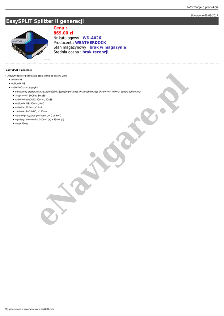 Informacje o produkcie Utworzono 01-03-2017 EasySPLIT Splitter II generacji Cena : 869,00 zł Nr katalogowy : WD-A026 Producent : WEATHERDOCK Stan magazynowy : brak w magazynie Średnia ocena : brak recenzji easySPLIT II generacji ● RAdio VHF ● odbiornik AIS ● radio FMCharakterystyka pl Aktywny splitter pozwala na podłączenie do anteny VHF: selektywny przełącznik częstotliwości dla jednego portu nadawczo/odbiorczego (Radio VHF) i dwóch portów odbiorczych ● antena VHF: 50Ohm, SO 239 ● radio VHF (IN/OUT): 50Ohm, SO239 ● odbiornik AIS: 50Ohm, BNC ● radio FM: 50 Ohm, Chinch ● zasilanie: 9v-28VDC, <120mA ● warunki pracy: pod pokladem , 0°C do 60°C ● wymiary: 140mm (l) x 140mm (w) x 35mm (h) ● waga 450 g ar e. ● eN av ig ● Wygenerowano w programie www.oscGold.com