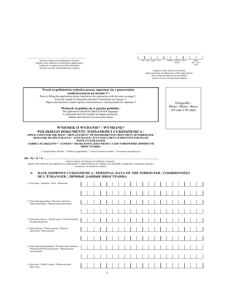 ................................................................................... .............................................................................. (pieczęć organu przyjmującego wniosek) / (stamp of the authority accepting the application) / (cachet de l’organe qui reçoit la demande) / (печать органа, принимающего заявку) rok / year / année / год / / miesiąc / month / mois / месяц dzień / day / jour / день (miejsce i data złożenia wniosku) / (place and date of submission of the application) / (lieu et date du dépôt de la demande) / (место и дата составления заявки) Przed wypełnieniem wniosku proszę zapoznać się z pouczeniem zamieszczonym na stronie 5 / Prior to filling the application please familiarise the instruction with the notes on page 5 / Avant de remplir la demande consultez l’instruction sur la page 5 / Перед заполнением заявки прошу ознакомиться с инструкцией на странице 5 Wniosek wypełnia się w języku polskim / The application should be filled in Polish language / La demande doit être remplie en langue polonaise / Заявка заполняется на польском языке Fotografia / Photo / Photo / Фото (35 mm x 45 mm) WNIOSEK O WYDANIE* / WYMIANĘ* POLSKIEGO DOKUMENTU TOŻSAMOŚCI CUDZOZIEMCA / APPLICATION FOR THE ISSUE* / REPLACEMENT* OF POLISH IDENTITY DOCUMENT OF FOREIGNER / DEMANDE DE DÉLIVRANCE* / D’ÉCHANGE* D’UN DOCUMENT D’IDENTITÉ POLONAIS POUR UN ÉTRANGER ЗАЯВКА НА ВЫДАЧУ* / ЗАМЕНУ* ПОЛЬСКОГО ДОКУМЕНТА УДОСТОВЕРЕНИЯ ЛИЧНОСТИ ИНОСТРАНЦА (* niepotrzebne skreślić / * delete as appropriate / * rayer la mention inutile / * ненужное вычеркнуть) do / to / à / к ........................................................................................................................... (nazwa organu, do którego jest składany wniosek) / (name of the authority the application is submitted to) / (dénomination de l’organe où la demande est déposée) / (название органа к которому составляется заявка) A. DANE OSOBOWE CUDZOZIEMCA / PERSONAL DATA OF THE FOREIGNER / COORDONNÉES DE L’ÉTRANGER / ЛИЧНЫЕ ДАННЫЕ ИНОСТРАНЦА 1. Nazwisko / Surname / Nom / Фамилия: 2. Nazwiska poprzednie / Previous surnames / Noms précédents / Предыдущие фамилии: 3. Nazwisko rodowe / Family name / Nom de famille / Родовая фамилия: 4. Imię (imiona) / Name (names) / Prénom (prénoms) / Имя (имена): 5. Imię (imiona) poprzednie / Previous name (names) / Prénom (prénoms) précédents / Предыдущие имя (имена): 6. Imię ojca / Father’s name / Prénom du père / Имя отца: 1 7. Imię matki / Mother’s name / Prénom de la mère / Имя матери: 8. Data urodzenia / Date of birth / Date de naissance / Дата рождения: / rok / year / année / год / miesiąc / month / mois / месяц dzień / day / jour / день 9. Płeć / Sex / Sexe / Пол: 10. Miejsce urodzenia / Place of birth / Lieu de naissance / Место рождения: 11. Kraj urodzenia (nazwa państwa) / Country of birth (name of the country) / Pays de naissance (appellation) / Страна рождения (название государства): 12. Obywatelstwo / Citizenship / Nationalité / Гражданство: 13. Stan cywilny / Marital status / État civil / Семейное положение: 14. Rysopis / Description / Signalement / Словесный портрет: cm Wzrost / Height / Taille / Рост: Kolor oczu / Colour of eyes / Couleur des yeux / Цвет глаз: Znaki szczególne / Special marks / Signes particuliers / Особые приметы: 15. Numer telefonu do kontaktu (niewymagane) / Contact phone number (not required) / Numéro de téléphone pour le contact (facultatif) / Номер контактного телефона (необязательно): B. ADRES ZAMELDOWANIA NA POBYT STAŁY LUB POBYT CZASOWY TRWAJĄCY PONAD 2 MIESIĄCE / PERMANENT PLACE OF RESIDENCE OR TEMPORARY RESIDENCE LASTING OVER 2 MONTHS / DOMICILE IMMATRICULÉ POUR UN SÉJOUR FIXE OU UN SÉJOUR TEMPORAIRE DE PLUS DE 2 MOIS / АДРЕС ПРОПИСКИ ПОСТОЯННОГО ПРЕБЫВАНИЯ ИЛИ ВРЕМЕННОГО ПРЕБЫВАНИЯ ПРОДОЛЖАЮЩЕГОСЯ БОЛЕЕ 2 МЕСЯЦЕВ 1. Województwo / Voivodship / Voïvodie / Воеводство: 2. Powiat / District / District / Повет: 3. Gmina / Municipality / Commune / Гмина: 4. Miejscowość / City / Localité / Населенный пункт: 5. Ulica / Street / Rue / Улица: 6. Numer domu / House number / Numéro du bâtiment / Номер дома: 8. Kod pocztowy / Postal code / Code postal / Почтовый индекс: 7. Numer mieszkania / Apartment number / Numéro d’appartement / Номер квартиры: – 2 C. WZÓR PODPISU / SIGNATURE SPECIMEN / SPÉCIMEN DE SIGNATURE / ОБРАЗЕЦ ПОДПИСИ (podpis wnioskodawcy) / (signature of the applicant) / (signature du demandeur) / (подпись заявителя) Podpis nie może wychodzić poza ramki. The signature should be within the box. La signature ne doit pas dépasser l’encadrement. Подпись не должна выходить за границы рамки. Data i podpis (imię i nazwisko) cudzoziemca / Date and signature (name and surname) of the foreigner / Date et signature (prénom et nom) de l’étranger / Дата и подпись (имя и фамилия) иностранца: / rok / year / année / год / miesiąc / month / mois / месяц dzień / day / jour / день (podpis) / (signature) / (signature) / (подпись) D. UZASADNIENIE WNIOSKU / JUSTIFICATION OF THE APPLICATION / JUSTIFICATION DE LA DE