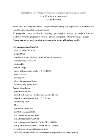 Szczegółowa specyfikacja wyposażenia sali sportowej w Maszewie Dużym (poz. 17 wykazu wyposażenia) NAGŁOŚNIENIE Sprzęt musi być fabrycznie nowy i oryginalnie opakowany. Nie dopuszcza się proponowania sprzętów używanych lub regenerowanych. W przypadku braku możliwości naprawy gwarancyjnej sprzętu w miejscu instalacji Dostawca zapewni sprzęt zastępczy o nie gorszej konfiguracji od naprawianego sprzętu. Oferowany sprzęt musi spełniać parametry nie gorsze niż podane poniżej: Odtwarzacz cd/mp3/usb/sd - dwie szuflady CD/ MP3 - 2 x port USB - możliwość grania z jednego pendrive’a/dysku twardego - kompatybilny z CD/MP3 - obsługa ID3 - Master Tempo - zakres potencjometru pitch: 4, 8, 16, 100% - funkcja scratch - płynna pętla - efekty Reverse oraz Brake - automatyczny licznik BPM Zestaw głośnikowy - głośniki dwudrożne - głośnik niskotonowo – średniotonowy min. 12 cali - głośnik wysokotonowy: min. 1,75“ driver - aluminiowy kosz - Moc: - min:350W stała RMS - do:700W program RMS - max:1400W szczytowa RMS - min. skuteczność SPL: 98dB - min. zakres częstotliwości: (-3dB): 59Hz - 20kHz - min. pasmo przenoszenia: (-10dB): 51 Hz - 21kHz - wykończenie: strukturalna czarna farba - osłaniająca siatka: siatka malowana systemem proszkowym okryta pianką - obudowa wykonana z wysokiej jakości sklejki - możliwość łączenia - możliwość montażu podwieszanego lub na statywie Końcówki mocy ( 3 szt. ) - min. moc wyjściowa przy impedancji 4Ohm : 2x 700 W - min. moc wyjściowa przy impedancji 8Ohm : 2x 450 W - min. czułość wejścia : 0,775V - wbudowany limiter - zabezpieczanie przeciwzwarciowe - złącza wejścia : jack & XLR - złącza wyjściowe : speakon & binding post - wbudowany procesor DSP Mikser - min. 8 kanałów mono, - min. 4 kanały stereo, - min.12 przedwzmacniaczy mikrofonowych z napięciem Phantom 48V - min. 3 zakresowy equalizer [semi - parametryczny], - kompresor, - limiter, - bramką szumu - filtrem górno-przepustowy. - min. 4 szyny AUX - wbudowany procesor efektów -aplikacje umożliwiające współpracę miksera z komputerem (dla iPhone’a i iPad’a i dla Androida). - WI-FI Wejścia liniowe „LINE IN” - typ złącza: 1/4" TRS żeński, symetryczny, mono, - min. pasmo przenoszenia [Direct Output]: 10-40 kHz, 0 / -0.5 dBu, - min. pasmo przenoszenia [Main Output]: 20-20 kHz, +/- 0.5 dBu, - min. impedancja wejściowa: 10 kOhm, - min. zniekształcenia THD [do wyjścia Direct Output]: <0.0007%, +4 dBu, 20-20 kHz, nieważony, - min. zniekształcenia THD [do wyjścia Main Output]: < 0.005%, +4 dBu, 20-20 kHz, nieważony, - min. S/N Ratio [do wyjścia Direct Output]: -105 dB, - min. S/N Ratio [do wyjścia Main Output]: -94 dB, - zakres kontroli wzmocnienia: -20 dB do +20 dB [+/- 1 dB], - min. maksymalny poziom wejściowy: +22 dBu. Compressor: - min. Zakres progu zadziałania: -56 dB do 0 dB, - Ratio: pomiędzy 1:1 a 14:1, - czas zadziałania [Attack Time]: 0.2 ms do 180 ms, - automatyczny "Attack" i "Release": Attack = 10 ms, Release = 150 ms, - typy nachylenia krzywej kompresji: łagodna i stroma. Equalizer: - Typ: filtr półkowy drugiego rzędu [Q = 0.55], - Pasmo niskie: 36 do 465 Hz, podbicie/odcięcie w zakresie 15 dB, - Średnie: 260 Hz do 3.5 kHz, podbicie/odcięcie w zakresie 15 dB, - Wysokie: 1.4 kHz do 18 kHz, podbicie/odcięcie w zakresie 15 dB. - min. zakres dynamiki AD [A-ważony, 48 kHz]: 118 dB, - Port FireWire: S400, 400 Mb/s, - Wewnętrzne przetwarzanie: 32-bitowe, - Rozdzielczość bitowa: 24 Mikrofon (4 szt) Zestaw z mikrofonem do ręki. - mikrofon dynamiczny kardioidalny, czas działania nadajnika/mikrofonu: do 10 godzin - wygodny przycisk wyciszenia na mikrofonie - system odbioru True Diversity - wygodna synchronizacja nadajnik-odbiornik w podczerwieni. - ochrona przed sprzężeniami -przycisk wyciszenia dla pełnej kontroli wystąpienia -technologia transmisji True Diversity -synchronizacja bezprzewodowa nadajnik-odbiornik -częstotliwości przełączane w krokach po 25 kHz -min. 8 banków częstotliwościowych z maks. 12 presetami -min. kanałów: 12 -zakres częstotliwości (mikrofon): 80-16000 Hz -odstęp sygnał-szum: >103 dB(A) -całkowite zniekształcenia harmoniczne (THD): 10 h -przetwornik, typ mikrofonu: dynamiczny, pojemnościowy -min. poziom ciśnienia akustycznego (SPL): 149 dB(SPL) max. - zasilanie mikrofonu baterie 2x 1,5 AA Przewody głośnikowe - przewody z miedzi beztlenowej - przekrój przewodu min 2x2,5m2 - o czystości min. 99,99% - elastyczne izolacje -gumowe - przewód kierunkowy W ramach realizacji zamówienia należy wykonać kompletny montaż nagłośnienia oraz przeszkolić 1 osobę do jego obsługi. Należy przekazać również wszystkie instrukcje obsługi zamontowanego sprzętu.
