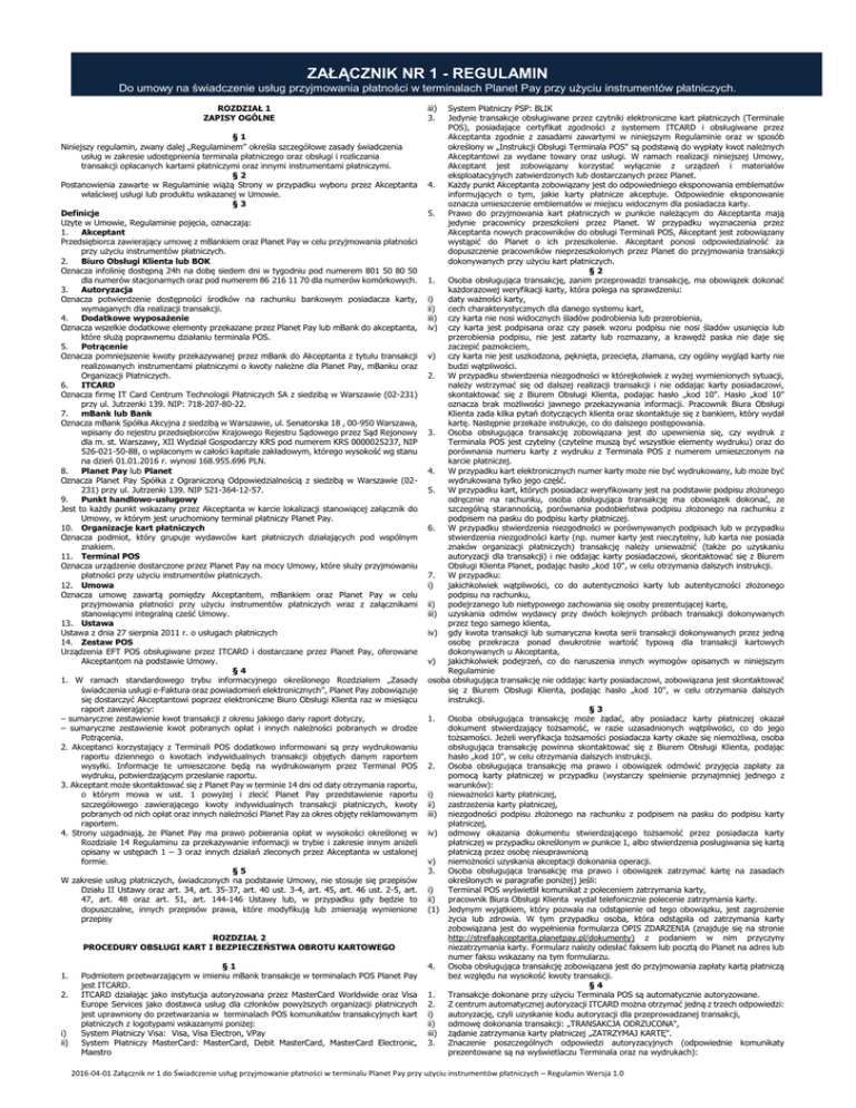 ZAŁĄCZNIK NR 1 - REGULAMIN Do umowy na świadczenie usług przyjmowania płatności w terminalach Planet Pay przy użyciu instrumentów płatniczych. ROZDZIAŁ 1 ZAPISY OGÓLNE §1 Niniejszy regulamin, zwany dalej „Regulaminem” określa szczegółowe zasady świadczenia usług w zakresie udostępnienia terminala płatniczego oraz obsługi i rozliczania transakcji opłacanych kartami płatniczymi oraz innymi instrumentami płatniczymi. §2 Postanowienia zawarte w Regulaminie wiążą Strony w przypadku wyboru przez Akceptanta właściwej usługi lub produktu wskazanej w Umowie. §3 Definicje Użyte w Umowie, Regulaminie pojęcia, oznaczają: 1. Akceptant Przedsiębiorca zawierający umowę z mBankiem oraz Planet Pay w celu przyjmowania płatności przy użyciu instrumentów płatniczych. 2. Biuro Obsługi Klienta lub BOK Oznacza infolinię dostępną 24h na dobę siedem dni w tygodniu pod numerem 801 50 80 50 dla numerów stacjonarnych oraz pod numerem 86 216 11 70 dla numerów komórkowych. 3. Autoryzacja Oznacza potwierdzenie dostępności środków na rachunku bankowym posiadacza karty, wymaganych dla realizacji transakcji. 4. Dodatkowe wyposażenie Oznacza wszelkie dodatkowe elementy przekazane przez Planet Pay lub mBank do akceptanta, które służą poprawnemu działaniu terminala POS. 5. Potrącenie Oznacza pomniejszenie kwoty przekazywanej przez mBank do Akceptanta z tytułu transakcji realizowanych instrumentami płatniczymi o kwoty należne dla Planet Pay, mBanku oraz Organizacji Płatniczych. 6. ITCARD Oznacza firmę IT Card Centrum Technologii Płatniczych SA z siedzibą w Warszawie (02-231) przy ul. Jutrzenki 139. NIP: 718-207-80-22. 7. mBank lub Bank Oznacza mBank Spółka Akcyjna z siedzibą w Warszawie, ul. Senatorska 18 , 00-950 Warszawa, wpisany do rejestru przedsiębiorców Krajowego Rejestru Sądowego przez Sąd Rejonowy dla m. st. Warszawy, XII Wydział Gospodarczy KRS pod numerem KRS 0000025237, NIP 526-021-50-88, o wpłaconym w całości kapitale zakładowym, którego wysokość wg stanu na dzień 01.01.2016 r. wynosi 168.955.696 PLN. 8. Planet Pay lub Planet Oznacza Planet Pay Spółka z Ograniczoną Odpowiedzialnością z siedzibą w Warszawie (02231) przy ul. Jutrzenki 139. NIP 521-364-12-57. 9. Punkt handlowo-usługowy Jest to każdy punkt wskazany przez Akceptanta w karcie lokalizacji stanowiącej załącznik do Umowy, w którym jest uruchomiony terminal płatniczy Planet Pay. 10. Organizacje kart płatniczych Oznacza podmiot, który grupuje wydawców kart płatniczych działających pod wspólnym znakiem. 11. Terminal POS Oznacza urządzenie dostarczone przez Planet Pay na mocy Umowy, które służy przyjmowaniu płatności przy użyciu instrumentów płatniczych. 12. Umowa Oznacza umowę zawartą pomiędzy Akceptantem, mBankiem oraz Planet Pay w celu przyjmowania płatności przy użyciu instrumentów płatniczych wraz z załącznikami stanowiącymi integralną cześć Umowy. 13. Ustawa Ustawa z dnia 27 sierpnia 2011 r. o usługach płatniczych 14. Zestaw POS Urządzenia EFT POS obsługiwane przez ITCARD i dostarczane przez Planet Pay, oferowane Akceptantom na podstawie Umowy. §4 1. W ramach standardowego trybu informacyjnego określonego Rozdziałem „Zasady świadczenia usługi e-Faktura oraz powiadomień elektronicznych”, Planet Pay zobowiązuje się dostarczyć Akceptantowi poprzez elektroniczne Biuro Obsługi Klienta raz w miesiącu raport zawierający: – sumaryczne zestawienie kwot transakcji z okresu jakiego dany raport dotyczy, – sumaryczne zestawienie kwot pobranych opłat i innych należności pobranych w drodze Potrącenia. 2. Akceptanci korzystający z Terminali POS dodatkowo informowani są przy wydrukowaniu raportu dziennego o kwotach indywidualnych transakcji objętych danym raportem wysyłki. Informacje te umieszczone będą na wydrukowanym przez Terminal POS wydruku, potwierdzającym przesłanie raportu. 3. Akceptant może skontaktować się z Planet Pay w terminie 14 dni od daty otrzymania raportu, o którym mowa w ust. 1 powyżej i zlecić Planet Pay przedstawienie raportu szczegółowego zawierającego kwoty indywidualnych transakcji płatniczych, kwoty pobranych od nich opłat oraz innych należności Planet Pay za okres objęty reklamowanym raportem. 4. Strony uzgadniają, że Planet Pay ma prawo pobierania opłat w wysokości określonej w Rozdziale 14 Regulaminu za przekazywanie informacji w trybie i zakresie innym aniżeli opisany w ustępach 1 – 3 oraz innych działań zleconych przez Akceptanta w ustalonej formie. §5 W zakresie usług płatniczych, świadczonych na podstawie Umowy, nie stosuje się przepisów Działu II Ustawy oraz art. 34, art. 35-37, art. 40 ust. 3-4, art. 45, art. 46 ust. 2-5, art. 47, art. 48 oraz art. 51, art. 144-146 Ustawy lub, w przypadku gdy będzie to dopuszczalne, innych przepisów prawa, które modyfikują lub zmieniają wymienione przepisy ROZDZIAŁ 2 PROCEDURY OBSŁUGI KART I BEZPIECZEŃSTWA OBROTU KARTOWEGO 1. 2. i) ii) §1 Podmiotem przetwarzającym w imieniu mBank transakcje w terminalach POS Planet Pay jest ITCARD. ITCARD działając jako instytucja autoryzowana przez MasterCard Worldwide oraz Visa Europe Services jako dostawca usług dla członków powyższych organizacji płatniczych jest uprawniony do przetwarzania w terminalach POS komunikatów transakcyjnych kart płatniczych z logotypami wskazanymi poniżej: System Płatniczy Visa: Visa, Visa Electron, VPay System Płatniczy MasterCard: MasterCard, Debit MasterCard, MasterCard Electronic, Maestro iii) 3. System Płatniczy PSP: BLIK Jedynie transakcje obsługiwane przez czytniki elektroniczne kart płatniczych (Terminale POS), posiadające certyfikat zgodności z systemem ITCARD i obsługiwane przez Akceptanta zgodnie z zasadami zawartymi w niniejszym Regulaminie oraz w sposób określony w „Instrukcji Obsługi Terminala POS" są podstawą do wypłaty kwot należnych Akceptantowi za wydane towary oraz usługi. W ramach reali