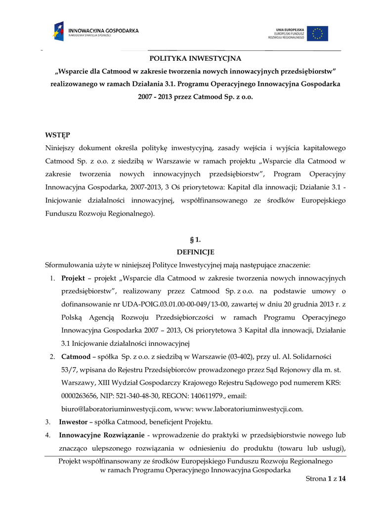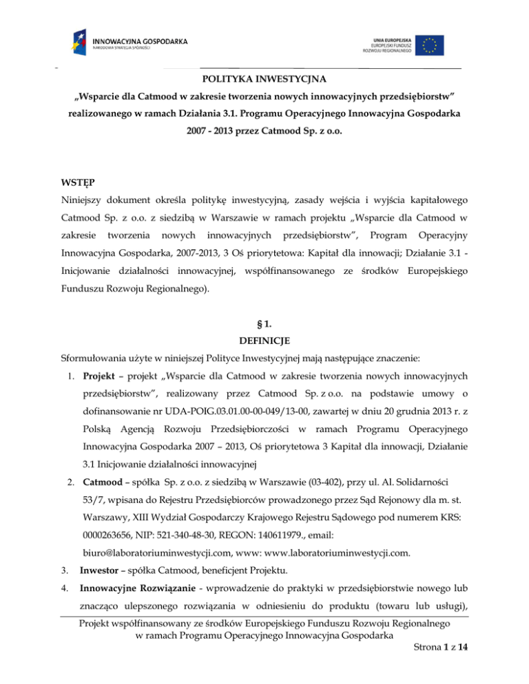 POLITYKA INWESTYCJNA „Wsparcie dla Catmood w zakresie tworzenia nowych innowacyjnych przedsiębiorstw” realizowanego w ramach Działania 3.1. Programu Operacyjnego Innowacyjna Gospodarka 2007 - 2013 przez Catmood Sp. z o.o. WSTĘP Niniejszy dokument określa politykę inwestycyjną, zasady wejścia i wyjścia kapitałowego Catmood Sp. z o.o. z siedzibą w Warszawie w ramach projektu „Wsparcie dla Catmood w zakresie tworzenia nowych innowacyjnych przedsiębiorstw”, Program Operacyjny Innowacyjna Gospodarka, 2007-2013, 3 Oś priorytetowa: Kapitał dla innowacji; Działanie 3.1 Inicjowanie działalności innowacyjnej, współfinansowanego ze środków Europejskiego Funduszu Rozwoju Regionalnego). § 1. DEFINICJE Sformułowania użyte w niniejszej Polityce Inwestycyjnej mają następujące znaczenie: 1. Projekt – projekt „Wsparcie dla Catmood w zakresie tworzenia nowych innowacyjnych przedsiębiorstw”, realizowany przez Catmood Sp. z o.o. na podstawie umowy o dofinansowanie nr UDA-POIG.03.01.00-00-049/13-00, zawartej w dniu 20 grudnia 2013 r. z Polską Agencją Rozwoju Przedsiębiorczości w ramach Programu Operacyjnego Innowacyjna Gospodarka 2007 – 2013, Oś priorytetowa 3 Kapitał dla innowacji, Działanie 3.1 Inicjowanie działalności innowacyjnej 2. Catmood – spółka Sp. z o.o. z siedzibą w Warszawie (03-402), przy ul. Al. Solidarności 53/7, wpisana do Rejestru Przedsiębiorców prowadzonego przez Sąd Rejonowy dla m. st. Warszawy, XIII Wydział Gospodarczy Krajowego Rejestru Sądowego pod numerem KRS: 0000263656, NIP: 521-340-48-30, REGON: 140611979., email: [email protected], www: www.laboratoriuminwestycji.com. 3. Inwestor – spółka Catmood, beneficjent Projektu. 4. Innowacyjne Rozwiązanie - wprowadzenie do praktyki w przedsiębiorstwie nowego lub znacząco ulepszonego rozwiązania w odniesieniu do produktu (towaru lub usługi), Projekt współfinansowany ze środków Europejskiego Funduszu Rozwoju Regionalnego w ramach Programu Operacyjnego Innowacyjna Gospodarka Strona 1 z 14 procesu, marketingu lub organizacji. Istotą innowacji jest wdrożenie nowości do praktyki. Do Innowacyjnych Rozwiązań zaliczają się: a.) innowacja produktowa – oznacza wprowadzenie na rynek przez dane przedsiębiorstwo nowego towaru lub usługi, lub znaczące ulepszenie oferowanych uprzednio towarów lub usług w odniesieniu do ich charakterystyk lub przeznaczenia. Ulepszenie może dotyczyć charakterystyk technicznych, komponentów, materiałów, wbudowanego oprogramowania, bardziej przyjaznej obsługi przez użytkownika oraz innych cech funkcjonalnych, b.) innowacja procesowa – oznacza wprowadzenie do praktyki w przedsiębiorstwie nowych, lub znacząco ulepszonych, metod produkcji lub dostaw, c.) innowacja marketingowa – oznacza zastosowanie nowej metody marketingowej obejmującej znaczące zmiany w wyglądzie produktu, jego opakowaniu, pozycjonowaniu, promocji, polityce cenowej lub modelu biznesowym, wynikającej z nowej strategii marketingowej przedsiębiorstwa, d.) innowacja organizacyjna – oznacza zastosowanie w przedsiębiorstwie nowej metody organizacji jego działalności biznesowej, nowej organizacji miejsc pracy lub nowej organizacji relacji zewnętrznych. 5. Pomysł – koncepcja Innowacyjnego Rozwiązania, które na podstawie Formularza zgłoszeniowego Pomysłu zostało przekazane do Catmood na Etapie Selekcji w celu oceny zmierzającej do zakwalifikowania do Etapu Preinkubacji pod kątem innowacyjnej działalności biznesowej realizowanej przez nowo powstałą Spółkę. 6. Inwestycja – objęcie udziałów lub akcji w Spółce utworzonej w ramach Projektu. 7. Koinwestor – Przedsiębiorca obejmujący w zamian za wkład w formie pieniężnej udziały lub akcje w Spółce. 8. PARP – Polska Agencja Rozwoju Przedsiębiorczości. 9. Pomysłodawca – zdolna do czynności prawnych osoba fizyczna, zespół osób fizycznych, zarejestrowana osoba prawna, będące autorami właścicielami lub współwłaścicielami Pomysłu i posiadający pełnię praw do dysponowania Pomysłem. 10. Spółka – spółka kapitałowa prawa handlowego, tj. spółka z ograniczoną odpowiedzialnością lub spółka akcyjna, oparta na Innowacyjnym Rozwiązaniu, powstała w wyniku Procesu Inwestycyjnego, Projekt współfinansowany ze środków Europejskiego Funduszu Rozwoju Regionalnego w ramach Programu Operacyjnego Innowacyjna Gospodarka Strona 2 z 14 11. Formularz zgłoszeniowy Pomysłu– formularz stanowiący opis Pomysłu zgłaszanego przez Pomysłodawcę na Etapie Selekcji, wypełniony w języku polskim dostępny na stronie www.laboratoriuminwestycji.com. 12. Karta oceny Pomysłu– analiza Pomysłu wykonana przez członka lub członków Zespołu Projektu, w oparciu o Formularz zgłoszeniowy Pomysłu wraz rekomendacją dotyczącą Preinkubacji. 13. Biznes Plan – szczegółowy opis oraz plan realizacji Pomysłu wraz z określeniem planowanych nakładów finansowych oraz sposobu ich wykorzystania. 14. Karta oceny Biznes Planu - analiza Pomysłu wykonana przez członka lub członków Zespołu Projektu i/lub ekspertów zewnętrznych, w oparciu o Biznes Plan wraz rekomendacją dotyczącą Wejścia Kapitałowego. 15. Strona Internetowa – strona internetowa Projektu Catmood dostępna pod adresem www.laboratoriuminwestycji.com, na której udostępniony został Formularz zgłoszeniowy Pomysłu. 16. Proces Inwestycyjny – wieloetapowy proces pozyskania finansowania na Pomysł przez Pomysłodawcę, na który składają się: Etap Selekcji, Etap Preinkubacji, Etap Założenia. 17. Etap Selekcji – weryfikacja potencjału biznesowego Pomysłu oraz doświadczenia Pomysłodawcy dokonywana przez członka lub członków Zespołu Projektu na podstawie Formularza zgłoszeniowego Pomysłu. W wyniku Etapu Selekcji Komitet Inwestycyjny spośród 300 (lub więcej) Pomysłów, wyłoni co najmniej 40, które będą analizowane na Etapie Preinkubacji. 18. Etap Preinkubacji – drugi etap obejmując