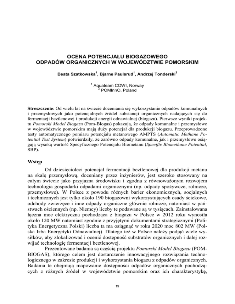 OCENA POTENCJAŁU BIOGAZOWEGO ODPADÓW ORGANICZNYCH W WOJEWÓDZTWIE POMORSKIM 1 1 Beata Szatkowska , Bjarne Paulsrud , Andrzej Tonderski 1 2 Aquateam COWI, Norway 2 POMInnO, Poland Streszczenie: Od wielu lat na świecie doceniania się wykorzystanie odpadów komunalnych i przemysłowych jako potencjalnych źródeł substancji organicznych nadających się do fermentacji beztlenowej i produkcji energii odnawialnej (biogazu). Pierwsze wyniki projektu Pomorski Model Biogazu (Pom-Biogas) pokazują, że odpady komunalne i przemysłowe w województwie pomorskim mają duży potencjał dla produkcji biogazu. Przeprowadzone testy automatycznego pomiaru potencjału metanowego AMPTS (Automatic Methane Potential Test System) potwierdziły, że zarówno odpady komunalne, jak i przemysłowe osiągają wysoką wartość Specyficznego Potencjału Biometanu (Specific Biomethane Potential, SBP). Wstęp Od dziesięcioleci potencjał fermentacji beztlenowej dla produkcji metanu na skalę przemysłową, doceniany przez inżynierów, jest szeroko stosowany na całym świecie jako przyjazna środowisku i zgodna z równoważonym rozwojem technologia gospodarki odpadami organicznymi (np. odpady spożywcze, rolnicze, przemysłowe). W Polsce z powodu różnych barier ekonomicznych, socjalnych i technicznych jest tylko około 190 biogazowni wykorzystujących osady ściekowe, odchody zwierzęce i inne odpady organiczne głównie rolnicze, natomiast w państwach ościennych (np. Niemcy) liczby te podawane są w tysiącach. Zainstalowana łączna moc elektryczna pochodząca z biogazu w Polsce w 2012 roku wynosiła około 120 MW natomiast zgodnie z przyjętymi dokumentami strategicznymi (Polityka Energetyczna Polski) liczba ta ma osiągnąć w roku 2020 moc 802 MW (Polska Izba Energetyki Odnawialnej). Dlatego też w Polsce należy podjąć wiele wysiłków, aby zlokalizować i ocenić dostępność substratów organicznych i dalej rozwijać technologię fermentacji beztlenowej. Prezentowane badania są częścią projektu Pomorski Model Biogazu (POMBIOGAS), którego celem jest dostarczenie innowacyjnego rozwiązania technologicznego w zakresie produkcji i wykorzystania biogazu z odpadów organicznych. Badania te obejmują mapowanie dostępności odpadów organicznych pochodzących z różnych źródeł w województwie pomorskim oraz ich charakterystykę, 19 w szczególności ocenę ich Specyficznego Potencjału Biometanowego (Specific Biomethane Potential, SBP). Metodyka Ocena dostępności substratów organicznych w regionie pomorskim została oparta głównie na danych statystycznych pozyskanych z Urzędu Marszałkowskiego w Gdańsku, Głównego Urzędu Statystycznego, Planu Gospodarki Odpadami dla Województwa Pomorskiego 2018 i Agencji Restrukturyzacji i Modernizacji Rolnictwa. Pozyskane dane zostały poddane analizie graficznej GIS (Geographic Information Systems). W celu dokonania oceny potencjału wybranych substratów organicznych użyto systemu do automatycznego pomiaru metanu AMPTS II (Automatic Methane Potential Test System) (rys. 1). AMPTS jest urządzeniem wykorzystywanym do określenia potencjału biogazu poszczególnych substratów lub mieszaniny substratów. System jest prawie w pełni automatyczny i wymaga jedynie starannej konfiguracji urządzenia. Prosta obsługa sprawia, że łatwo porównać kilka substratów (lub mieszaniny) w dokładnie tych samych warunkach (system testów porcjowych). Rys. 1. System AMPTS Wyniki Województwo pomorskie, zlokalizowane w północnej Polsce, dzieli granice z czterema innymi województwami oraz Rosją. Centrum administracji jest Gdańsk, który wraz z dwoma innymi miastami (Sopotem i Gdynią) tworzą aglomerację Trójmiasta o liczbie mieszkańców około 1 mln. W całym województwie zostały zidentyfikowane, jako ważne dla regionu pomorskiego, następujące źródła odpadów organicznych: − odpady organiczne ze źródeł przemysłowych; − osady z oczyszczalni ścieków przemysłowych i komunalnych; − odpady komunalne ulegających biodegradacji (głównie odpady spożywcze); − odpady rolnicze ulegających biodegradacji (odchody). 20 Informacje o najbardziej powszechnych rodzajach odpadów organicznych zostały przeanalizowane w promieniu 50 i 25 km od Gdańska. W odległości do 50 km od Gdańska całkowita ilość odpadów wynosi 3 280 973 t/rok, i dzieli się na: 446 676 t/rok – odpady przemysłowe, 28 192 t/rok – osady, 2 270 772 t/rok – odpady rolnicze (odchody zwierzęce) i 535 333 t/rok – organiczne odpady komunalne. Ze względu na fakt, iż (1) biogazownie oparte na odpadach rolniczych są dobrze znane, (2) osady (głównie ściekowe) są wykorzystywane w komorach fermentacyjnych na oczyszczalniach ścieków, dla dalszych badań (testów AMPTS) wybrano odpady komunalne i przemysłowe. W testach AMPTS, różne frakcje odpadów komunalnych wykazały specyficzny potencjał biometanowy (SBP) wahający się w zakresie 295–415 Nml/g s.m.o. (volatile solids, VS), podczas gdy odpady przemysłowe potencjał miały w przedziale 357–524 Nml/g s.m.o. Najwyższy potencjał SBP pośród wszystkich testowanych substratów organicznych został odnotowany dla przeterminowanych produktów żywnościowych z supermarketu i wynosił 524 Nml/g s.m.o. Ponadto wysoki potencjał SBP wynoszący 464 Nml/g s.m.o. zarejestrowano dla mieszaniny substratów: komunalnej frakcji organicznej i odpadów przemysłowych (supermarket). Wnioski Biogazownie oparte na wykorzystaniu pozostałości rolniczych (głównie odchodów, ale również specjalnie produkowaną biomasę) stały się bardzo popularne, natomiast doświadczenia i badania naukowe na temat produkcji biogazu z organicznych frakcji odpadów komunalnych i przemysłowych w Polsce są nadal bardzo ograniczone. Badania w projekcie POM-BIOGAS pokazały, że komunalne i przemysłowe odpady w województwie pomorskim w ilości bliskiej 1 miliona t/rok (w odległości 50 km od Gdańska) są ważnym źródłem materiału 