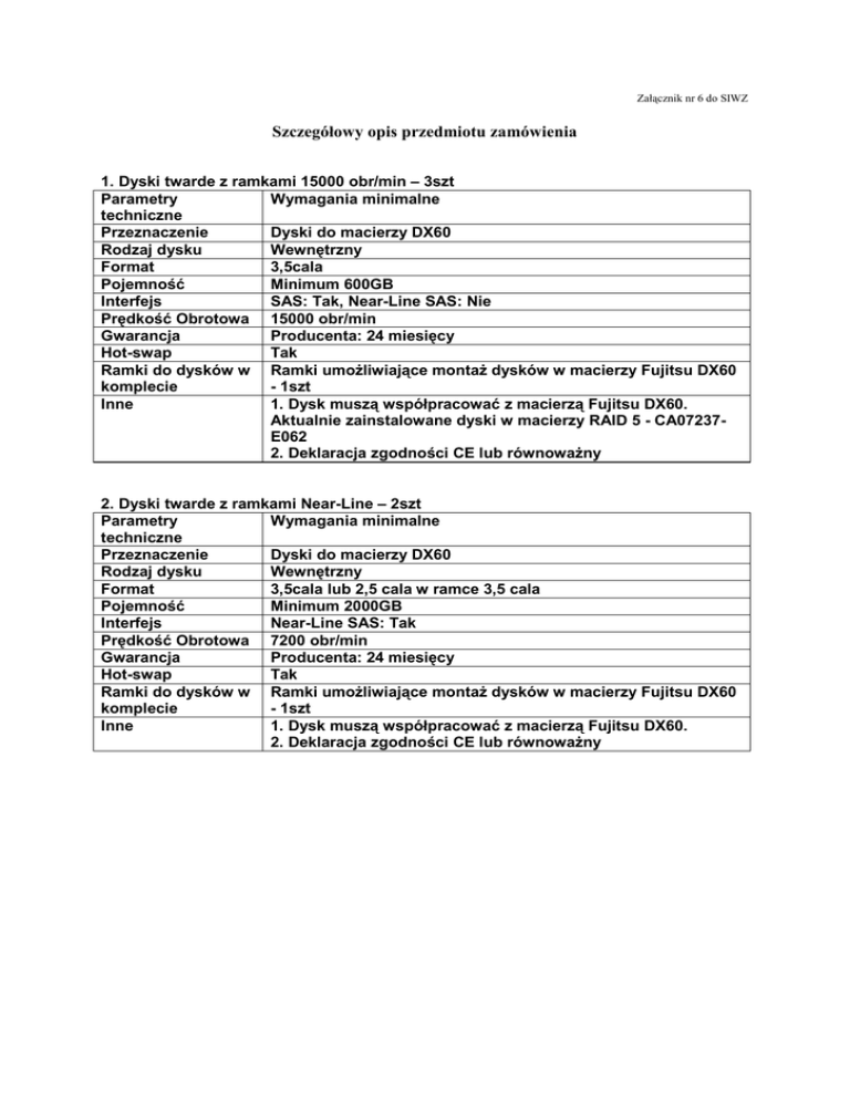 Załącznik nr 6 do SIWZ Szczegółowy opis przedmiotu zamówienia 1. Dyski twarde z ramkami 15000 obr/min – 3szt Parametry Wymagania minimalne techniczne Przeznaczenie Dyski do macierzy DX60 Rodzaj dysku Wewnętrzny Format 3,5cala Pojemność Minimum 600GB Interfejs SAS: Tak, Near-Line SAS: Nie Prędkość Obrotowa 15000 obr/min Gwarancja Producenta: 24 miesięcy Hot-swap Tak Ramki do dysków w Ramki umożliwiające montaż dysków w macierzy Fujitsu DX60 komplecie - 1szt Inne 1. Dysk muszą współpracować z macierzą Fujitsu DX60. Aktualnie zainstalowane dyski w macierzy RAID 5 - CA07237E062 2. Deklaracja zgodności CE lub równoważny 2. Dyski twarde z ramkami Near-Line – 2szt Parametry Wymagania minimalne techniczne Przeznaczenie Dyski do macierzy DX60 Rodzaj dysku Wewnętrzny Format 3,5cala lub 2,5 cala w ramce 3,5 cala Pojemność Minimum 2000GB Interfejs Near-Line SAS: Tak Prędkość Obrotowa 7200 obr/min Gwarancja Producenta: 24 miesięcy Hot-swap Tak Ramki do dysków w Ramki umożliwiające montaż dysków w macierzy Fujitsu DX60 komplecie - 1szt Inne 1. Dysk muszą współpracować z macierzą Fujitsu DX60. 2. Deklaracja zgodności CE lub równoważny