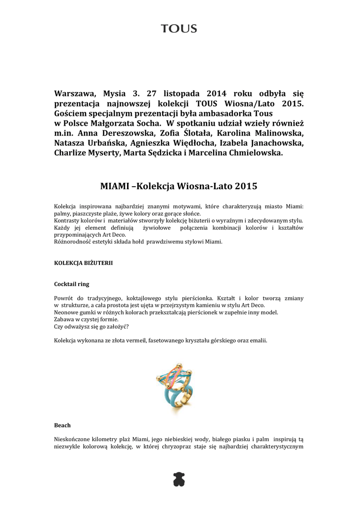 Warszawa, Mysia 3. 27 listopada 2014 roku odbyła się prezentacja najnowszej kolekcji TOUS Wiosna/Lato 2015. Gościem specjalnym prezentacji była ambasadorka Tous w Polsce Małgorzata Socha. W spotkaniu udział wzieły również m.in. Anna Dereszowska, Zofia Ślotała, Karolina Malinowska, Natasza Urbańska, Agnieszka Więdłocha, Izabela Janachowska, Charlize Myserty, Marta Sędzicka i Marcelina Chmielowska. MIAMI –Kolekcja Wiosna-Lato 2015 Kolekcja inspirowana najbardziej znanymi motywami, które charakteryzują miasto Miami: palmy, piaszczyste plaże, żywe kolory oraz gorące słońce. Kontrasty kolorów i materiałów stworzyły kolekcję biżuterii o wyraźnym i zdecydowanym stylu. Każdy jej element definiują żywiołowe połączenia kombinacji kolorów i kształtów przypominających Art Deco. Różnorodność estetyki składa hołd prawdziwemu stylowi Miami. KOLEKCJA BIŻUTERII Cocktail ring Powrót do tradycyjnego, koktajlowego stylu pierścionka. Kształt i kolor tworzą zmiany w strukturze, a cała prostota jest ujęta w przejrzystym kamieniu w stylu Art Deco. Neonowe gumki w różnych kolorach przekształcają pierścionek w zupełnie inny model. Zabawa w czystej formie. Czy odważysz się go założyć? Kolekcja wykonana ze złota vermeil, fasetowanego kryształu górskiego oraz emalii. Beach Nieskończone kilometry plaż Miami, jego niebieskiej wody, białego piasku i palm inspirują tą niezwykle kolorową kolekcję, w której chryzopraz staje się najbardziej charakterystycznym elementem. Połączenie 18-karatowego złota i innych kamieni szlachetnych tworzy letnią i radosną kolekcję. Cone Tack Ćwieki zostały odświeżone! Kamienie szlachetne ścięte w kształ stożka zajęły miejsce tradycyjnych ćwieków i dodały koloru do zabawnego, codziennego looku. Różowy kwarc, turkus i masa perłowa w połączeniu z 18-karatowym złotem. Czy można sobie wyobrazić lepszy sposób, aby wydobyć kolor dla trendu punk? Miamix Rubin i turkus symbolizują kontrasty miasta Miami: zabawa w nocy i relaks w ciągu dnia. Dwa światy połączone w 18 karatowym złocie dają niepowtarzalną konsystencję tej kolekcji. Sweet Diamonds Diament, wyjątkowy i unikatowy kamień szlachetny, ponownie wykorzystany jako propozycja na dzień, jako dopełnienie miejskiego stylu. Delikatnie połączony ze sznurkiem bransoletki lub klasycznym pierścionkiem, diamenty stają się must-have. Mix Color Dzień się kończy, a blask nocnych świateł łączy się ze sobą tworząc czarującą i elegancką kolekcję. Kolekcja wykonana z 18-karatowego złota w połączeniu z żywymi kolorami kamieni szlachetnych: turmaliny, spinele, opale i tanzanity, które zamieniają tę kolekcję w eksplozję kolorów. Kolekcja, która rozpala nocne światła w Miami. Heaven Anioł czy diabeł? Życie zawsze ma dwa punkty widzenia: to co dobre wygląda źle i to co złe wygląda dobrze. Biżuteria wykonana ze srebra, złota vermeil, 18-karatowego złota i diamentów. New Sisy Gorące Miami charakteryzuje kolor, lekkość materiałów i ruch. Dlaczego nie włączyć wszystkich tych elementów do biżuterii? Kolekcja New Sisy wykonana z tytanu w połączeniu z ametystem i topazem,co czyni ją niezbędnym dodatkiem na lato. Hand Kolor, kolor i jeszcze raz kolor! Hand to kombinacja materiałów i kolorów. Elementy ze złota vermeil w połączeniu z lekkimi sznureczkami w jasnych kolorach odzwierciedlają kontrasty Miami. Grit Miękki blask słońca na piasku Miami zainspirował Grit, kolekcję o miękkich liniach, falistych kształtach i organicznej fakturze. Grit to kolekcja wykonana ze złota vermeil, która przywołuje energię i ciepło słońca Miami. LINK DO ZDJĘĆ Z WYDARZENIA: http://www.akpa.pl/imprezy.php?id=23646&type=0&width=1663 LINK DO ZDJĘĆ I OPISU KOLEKCJI: www.oriens-bijou.pl/pub/TOUSwiosna-lato2015Miami.zip KONTAKT: Aqua PR Paweł Bieńkowski [email protected] tel. 501 167 409 Oriens Bijou – przedstawiciel TOUS w Polsce Marketing Manager Michał Pala [email protected] tel. 600 945 245