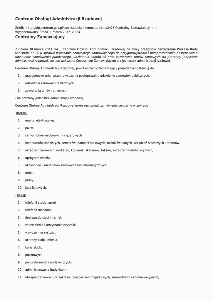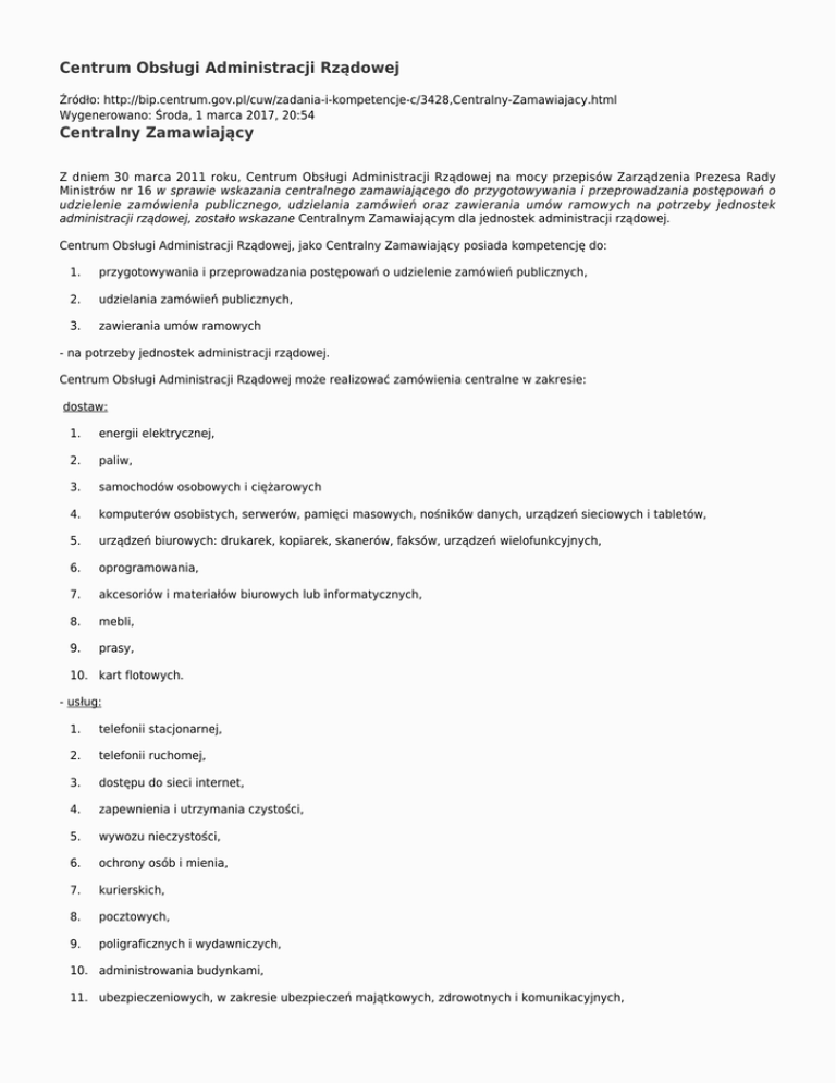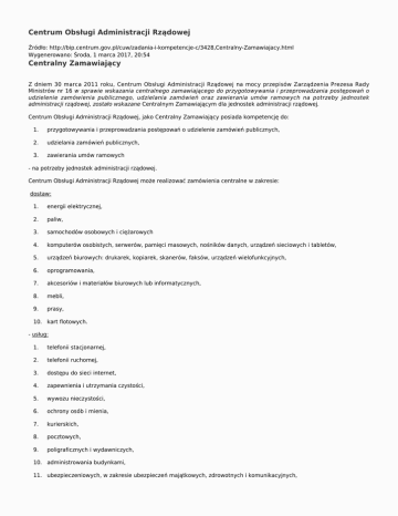 Centrum Obsługi Administracji Rządowej Źródło: http://bip.centrum.gov.pl/cuw/zadania-i-kompetencje-c/3428,Centralny-Zamawiajacy.html Wygenerowano: Środa, 1 marca 2017, 20:54 Centralny Zamawiający Z dniem 30 marca 2011 roku, Centrum Obsługi Administracji Rządowej na mocy przepisów Zarządzenia Prezesa Rady Ministrów nr 16 w sprawie wskazania centralnego zamawiającego do przygotowywania i przeprowadzania postępowań o udzielenie zamówienia publicznego, udzielania zamówień oraz zawierania umów ramowych na potrzeby jednostek administracji rządowej, zostało wskazane Centralnym Zamawiającym dla jednostek administracji rządowej. Centrum Obsługi Administracji Rządowej, jako Centralny Zamawiający posiada kompetencję do: 1. przygotowywania i przeprowadzania postępowań o udzielenie zamówień publicznych, 2. udzielania zamówień publicznych, 3. zawierania umów ramowych - na potrzeby jednostek administracji rządowej. Centrum Obsługi Administracji Rządowej może realizować zamówienia centralne w zakresie: dostaw: 1. energii elektrycznej, 2. paliw, 3. samochodów osobowych i ciężarowych 4. komputerów osobistych, serwerów, pamięci masowych, nośników danych, urządzeń sieciowych i tabletów, 5. urządzeń biurowych: drukarek, kopiarek, skanerów, faksów, urządzeń wielofunkcyjnych, 6. oprogramowania, 7. akcesoriów i materiałów biurowych lub informatycznych, 8. mebli, 9. prasy, 10. kart flotowych. - usług: 1. telefonii stacjonarnej, 2. telefonii ruchomej, 3. dostępu do sieci internet, 4. zapewnienia i utrzymania czystości, 5. wywozu nieczystości, 6. ochrony osób i mienia, 7. kurierskich, 8. pocztowych, 9. poligraficznych i wydawniczych, 10. administrowania budynkami, 11. ubezpieczeniowych, w zakresie ubezpieczeń majątkowych, zdrowotnych i komunikacyjnych, 12. medycznych, 13. serwisu i obsługi pogwarancyjnej samochodów osobowych i ciężarowych, 14. transportu lotniczego, 15. szkoleniowych, 16. najmu samochodów osobowych i ciężarowych, komputerów osobistych, serwerów, pamięci masowych, nośników danych, urządzeń sieciowych i tabletów, urządzeń biurowych: drukarek, kopiarek, skanerów, faksów, urządzeń wielofunkcyjnych oraz mebli. Szef Kancelarii Prezesa Rady Ministrów określa, w terminie do dnia 30 listopada każdego roku, wykaz dostaw i usług, które w roku następnym będą realizowane przez Centrum Obsługi Administracji Rządowej jako zamówienia centralne. Zamówienia centralne w 2011 roku: 1. usługi telefonii ruchomej 2. usługi ubezpieczeniowe w zakresie ubezpieczeń komunikacyjnych 3. dostawa kart flotowych Zamówienia centralne w 2012 roku: 1. dostawa komputerów stacjonarnych i przenośnych, 2. dostawa akcesoriów i materiałów biurowych 3. dostawa biletów lotniczych 4. usługi ubezpieczeniowe w zakresie ubezpieczeń majątkowych, 5. usługi kurierskie, Zamówienia centralne w 2013 roku: 1. dostawa komputerów osobistych stacjonarnych i przenośnych oraz tabletów, 2. dostawa energii elektrycznej, 3. dostawa samochodów osobistych, 4. dostawa oprogramowania w zakresie systemu informacji prawnej, 5. usługi telefonii stacjonarnej, 6. usługi kurierskie w zakresie przesyłek krajowych. Centrum Obsługi Administracji Rządowej może wykonywać czynności również w zakresie nieobjętym przepisami ww. Zarządzenia, na zasadach określonych odrębnymi porozumieniami i na mocy udzielonych pełnomocnictw. Data publikacji 25.09.2013 Data modyfikacji 02.01.2017 Rejestr zmian Autor: Redaktor Centrum Osoba publikująca: Redaktor Centrum Statystyka strony: 13372 wizyt