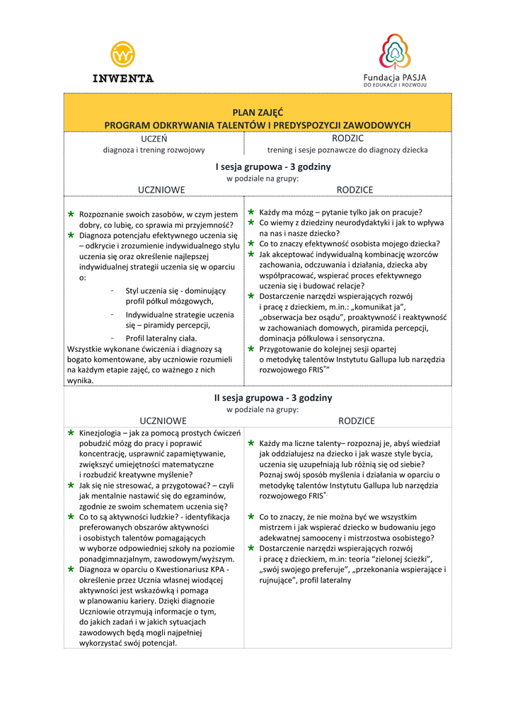PLAN ZAJĘĆ PROGRAM ODKRYWANIA TALENTÓW I PREDYSPOZYCJI ZAWODOWYCH RODZIC UCZEŃ diagnoza i trening rozwojowy trening i sesje poznawcze do diagnozy dziecka I sesja grupowa - 3 godziny w podziale na grupy: UCZNIOWE RODZICE Rozpoznanie swoich zasobów, w czym jestem dobry, co lubię, co sprawia mi przyjemność? Diagnoza potencjału efektywnego uczenia się – odkrycie i zrozumienie indywidualnego stylu uczenia się oraz określenie najlepszej indywidualnej strategii uczenia się w oparciu o: - Styl uczenia się - dominujący profil półkul mózgowych, - Indywidualne strategie uczenia się – piramidy percepcji, - Profil lateralny ciała. Wszystkie wykonane ćwiczenia i diagnozy są bogato komentowane, aby uczniowie rozumieli na każdym etapie zajęć, co ważnego z nich wynika. Każdy ma mózg – pytanie tylko jak on pracuje? Co wiemy z dziedziny neurodydaktyki i jak to wpływa na nas i nasze dziecko? Co to znaczy efektywność osobista mojego dziecka? Jak akceptować indywidualną kombinację wzorców zachowania, odczuwania i działania, dziecka aby współpracować, wspierać proces efektywnego uczenia się i budować relacje? Dostarczenie narzędzi wspierających rozwój i pracę z dzieckiem, m.in.: „komunikat ja”, „obserwacja bez osądu”, proaktywność i reaktywność w zachowaniach domowych, piramida percepcji, dominacja półkulowa i sensoryczna. Przygotowanie do kolejnej sesji opartej o metodykę talentów Instytutu Gallupa lub narzędzia rozwojowego FRIS®” II sesja grupowa - 3 godziny w podziale na grupy: UCZNIOWE RODZICE Kinezjologia – jak za pomocą prostych ćwiczeń pobudzić mózg do pracy i poprawić Każdy ma liczne talenty– rozpoznaj je, abyś wiedział koncentrację, usprawnić zapamiętywanie, jak oddziałujesz na dziecko i jak wasze style bycia, zwiększyć umiejętności matematyczne uczenia się uzupełniają lub różnią się od siebie? i rozbudzić kreatywne myślenie? Poznaj swój sposób myślenia i działania w oparciu o Jak się nie stresować, a przygotować? – czyli metodykę talentów Instytutu Gallupa lub narzędzia jak mentalnie nastawić się do egzaminów, rozwojowego FRIS®. zgodnie ze swoim schematem uczenia się? Co to są aktywności ludzkie? - identyfikacja Co to znaczy, że nie można być we wszystkim preferowanych obszarów aktywności mistrzem i jak wspierać dziecko w budowaniu jego i osobistych talentów pomagających adekwatnej samooceny i mistrzostwa osobistego? w wyborze odpowiedniej szkoły na poziomie Dostarczenie narzędzi wspierających rozwój ponadgimnazjalnym, zawodowym/wyższym. i pracę z dzieckiem, m.in: teoria “zielonej ścieżki”, Diagnoza w oparciu o Kwestionariusz KPA „swój swojego preferuje”, „przekonania wspierające i określenie przez Ucznia własnej wiodącej rujnujące”, profil lateralny aktywności jest wskazówką i pomaga w planowaniu kariery. Dzięki diagnozie Uczniowie otrzymują informacje o tym, do jakich zadań i w jakich sytuacjach zawodowych będą mogli najpełniej wykorzystać swój potencjał. PODSUMOWANIE PROGRAMU Indywidualne spotkanie: uczeń, rodzic i trenerzy rozwoju - ok. 1 godz. Celem spotkania jest: - usystematyzowane przedstawienie wyników i wniosków z diagnoz, - uzupełnienie informacji, których uczeń potrzebuje w kontekście samoświadomości i wyboru swojej ścieżki zawodowej, - uzupełnienie informacji w kontekście wszystkich przeprowadzonych diagnoz i ich korelacji, - przekazanie zestawu ćwiczeń kinezjologicznych usprawniających efektywne uczenie się - przekazanie wskazówek do pracy w domu i szkole, m.in. w oparciu o wyniki diagnostyczne. Metody wykorzystywane w czasie sesji Sesje prowadzone będą technikami interaktywnymi z pełnym zaangażowaniem uczestników, w oparciu o współczesną wiedzę i wyniki badań o budowie i funkcjonowaniu ludzkiego mózgu. Wykłady, tylko w sesjach dla Rodziców: wykłady pozwalają na przedstawienie materiału w sposób logiczny i bezpośredni. Stymulują myślenie grupy oraz otwartą dyskusję. Wykład jest ograniczony do minimum, stanowi do 10% czasu trwania zajęć. Warsztaty: mają na celu wzajemne oddziaływanie na siebie uczestników podczas wprowadzania nowych umiejętności lub pojęć, a następnie stosowania ich poprzez ćwiczenia w grupach. Zazwyczaj skupiają się na rozwijaniu umiejętności i zdolności związanych z określonym, szerszym zagadnieniem. Case study (analiza przypadków): metoda ta rozwija umiejętności analityczne i rozwiązywanie problemów. Pozwala również rozpatrywać rozwiązania dla kompleksowych zagadnień. Metoda ta pozwala uczestnikom zastosować nowo zdobytą wiedzę i umiejętności. Dyskusja: generuje idee i doświadczenia grupy. Umożliwia aktywny udział wszystkich uczestników szkolenia. To efektywne narzędzie stosuje się po prezentacji, filmie lub zagadnieniu do analizy. Testy i kwestionariusze obserwacyjne: jako element samooceny i diagnozy są zaproszeniem do głębszego przyjrzenia się „co dane wyniki” mówią o mnie, są początkiem rozpoznania jakie zachowania mi służą, a jakie nie. Co chcę modyfikować, co rozwijać? Refleksja osobista/Rodzice: trening, stanowi okazję do autorefleksji i przemyśleń, które mogą stymulować do zmiany zachowań, stylów działania. NARZĘDZIA DIAGNOSTYCZNE WYKORZYSTYWANE W TRAKCIE WARSZTATÓW, na podstawie których zostanie przygotowany i omówiony INDYWIDUALNY RAPORT WSPIERAJACY UCZNIA Kwestionariusz preferowanych aktywności m.in. zawodowych, Kwestionariusz dominacji półkulowej – wpływającej na nasz sposób zbierania i przetwarzania danych oraz sposób emocjonalnego reagowania Kwestionariusz dominacji sensorycznej – wpływającej m.in. na sposób uczenia się Profil lateralny – określający dominujące części ciała, będące ważnym aspektem wpływającym na proces uczenia się i świadomej pracy pod presją czasu/stresu Program Diagnozy zakłada również aktywne uczestnictwo rodzica (rodziców) w 